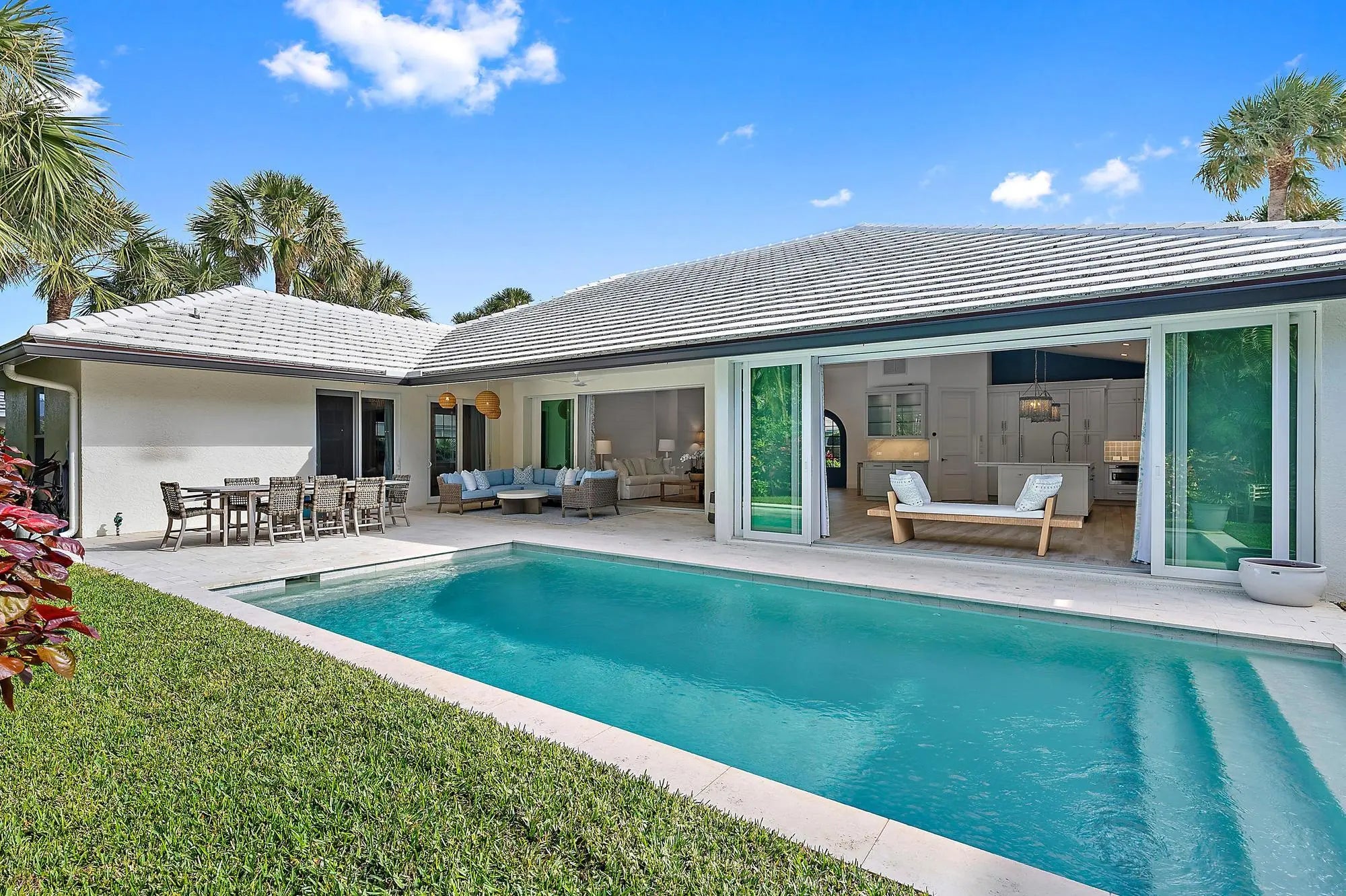 Enjoy your morning coffee and stroll to the beach. This elegant 3-bedroom, 3.5-bath home in the exclusive Jupiter Inlet Colony captures the essence of refined coastal living, where timeless design meets modern comfort. Soaring cathedral ceilings draw in abundant natural light, lending the open interiors an airy, inviting atmosphere. Stackable sliders open completely to the covered patio and heated pool, blending indoor and outdoor spaces for the ultimate coastal lifestyle — perfect for entertaining or relaxing in privacy. The chef-inspired kitchen is a true centerpiece, featuring a lighted marble island, custom cabinetry, premium gas appliances, and designer finishes that combine function with beauty. Every detail throughout the home has been thoughtfully curated from the bespoke built-ins and wallpaper accents to elegant lighting and window treatments. Outdoors, lush tropical landscaping, ambient lighting, and a mosquito control system make every evening feel like a getaway. Nestled within one of Jupiter's most prestigious seaside enclaves, residents of Jupiter Inlet Colony enjoy private beach access, an optional Beach Club membership, a private marina and yacht club, and a dedicated community police department offering luxury, serenity, and peace of mind in one of South Florida's most desirable coastal settings.Modern Enhancements: Recent upgrades include a brand-new garage door (3/24) and water heater (3/24), ensuring effortless comfort and reliability. Generous Dimensions: 2,654 sq. ft. under air and 3,374 sq. ft. total, situated on an expansive 105 x 90 lot. 240 single-family residences offers unparalleled privacy and exclusivity. Residents enjoy access to pristine, sun-drenched beaches and a wealth of lifestyle amenities, including: An optional Beach Club membership for social gatherings and relaxation. A private marina and yacht club, ideal for boating enthusiasts. A dedicated community police department for added peace of mind. Additional Up-Grades: Kitchen: Larger Island (including larger sink) New appliances: refrigerator, dishwasher, wine cooler, refrigerated drawers Lighted marble island countertop Countertops Backsplash Island sconces Custom built in Bar with lighting Custom Built ins with bookshelves and drawers Wallpaper Hardware Draperies and Shades Laundry Room: Washer/Dryer Custom built ins Hardware Living Room/Entry: Chandlier Shiplap Drapes Powder Room: Custom built ins Mirror Scounces Wallpaper Counter top Faucet Toto toilet Hardware Bobby Bedroom/Bathroom: Closet built ins Draperies/shades Wallpaper Shower Door Toto Toilet Roeburn medicine cabinet Mia's Bedroom: Chandlier Wallpaper Draperies/Shades Mia's Bathroom: Built Ins Mirror Wallpaper Plantation Shutter Faucet Toto toilet Countertop Master Bedroom: Closet CA Closets Wallpaper Draperies Master Bathroom: Wallpaper Built Ins Hardware Marble Countertop Faucet Toto toilet Shower door Water Heater Scounces Mirror Robern Medicine Cabinet Garage: Floor Built In Cabinets Insulation Tankless Water Heater Split A/C Garage Door Hot water sink Outside: Lighting on front of house Pavers on side of house Mosquito System Two a/c units Ceiling fan Back porch wicker chandeliers
