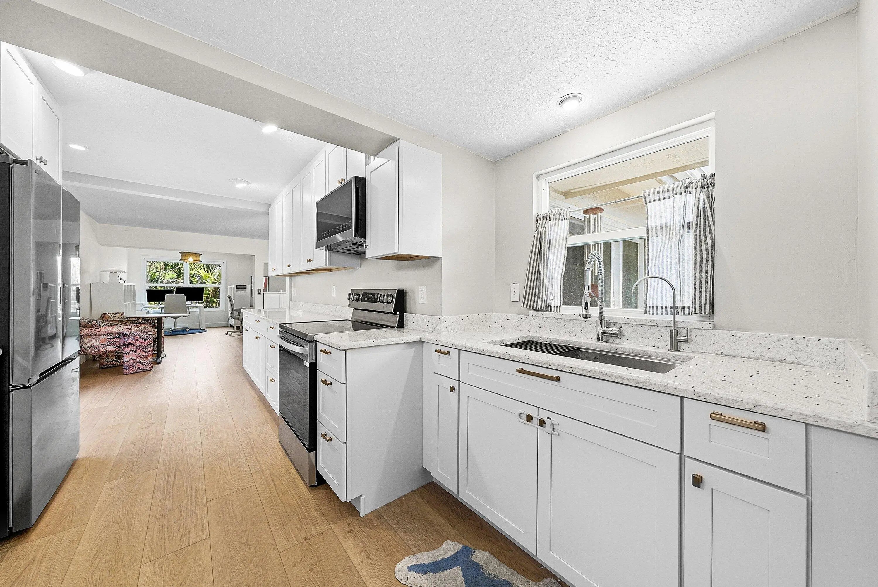 Stunning 3BR/2BA residence in East Boca with NO HOA! Updates include a brand-new kitchen featuring custom white shaker cabinetry with plentiful storage, exquisite white granite countertops, and premium LG appliances. The expansive living area features luxury vinyl plank flooring that flows seamlessly throughout the entire layout. The primary suite is a private retreat with a large walk-in closet, a modernized en-suite bathroom, and French doors that open to the tropical backyard oasis with pool. The second bedroom also allows for direct patio access, while the spacious third bedroom includes its own updated en-suite bath and a walk-in closet with exceptional storage. Other highlights include a tranquil enclosed atrium off the dining area, a wood-burning fireplace, and a dedicated laundry room under air with new LG washer & dryer and floor-to-ceiling cabinetry. Enjoy total peace of mind with new water heater (2025), AC (2024), and impact-rated windows. Located a mile from the beach and minutes to Mizner Park, Atlantic Ave in Delray and I-95 in an A-rated school district. This residence combines modern luxury with an unbeatable location. Schedule your private tour today!