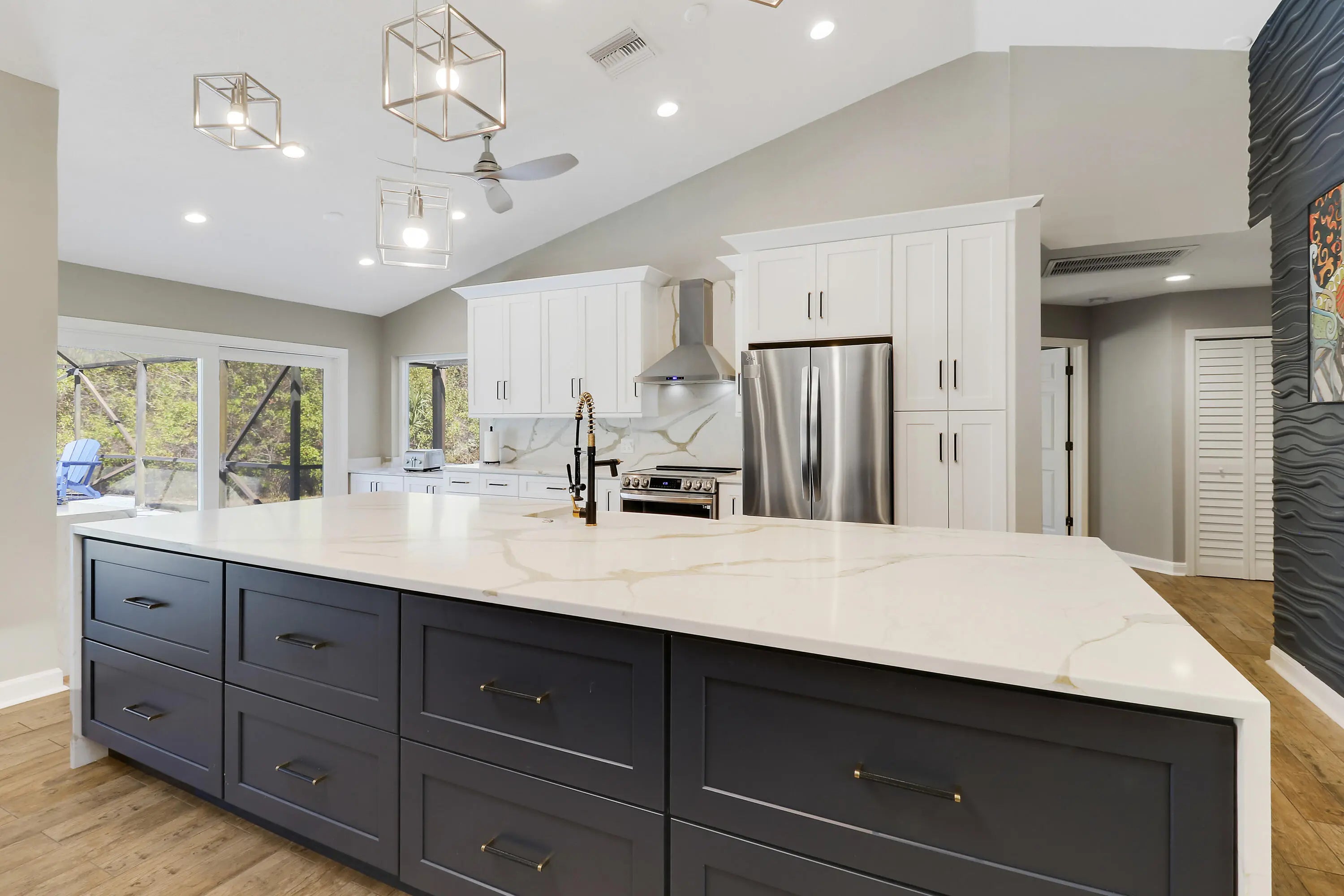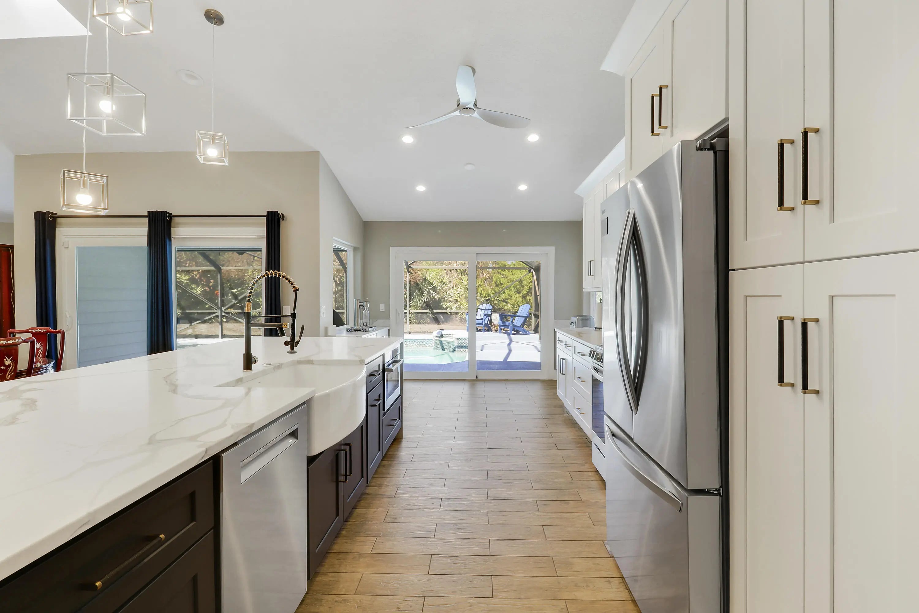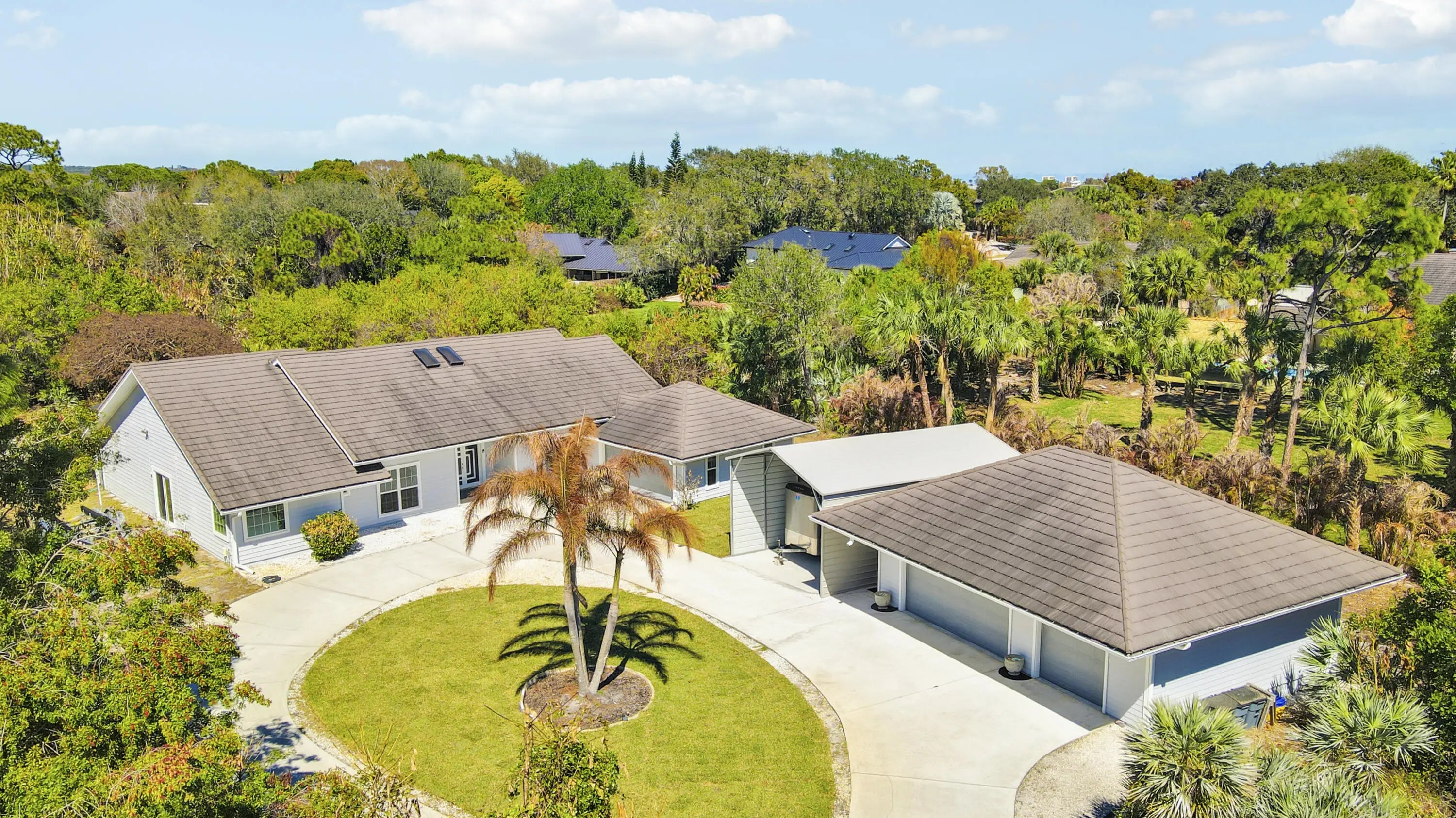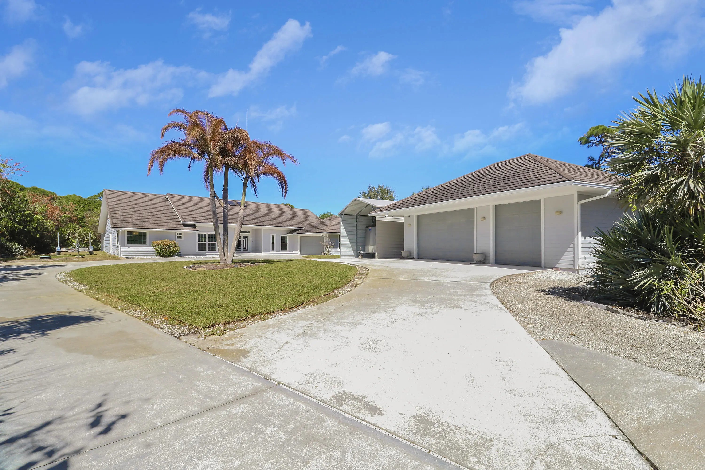 Welcome to your own private compound in Sugarhill, one of the most sought-after communities in Jensen Beach. Spanning over 2,837 square feet, this beautifully updated home features a spacious new gourmet kitchen with abundant counter space, perfectly positioned to overlook a functional open floor plan ideal for everyday living and entertaining. The residence offers four generously sized bedrooms, two and a half updated bathrooms, and a two-car attached garage + plus an impressive additional three-car air-conditioned building/workshop. Filled with natural light, the home showcases designer accents and tile flooring throughout, creating a bright and cohesive living space. Step outside to enjoy your own private retreat featuring a large patio, sparkling pool with water feature and 1.1 acres