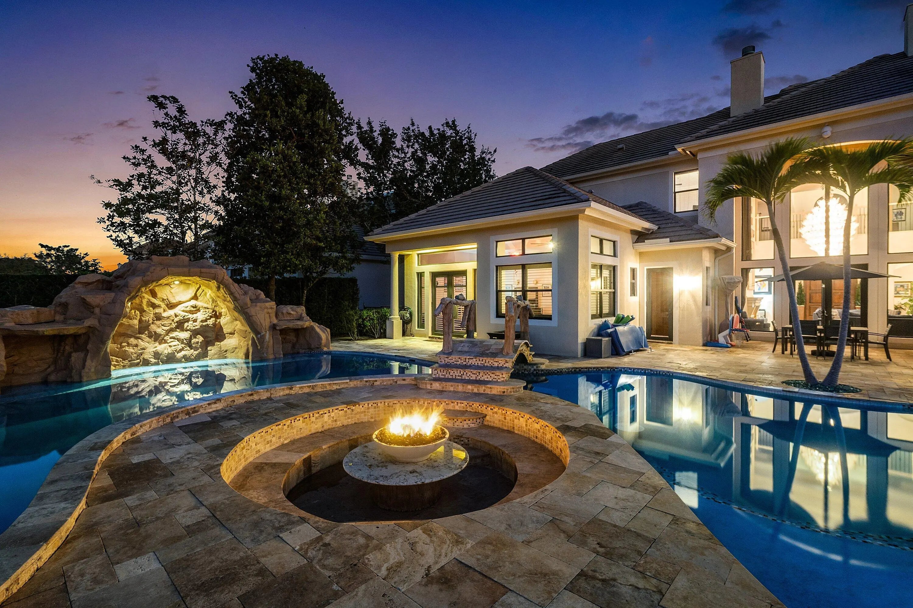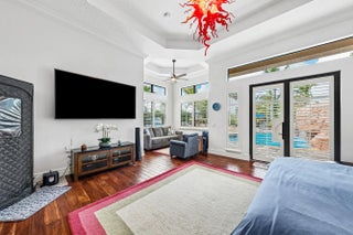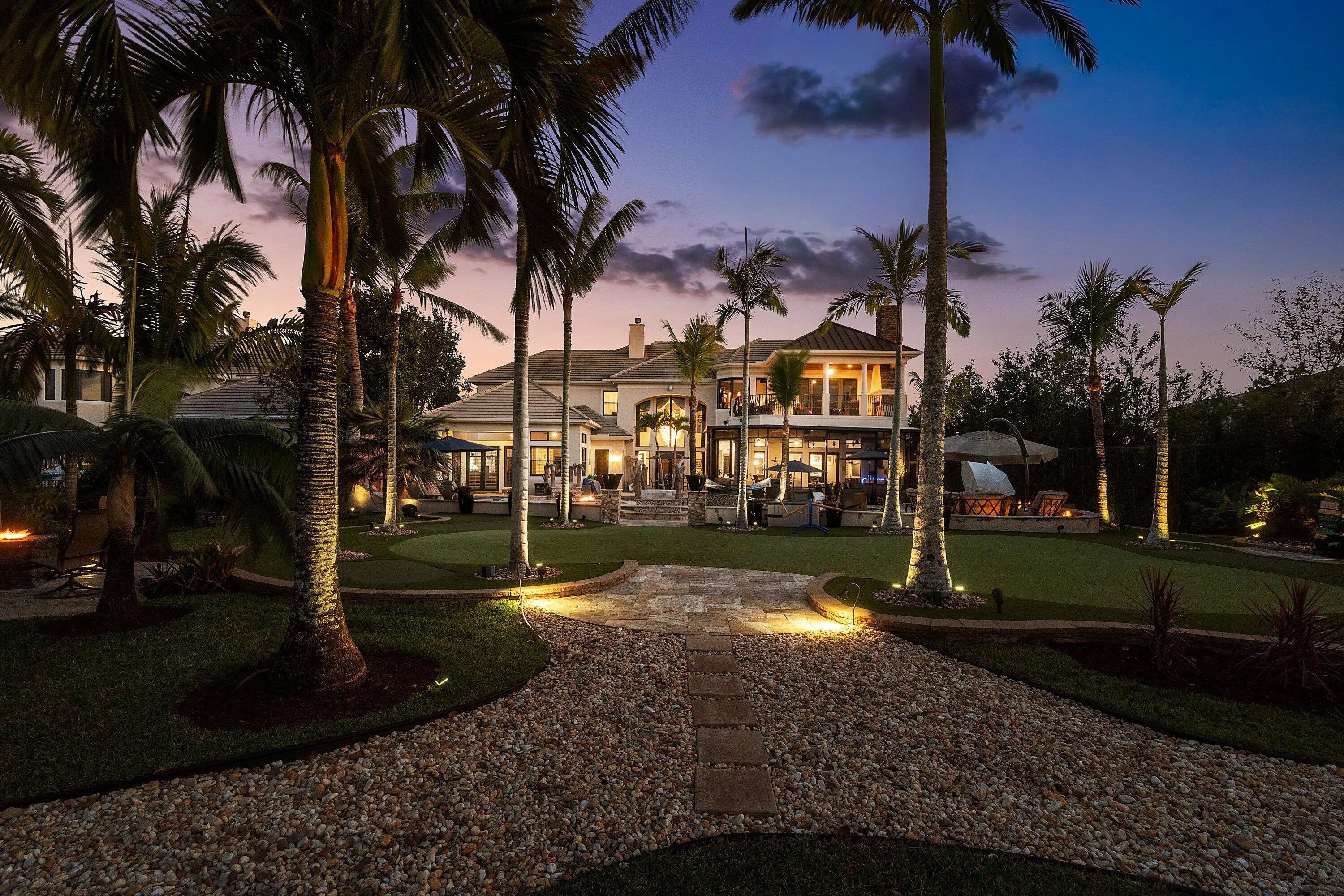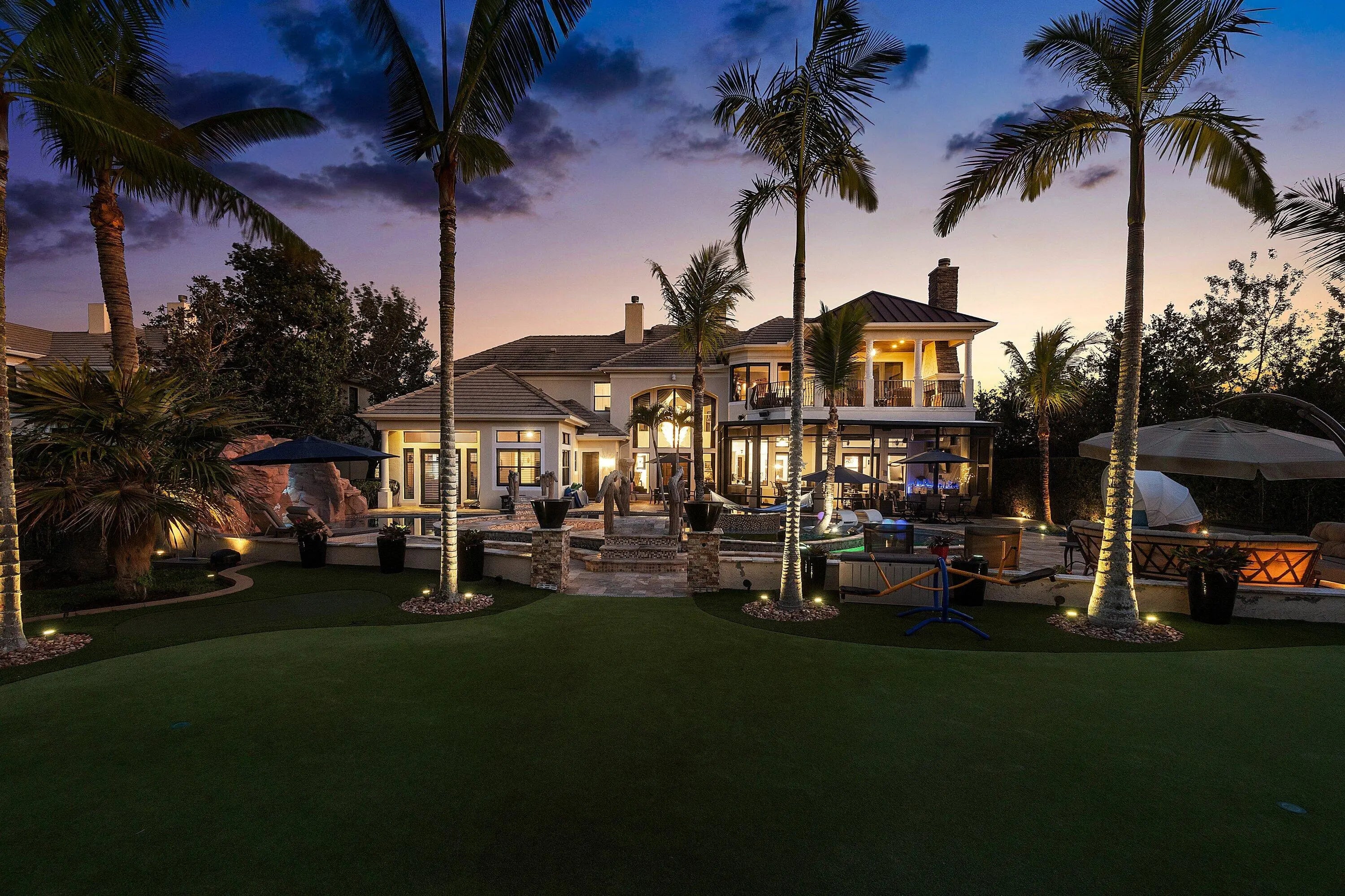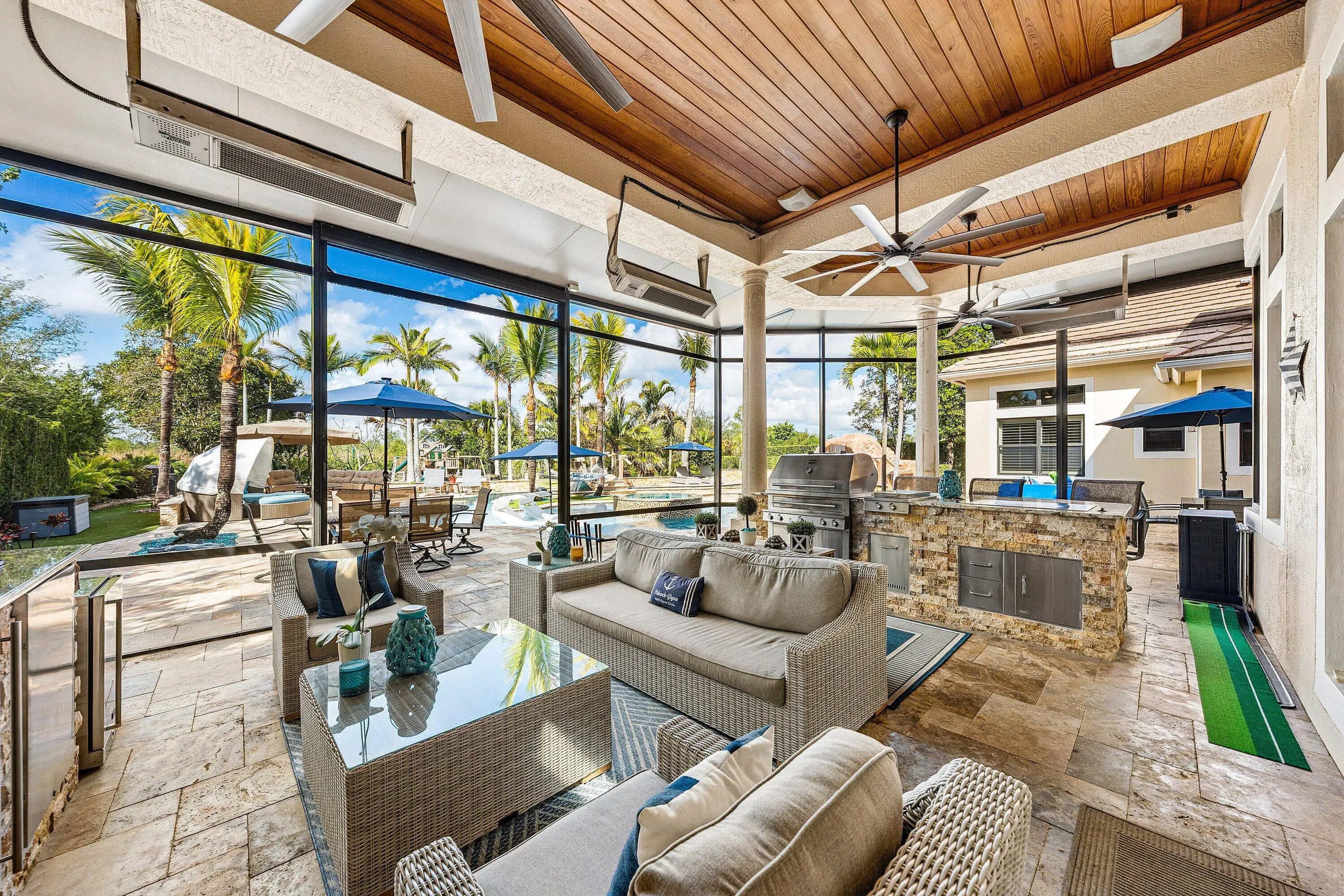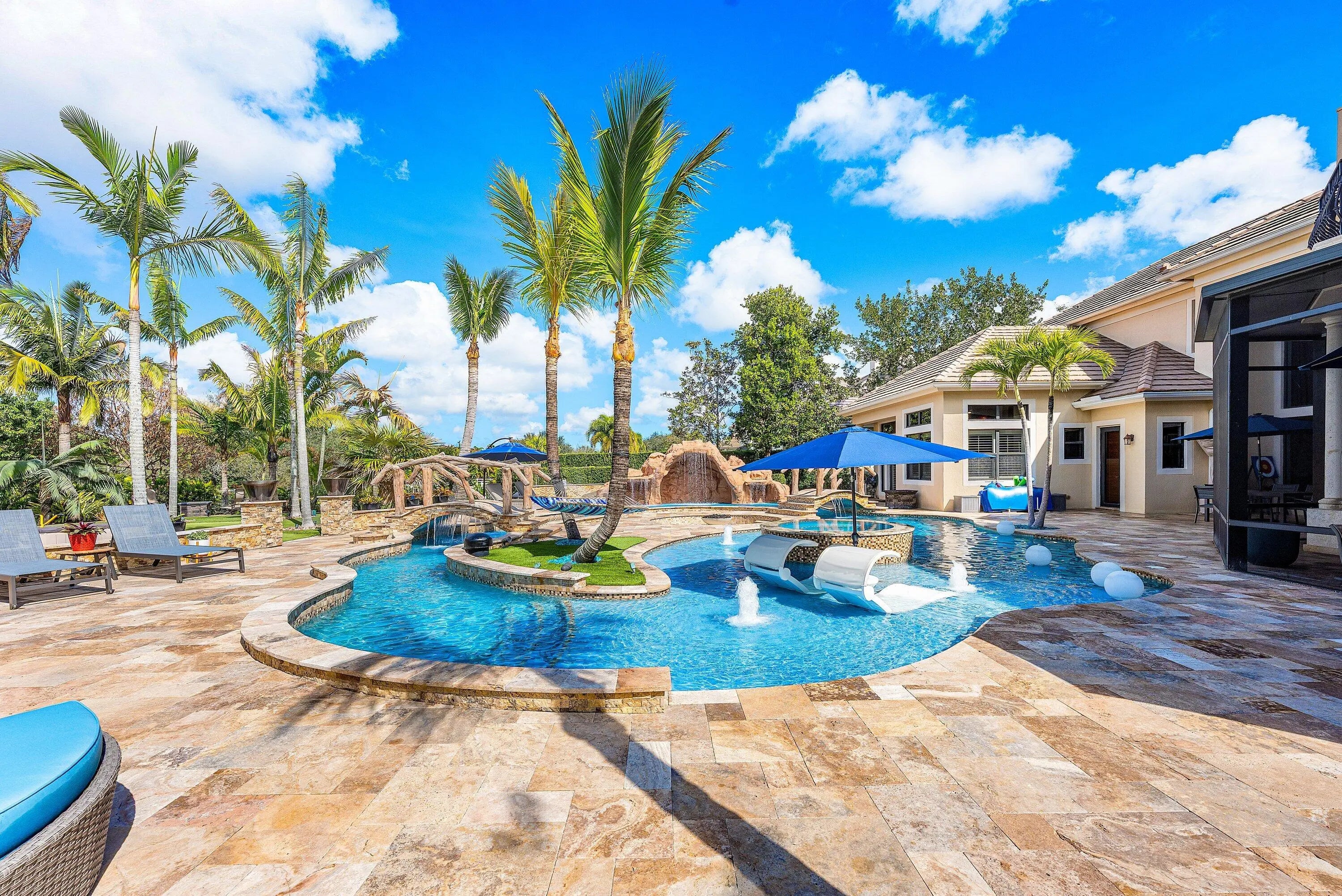 Rarely available 6,245 SF estate with 5BR, 7.5BA, & 4-car garage. Private courtyard entry leads to travertine floors and dramatic 2-story living room overlooking resort style backyard. Featuring antique Murano chandeliers the Dining room opens to courtyard. Chef's dream kitchen with 11x7 underlit quartzite island, coffered ceiling, 6-burner gas range, Wolf microwave/steam oven, warming drawer, dual Asko dishwashers, Sub-Zero and island fridge drawers. Screened summer kitchen with Kalamazoo hybrid grill, teppanyaki flat top, bar, kegerator and TV. Saltwater lazy-river pool with grotto, swim-up bar, waterfalls, sunken fire pit, spa and cabana bath. Sonance landscape audio, Golden Bear putting green and so much more! 2nd floor has oversized theater/media/game room & bar. 4 addl Bedrooms. Your next home rivals a private resort, this exceptional estate delivers an extraordinary lifestyle centered around an unforgettable backyard experience. A dramatic lazy river pool winds through the property beneath two decorative bridges, flowing past waterfalls and bubblers before gathering around a striking fire feature. Beyond the pool, a private putting green and beautifully landscaped grounds create a secluded retreat designed for both relaxation and entertaining. Evenings come alive in the expansive outdoor living areas featuring a fully equipped Kalamazoo summer kitchen with gas burners, flattop cooking surface, beverage refrigerator, and a three-tap kegerator. A wood-burning fireplace with gas ignition, gas heaters, and motorized enclosure screens allow the space to be enjoyed year-round. Inside, the home combines sophisticated design with cutting-edge comfort. Handcrafted Murano glass chandeliers illuminate the great room, hallway, and primary suite, highlighting architectural elements such as curved walls, soaring vaulted ceilings, and custom plantation shutters throughout. The chef's kitchen is appointed with Sub-Zero refrigeration, GE Monogram gas cooking, Wolf microwave, steam oven, warming drawer, and dual Asko dishwashers, complemented by illuminated marble counters and hidden charging stations. A dedicated Sony 4K projector theater room with a full wet bar and app-controlled blackout shades creates a true cinematic experience at home. The primary bath was completely remodeled in 2024, with two additional upstairs bathrooms updated in 2025, offering a fresh modern aesthetic. Behind the scenes, the property is equally impressive with Generac Natural gas generator (runs whole 1st floor), Carrier HVAC systems with Reme Ionic air purification, RainSoft whole-house water filtration, Lutron smart lighting, Sonos multi-zone audio, Luxor landscape lighting, ADT security, and full camera monitoring. Additional enhancements include saltwater pool upgrades, gas pool heater, upgraded attic insulation, newly sealed driveway and walkways, updated garage systems, fresh landscaping, and a Gorilla playground. Every element of this remarkable residence has been thoughtfully curated to create a private luxury retreat designed for unforgettable living and effortless entertaining. Community has a 7,000 Clubhouse with Athletic Center, 2 Har-Tru Tennis Courts, Tot Lot, Billiard Room, Party Room, Swimming Pool, Hot Tub, Fire Pit & BBQ Grill.