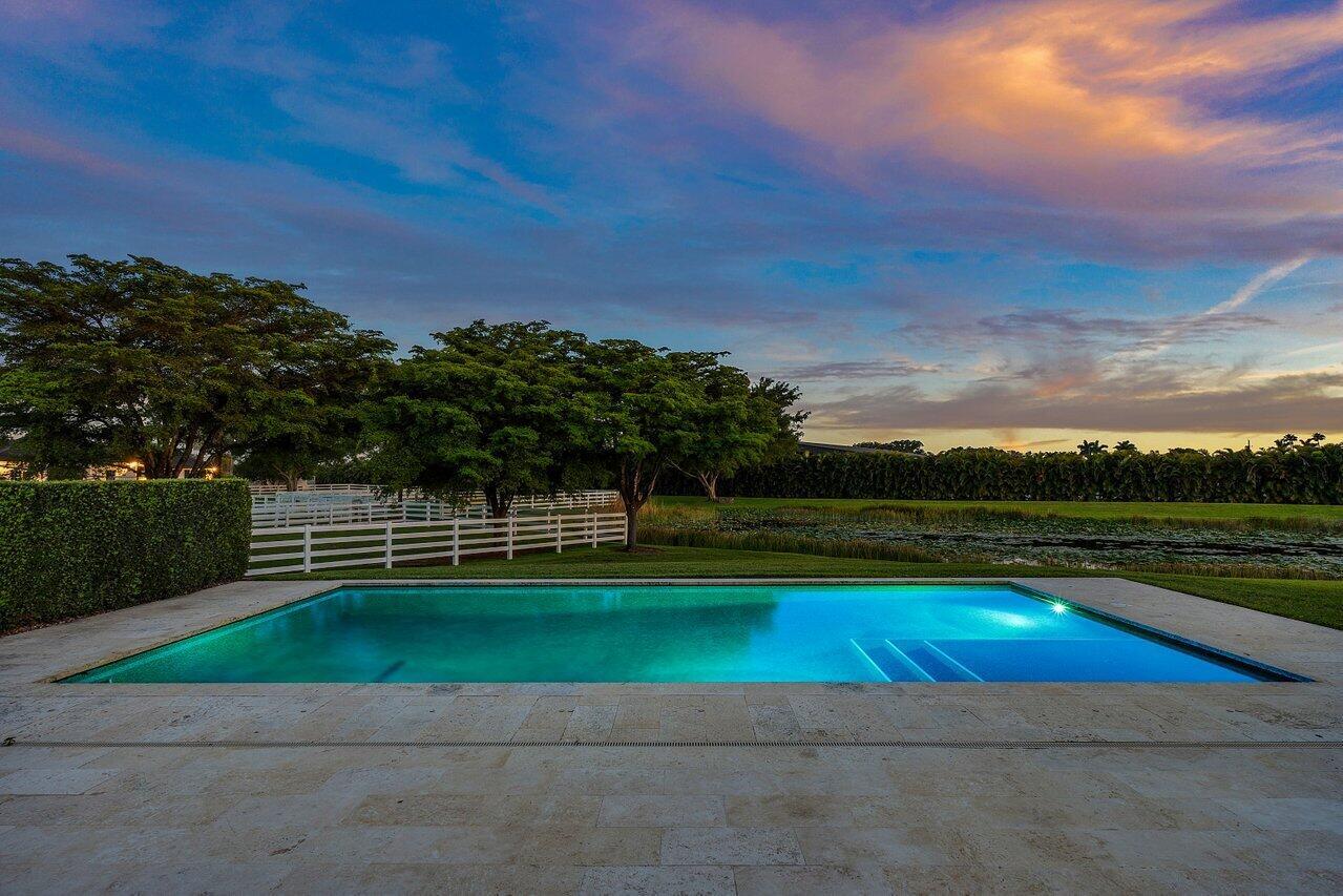 Discover this exquisitely designed estate, featuring a private 28-stall barn, a lush Grand Prix grass field, a covered arena, an outdoor ring, a Euro-walker, and a round pen, all nestled on 8.85 acres of beautifully manicured land. Perfectly located just minutes from WEF, Global, and IPC competition venues, this property is a dream for equestrian enthusiasts. The barn is thoughtfully designed with two mirror-image wings, each offering 8 wash stalls, 2 tack rooms, 2 feed rooms, 2 laundry rooms, 2 kitchens, 2 bathrooms, and 2 storage rooms. The elegant 4-bedroom residence includes an office and features an open-concept great room with a center-island kitchen, a professional gas range, quartz countertops, a stunning glass-enclosed wine cellar, and beautiful wood floors throughout.The covered arena is equipped with an advanced underground ebb-and-flow watering system, a viewing platform with a center-island bar, a workout room, and extra garage storage at the west end. This income-producing property includes three gated entrances and a circular driveway at the barn, ensuring easy access and ample parking for trucks, trailers, and vans. OTHER FEATURES: Wood-burning fireplace Spa tub in the primary bedroom suite Gas-heated, saltwater pool Summer kitchen Central vacuum system 230' x 90' outdoor arena, expandable Large turf Grand Prix jumping field 60' round pen 6-horse walker 7 grass turnout paddocks Irrigation system from well Generator hookups at the house and stable RO water treatment system for house and stable AT&T Internet DirectTV 4 wash stalls on the North end of the barn with new flooring 2 wash stalls on the south end of the barn with new flooring New mats in the hot walker New pavers and drains both the North and South entrance as well as the entrance to the arena New pavers at the North and South entrances of the barn New pavers at entrance to the hot walker New poured concrete at the manure bin New poured black top at the maintenance garage Diesel and regular gas tanks for farm equipment New irrigation pump All stalls have new mats Newly painted shutters, gutters, arena columns, and gates.