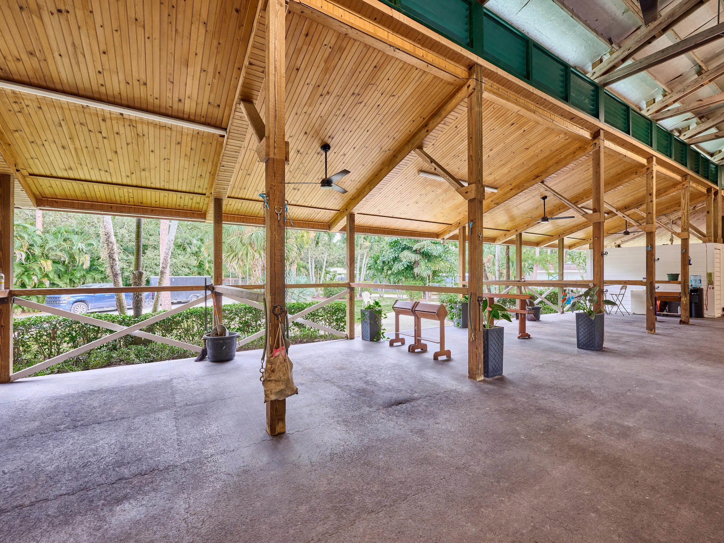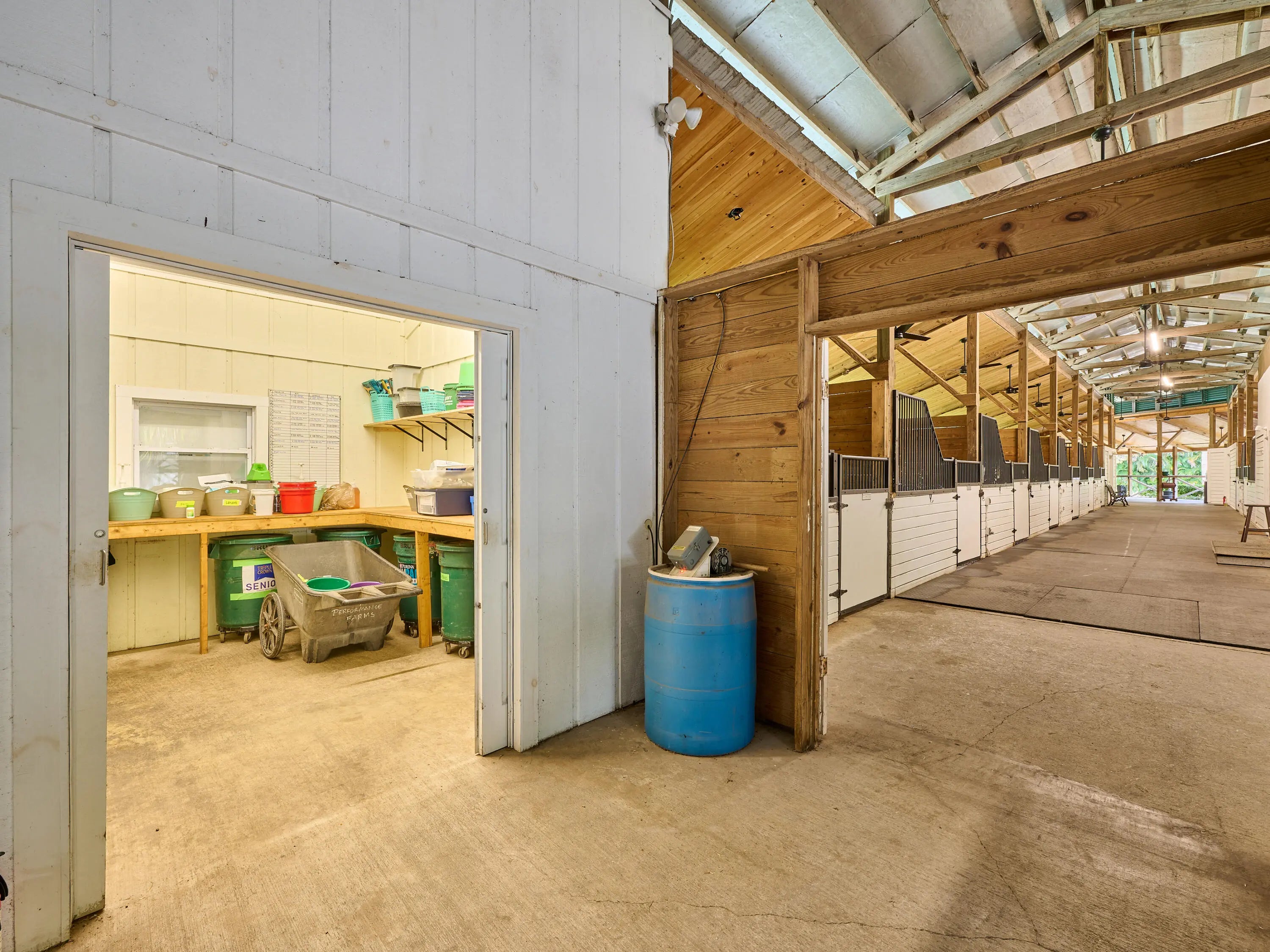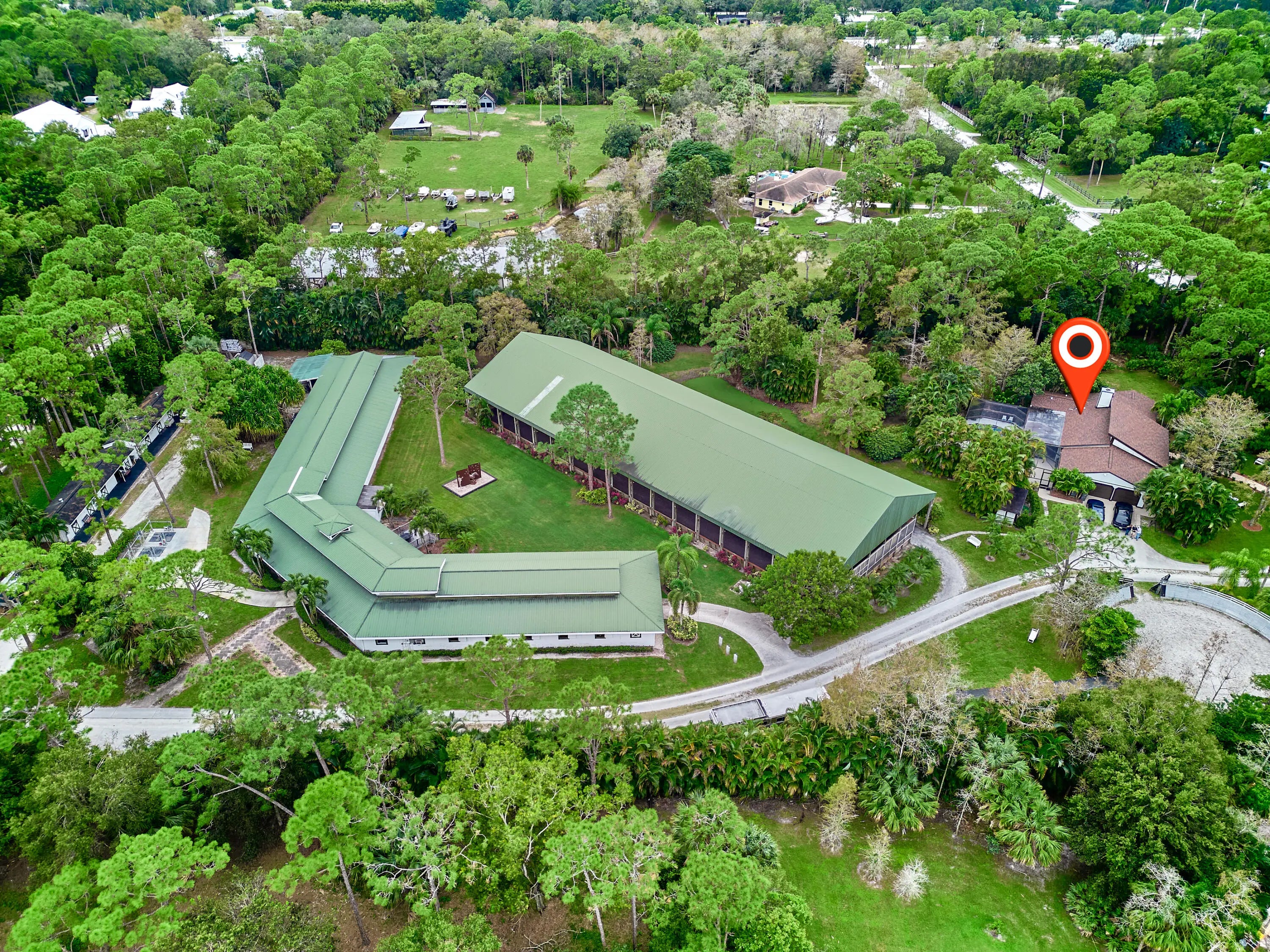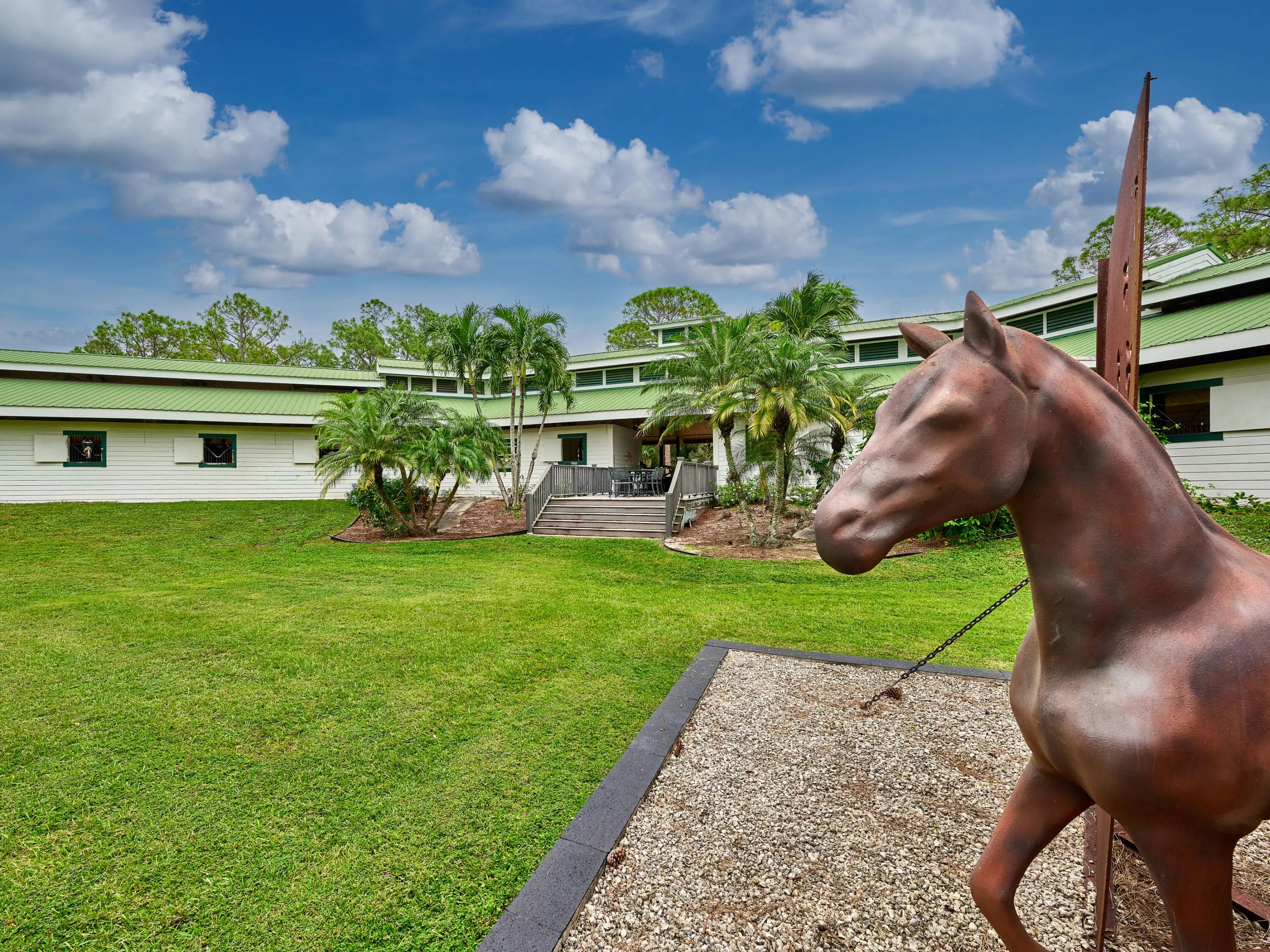 21-Stall + Jupiter Farms Equestrian Estate | Arena + Trainer Apartments. Looking for privacy and acreage in Jupiter Farms where you can live and work with your horses? Welcome to 18238 128th Trail North, Jupiter, FL 33478 -- a one story single family home designed for an equestrian/farm lifestyle featuring barns, training arenas, and rider and trainer quarters on site.This mid century modern home offers 3 beds, 3 baths, and 2,182 sq ft with vaulted ceilings, clerestory windows, tile floors, fireplace, and updated kitchen with granite. Two ensuite baths add comfort. Step outside to a screen enclosed pool and fenced 4.54 acres. The 11,000 sq ft stable includes a 21 stall center aisle barn with wash racks, tack room/office, 4 studio apartments, plus additional 3 stall barns. The 4.54-acre property boasts breathtaking grounds, including stables, paths and a phenomenal 14,000 under-roof sqft, cushioned, regulation dressage/riding arena with newly installed HUGE ceiling fans to keep horses and owners COOL on hot day s! Horse lovers, welcome to paradise with an 11000 sft. 20 spacious stall stable featuring 1 main apartment, freshly remodeled with a contemporary living area, full kitchen, luxurious bath, and a lovely screen enclosed porch. The stable is also home to 3 additional rider rooms with full baths, 3 tack rooms, feed room, laundry room and additional community full bathroom. All stalls equipped with ceiling fans and rubber mats to keep your equine family cool and comfortable. There are multiple cold water wash racks with seperate grooming spaces. Manage all of your needs or lease individual spaces for income! There are 3 additional REMOVABLE barn sections, one with 3 stalls and space for tack room, another with 2 stalls and tack room and tool room and a third with 3 stalls and a space for tack next to it. The roofs of these stalls have been updated in the past 4 years. This unparalleled estate offers plenty of room for animals, yours and boarders, 2 turnouts which are expandable and/or reconfigurable, and so much more. 2 wells, 2 septic tanks, and 2 generators (one for the home and one for the barn), you'll have everything you need. PLUS, a new roof on the single family home in June of 2024! The property is fully functional, fenced and gated, ensuring privacy and security in this idyllic community known as "The Farms." The property access is impeccable from 128th Trail to 127th Trail, no turnaround required and securely gated at both points. Jupiter and the nearby Riverbend Park (a 7minute ride away) offer scenic riding trails. You can ride through peaceful woods, along riverbanks, or nature preserves. Equestrian parks in Palm Beach County also provide trails for riders of all levels. Jupiter is 40 minutes from Wellington, the "Winter Equestrian Capital of the World," home to top-tier events like Winter Equestrian Festival, one of the largest and longest-running equestrian events in the world and the Global Dressage Festival a premier event for dressage riders showcasing world-class performances as well as a hub for polo matches. Equestrian properties in Jupiter combine rural charm with modern conveniences offering a relaxed lifestyle while being close to beaches, restaurants, and shopping. Owning horses in Jupiter combines a fantastic lifestyle with the perks of equestrian living, natural beauty, community, and premier facilities, making it an ideal location for horse enthusiasts. This amazing property truly has something for everyone, whether you're an equestrian enthusiast, investor, prospective business owner or looking for a unique retreat! To truly appreciate all this property has to offer, you must see it for yourself! This incredible property offers the best of all worlds. Reach out today and schedule your private tour of this surprising residential property, aspiring new business opportunity or investment property. Single Family Home is 3BR/3Full Baths, 2182sft. under air. Additional living square footage in stable: (1955sft.) and baths (5) in stable and under a/c (3 studio apartments and 1 1BR Full apartment with living, kitchen bedroom and screen enclosed porch). The Perfect Price for Your Perfect Place. Call now to schedule your private tour.