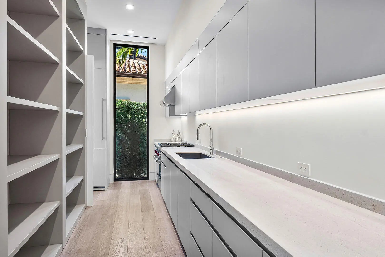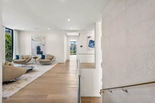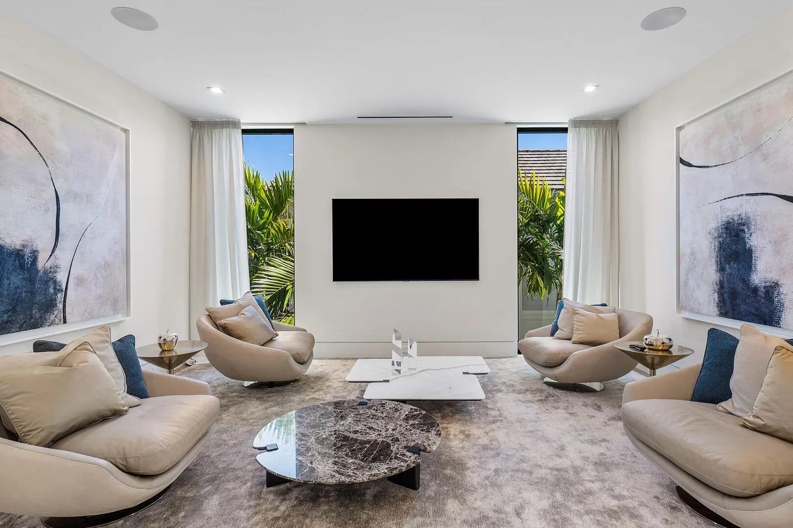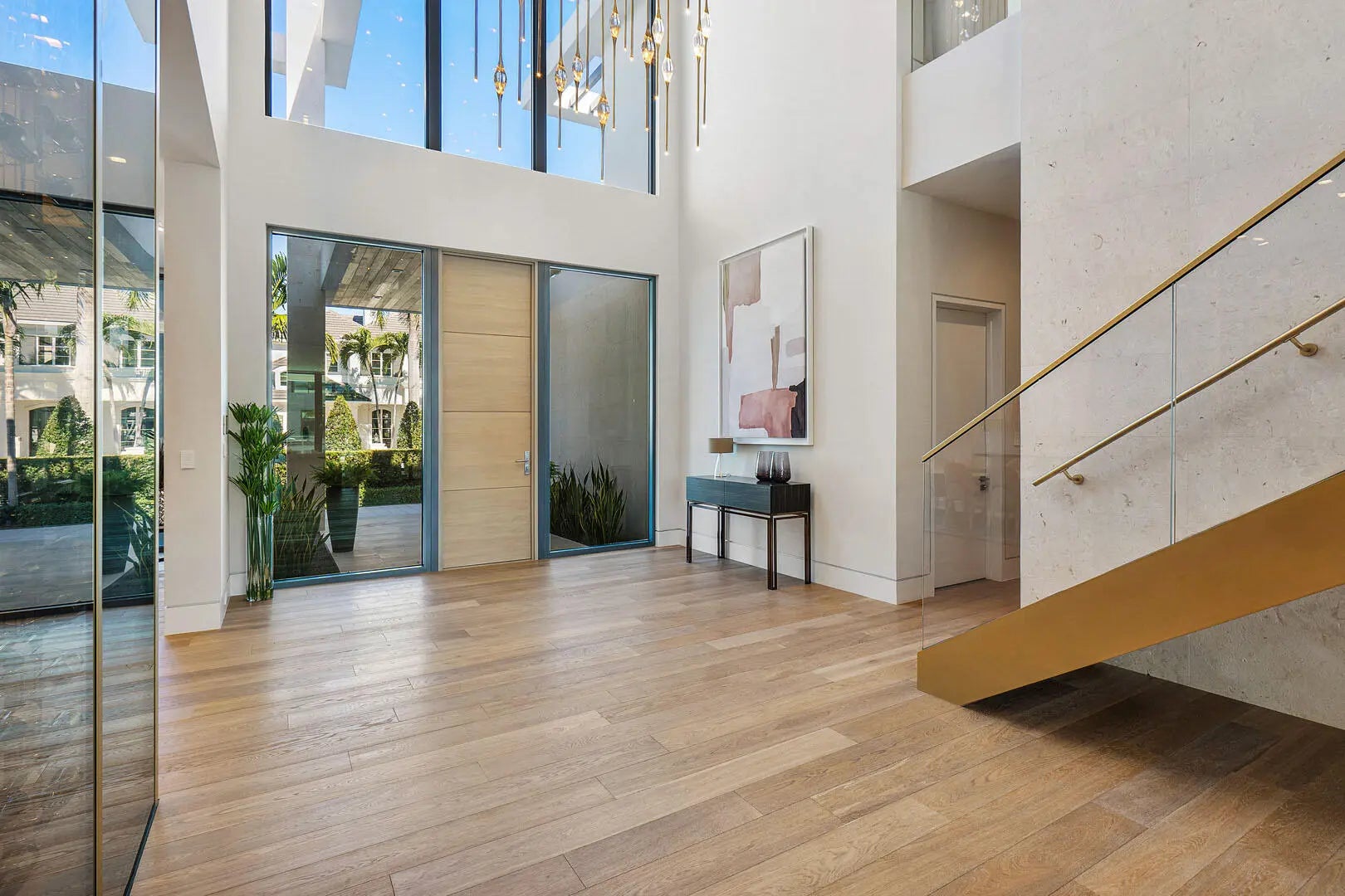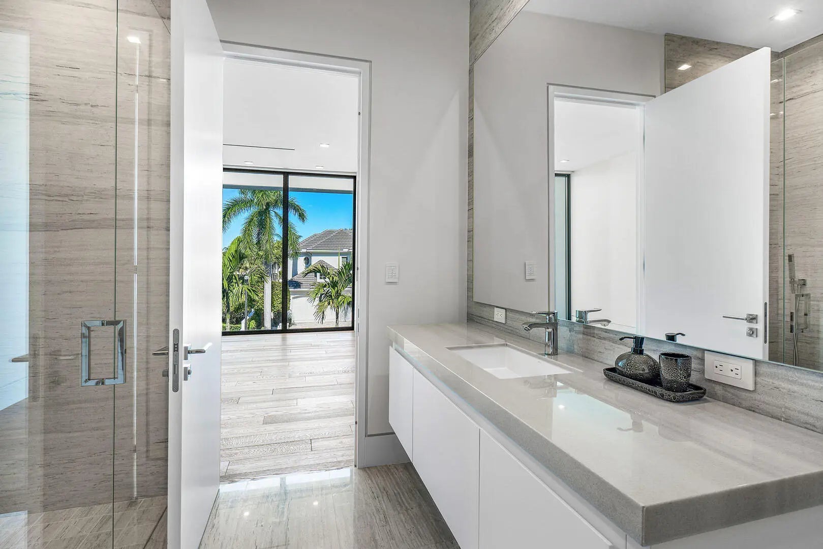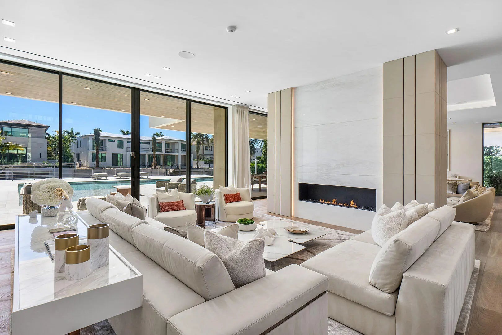 Experience the pinnacle of waterfront luxury in Royal Palm Yacht & Country Club. This extraordinary estate is masterfully crafted by the acclaimed Sarkela Corporation and Ada Architecture Design Atelier. Encompassing over 9,500 square feet of living space, this architectural masterpiece offers six bedrooms, seven full bathrooms, and two half bathrooms, all impeccably designed for unparalleled sophistication and comfort. Every detail of this home reflects the highest level of craftsmanship and quality. The interiors showcase hand-finished DuChateau premium oak hardwood floors, sleek Italian cabinetry, and elegant European marble in the kitchen and baths. Dornbracht bath fixtures and Terzani lighting installations elevate the ambiance, creating an atmosphere of refined elegance.