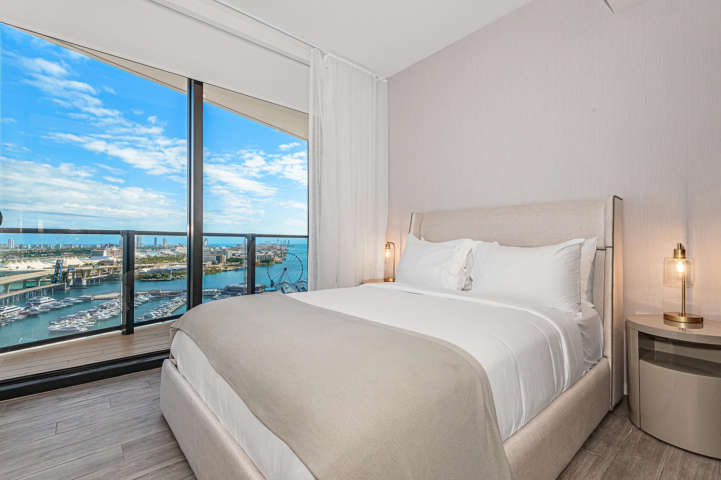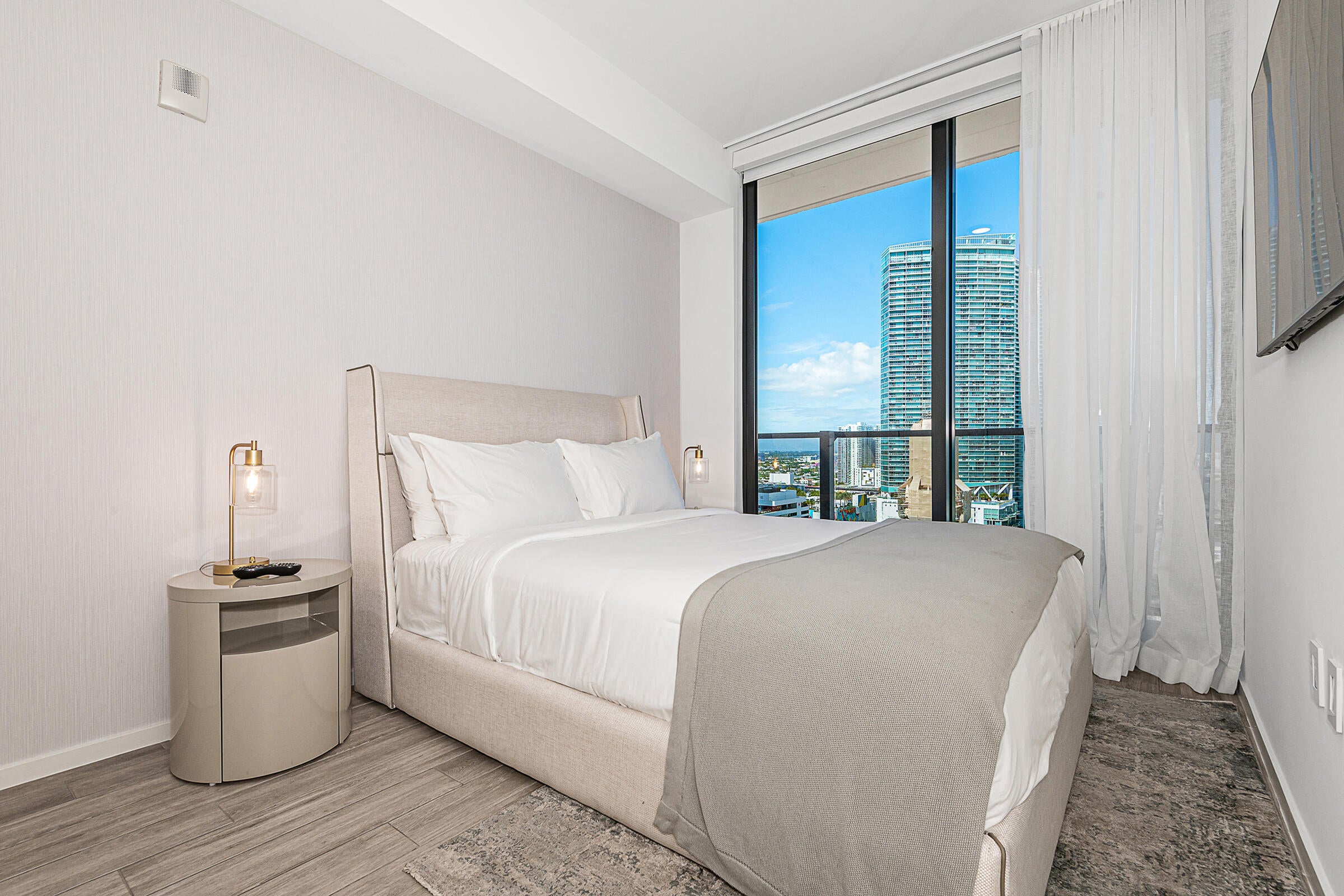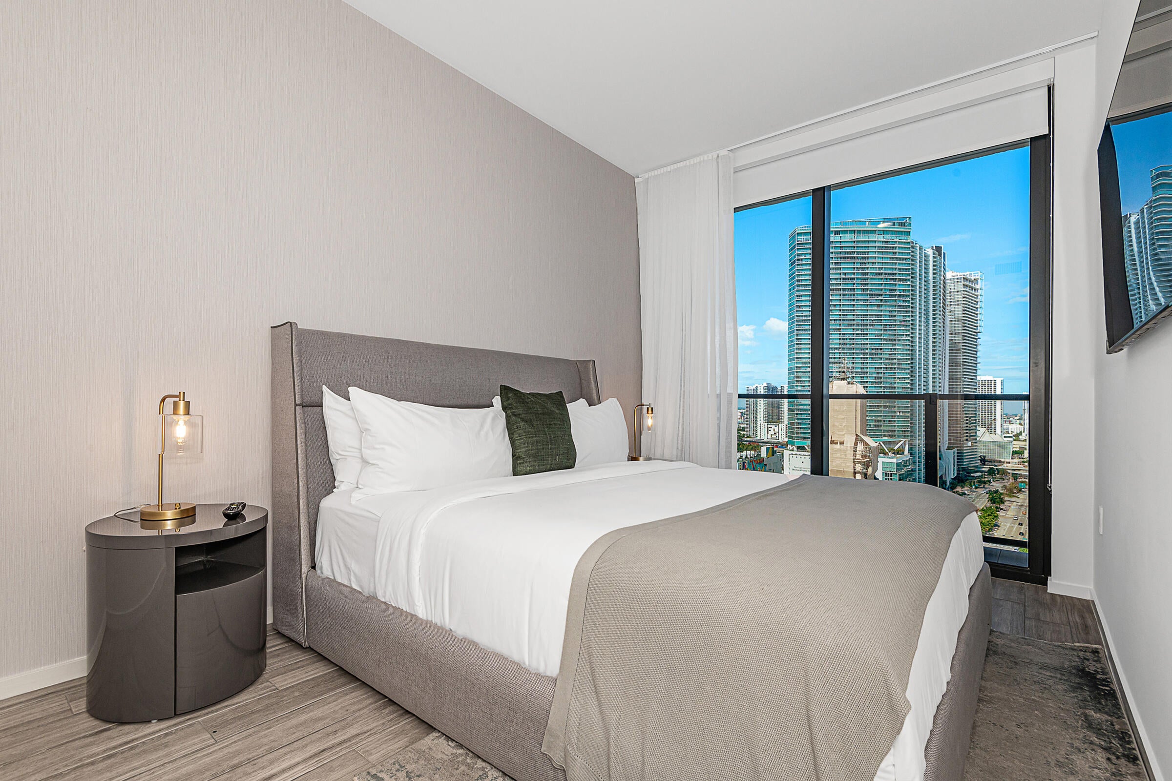 Experience luxury living at The Elser, where style meets comfort. This fully furnished condo features sleek modern furniture, a flat-screen TV, a king-size bed, and a pull-out couch for extra guest space. Enjoy smart living with a thermostat and keyless entry, and soak in breathtaking views of downtown Miami and Biscayne Bay from your high-ceiling unit adorned with designer touches.Amenities include 24/7 concierge service, a wrap-around pool, two-story gym, valet parking, sky lounge, grilling terrace, and more. The Elser's prime location provides easy access to the Kaseya Center, Bayside Marketplace, major roadways, Port of Miami, parks, and public transit.