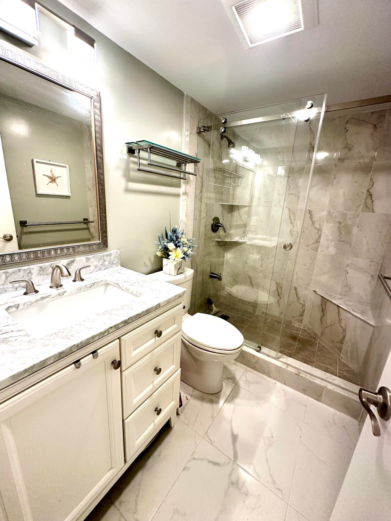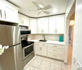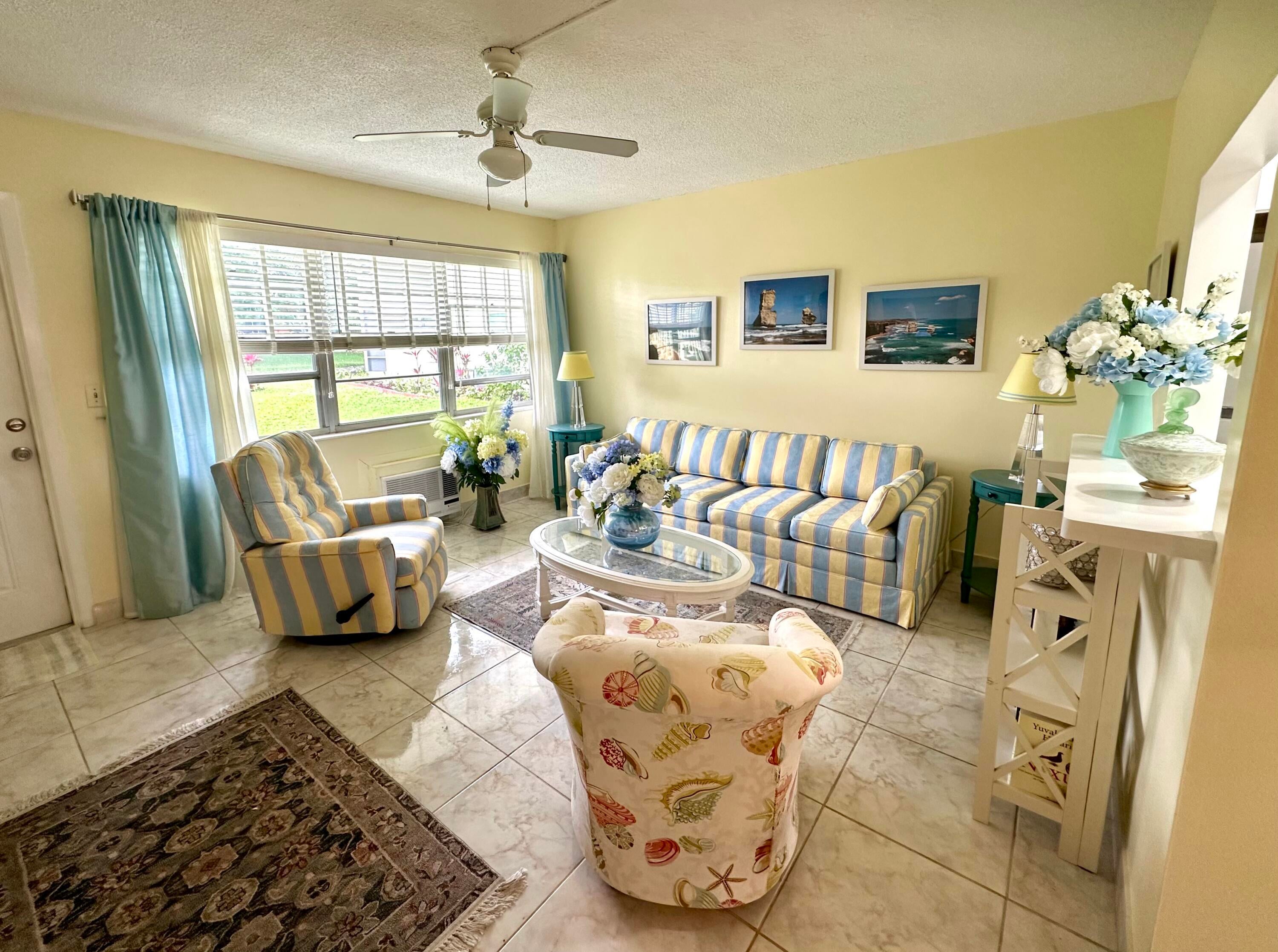 Welcome to your corner of paradise! Enjoy this light, bright and fully updated turnkey treasure in a timeless Coastal style In Century Village 55+ community. This fully furnished 1 bed is ideally located on the first floor overlooking one of the nicest gardens as well gorgeous water views .The condo features a pristine new modern kitchen with quartz countertops, recessed lighting, ceiling fan, new stainless steel appliances, and new hot water heater. New bathroom.Slate floor in screened in patio adds another level of quality to this charming one-of-a-kind condo lovingly designed. The building was freshly painted. New roof was just installed leaving the association with a healthy reserve.Walking distance to Hastings pool, fitness center, main clubhouse and houses of worship. Century Village, a 55+ community, offers many amenities of resort style living, with a large theatre, indoor and outdoor pools, elaborate fitness center, tennis, pickle ball, bocce ball courts, card rooms, pool rooms, meeting rooms, boating, courtesy bus service, and much more. Activities of all kinds make life here a healthy experience. Ideally located close to PBI airport, restaurants, shops and beaches.