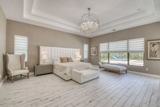 A private resort-style backyard oasis with pool, spa, sun shelf, and waterfall sets the tone for this pristine 2020-built Prado estate on over half an acre. Offering 4 bedrooms and 3,570 sq ft, this contemporary Mediterranean home features soaring 12-14 ft ceilings, reclaimed wood-look tile, an enormous great room and dining area framed by 10 sliders opening to the lanai, and a gourmet kitchen with quartz countertops, an oversized island, Cafe appliances, a Bosch dishwasher, Restoration Hardware pendants, and an incredible 8x12 walk-in pantry. The primary suite is a true retreat offering direct lanai access, two walk-in closets, and a luxurious spa bath with quartz vanities, soaking tub, and oversized spa shower. Prado is a serene gated community with lakes and preserve views, just minutes