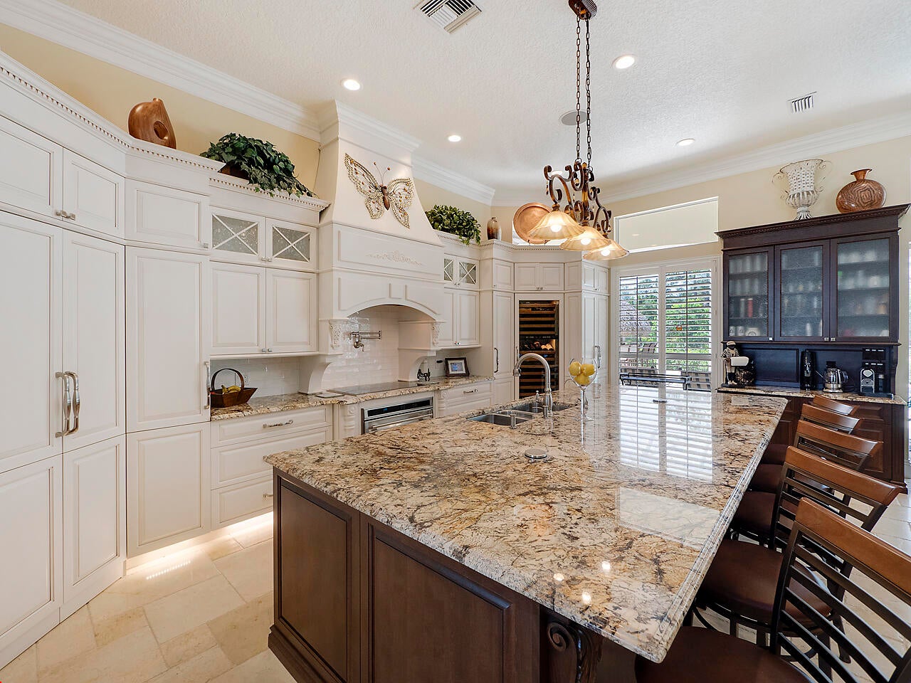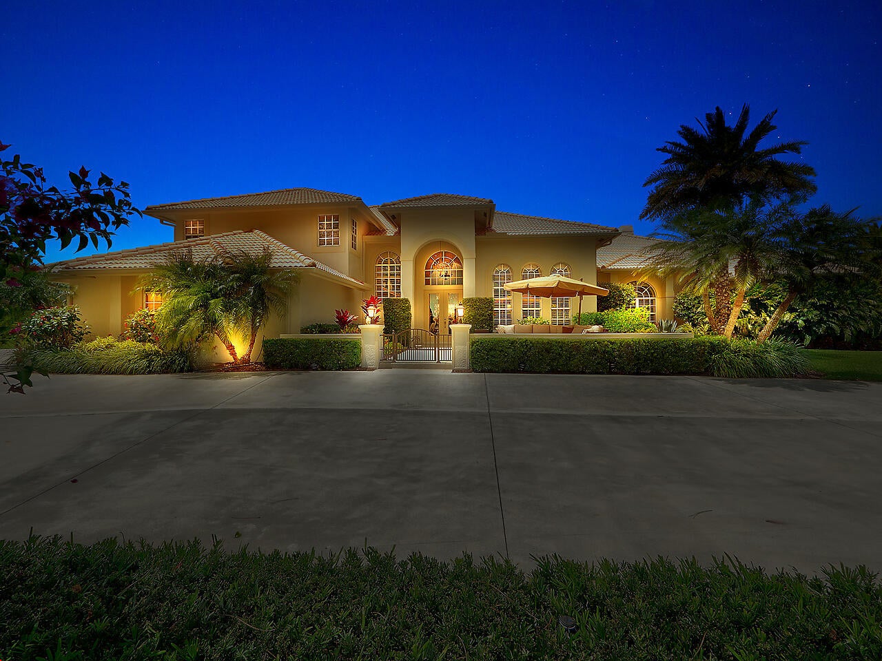 Estate home located in the prestigious community of PGA Village. Found in the Sabal Creek subdivision, this 2 story Mediterranean is situated on 1.7 acres. Property has a main house and an attached guest house, 3 car garage and large circular drive. Entire residence impeccably finished. French Cut Crema Marfil Marble flooring throughout, custom trim, crown molding, plantation shutters, 4000 SF main living quarters consist of 5BD and 3BA. Dramatic 2 story formal living room. Large dining room. Family room opens to a true chef's kitchen. State of the art appliances, custom cabinetry and a 6'x12' granite island. Adjoining Guest house complete with full kitchen, living room, 2BD and full BA. Large Screened Pool area with Tiki bar and covered Loggia. Grand home. Premier community. Paradise.