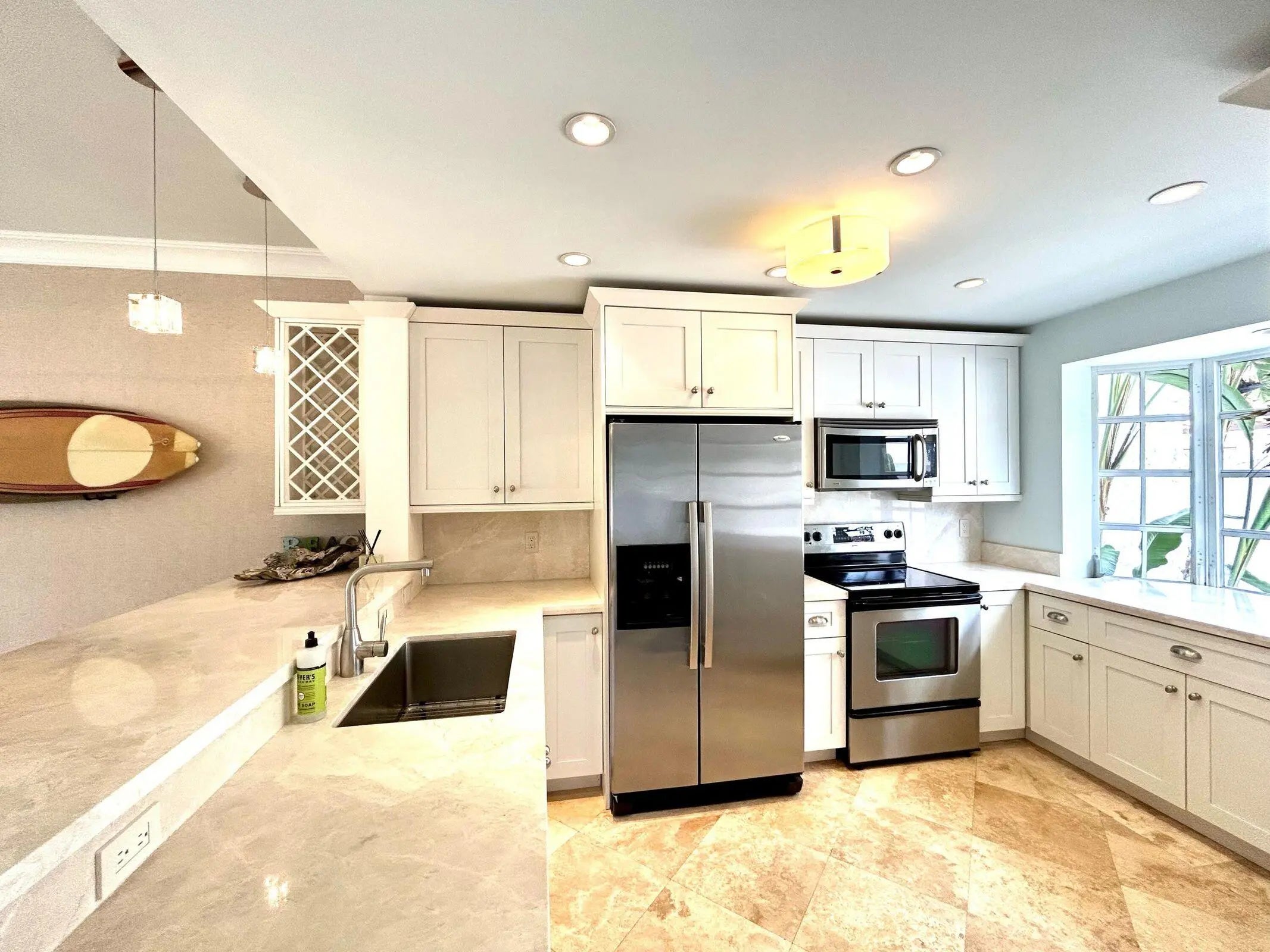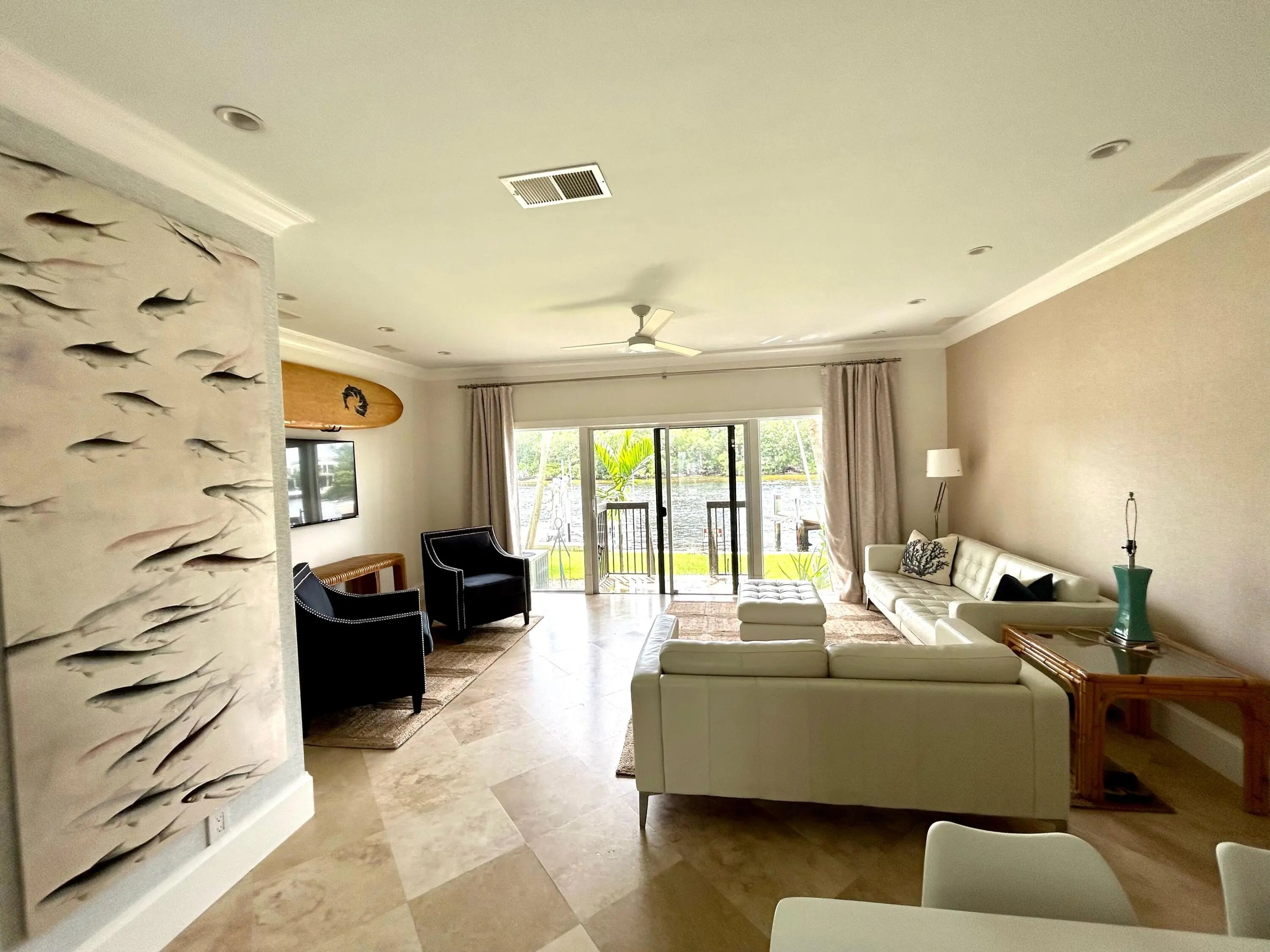 Rarely available, this beautifully remodeled townhouse. Is situated directly on the intracoastal waterway on the island, just blocks to the beach, shops, restaurants and bars. Perfect for a pied-a-terre, corporate retreat, beach cabana or retirement home. The townhouse boasts two en-suites, a downstairs power room, a garage, courtyard, a new AC, a tankless hot water heater, stone flooring throughout, a stainless steel kitchen, indoor/outdoor sound systems, an outdoor shower, a full-size washer/dryer and large primary bath with a jacuzzi tub, marble and dual sinks. Enjoy stunning views of never ending boat parades and the nature preserve from the comfort of your couch, kitchen and bedroom. This very low HOA property sits in a small four-unit complex and includes a deed for a deep water