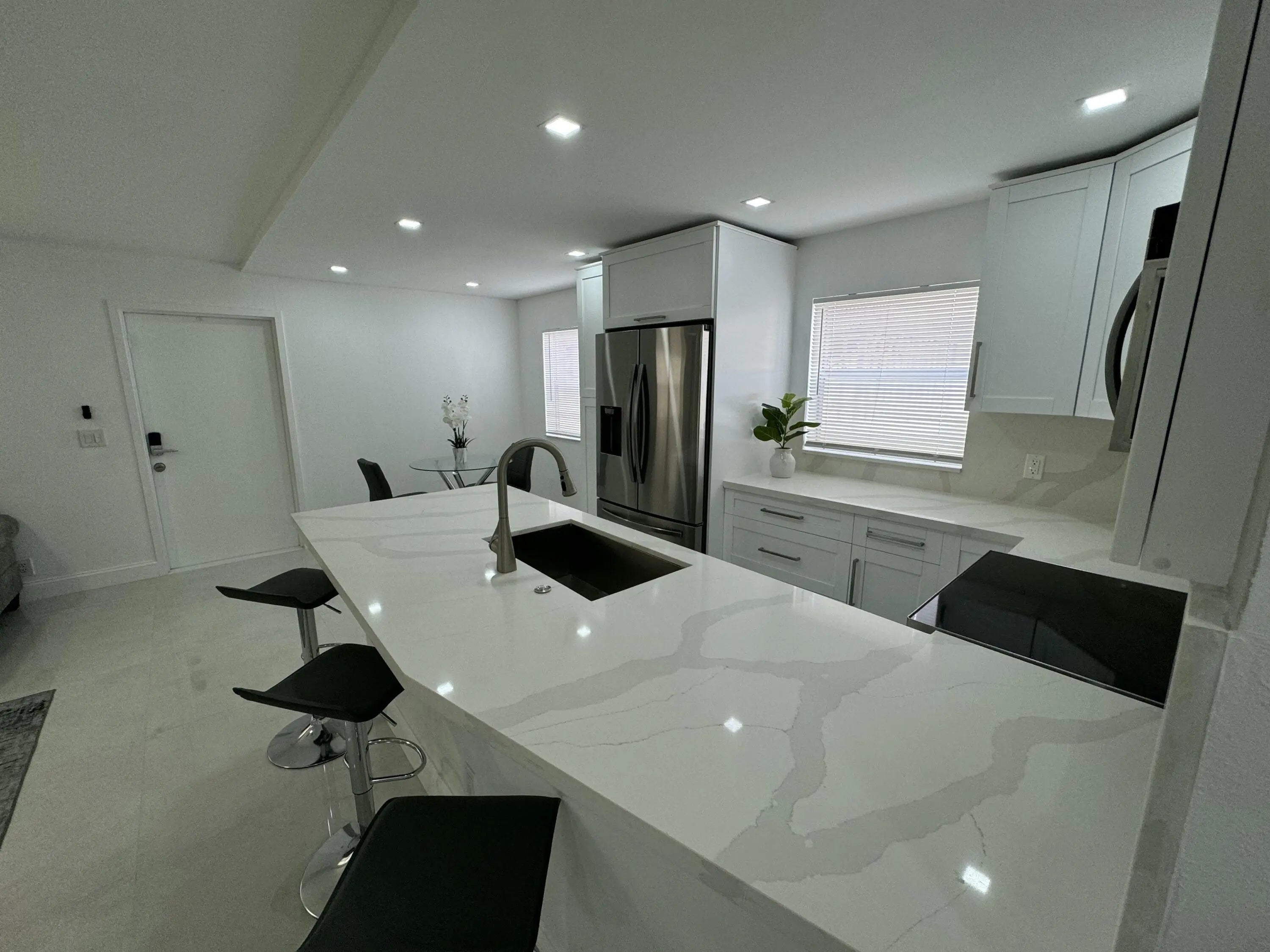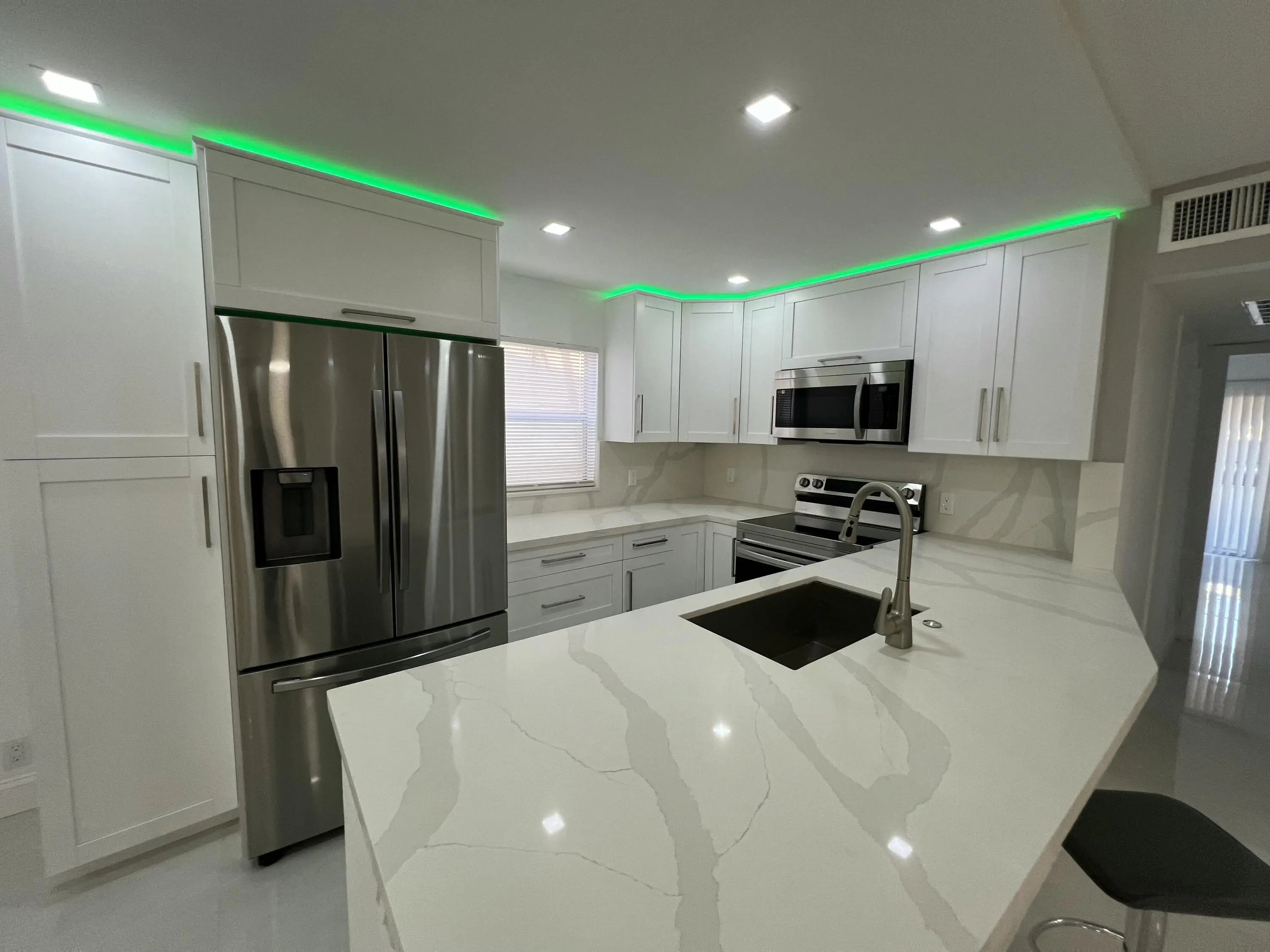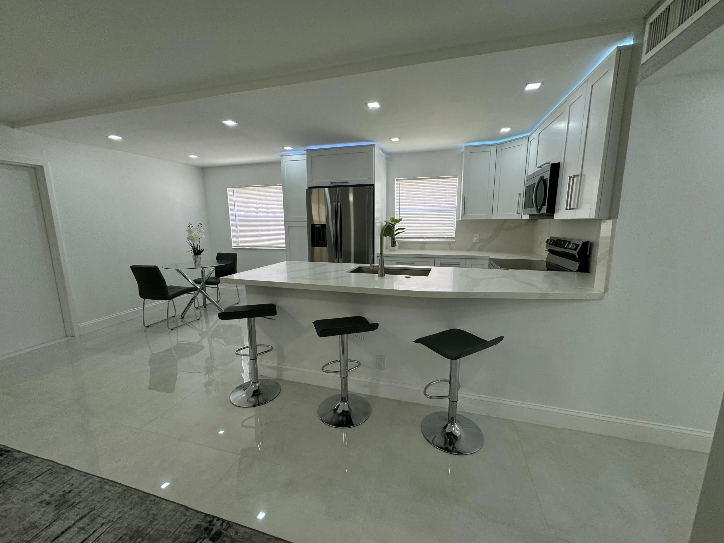 STUNNING UNIT! This beautiful 2 bedroom apartment is located in the heart of Kings Point; steps to the clubhouse, restaurant, and tennis and pickle ball courts, and pool!!! The apartment features two spacious bedrooms, each with plenty of natural light and ample closet space. The living room is bright and airy, with a large window. Kitchen boasts BRAND NEW appliances and beautiful white cabinetry, plus quartz countertops and backsplash. Added pantry cabinet. No detail was overlooked in this beautiful remodel. Neutral color palette to suit any decor style desired. Includes washer and dryer; electrical panel; water heater. All ceramic oversized tiles throughout; and two tastefully renovated bathrooms with frameless glass shower enclosures.