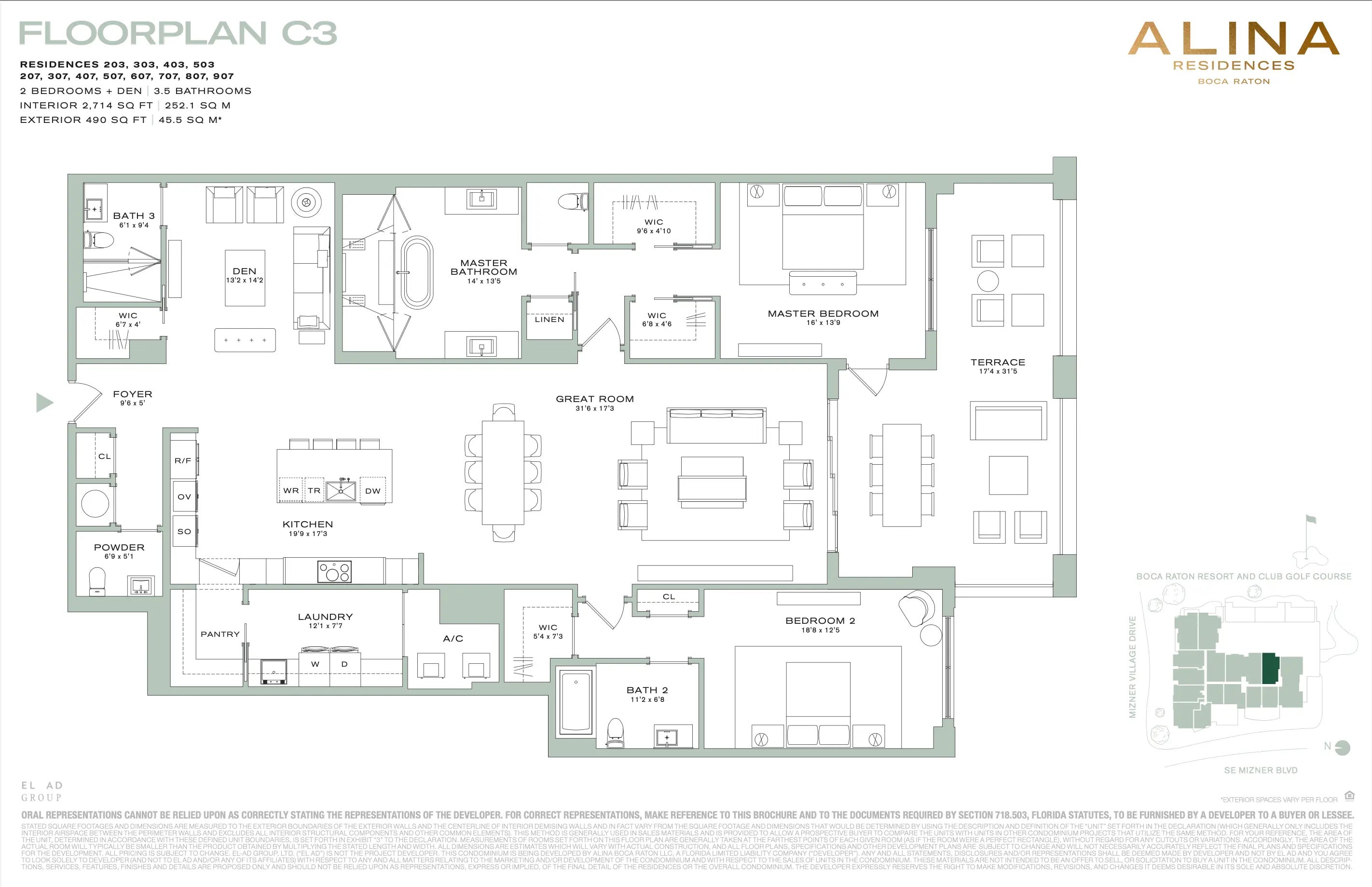 BEST 2 bedroom + den line in ALINA 200. This DIRECT EAST facing residence has an oversized terrace adorned with a wooden pergola and stacked stone finishes. 2 Bedrooms + DEN, 3.5 baths - boasting unobstructed views of the championship golf course of the Boca Raton Resort & Club along with views Alina's garden and water features. Stunning matte grey Italian kitchen cabinetry by Scavolini. Miele appliances include induction cooktop, wall ovens, refrigerator, freezer and wine refrigerator. Located in the heart of East Boca Raton, ALINA provides its residents with not on only the most well rounded amenity package but also unmatched walkability to some of Boca Raton's best restaurants.