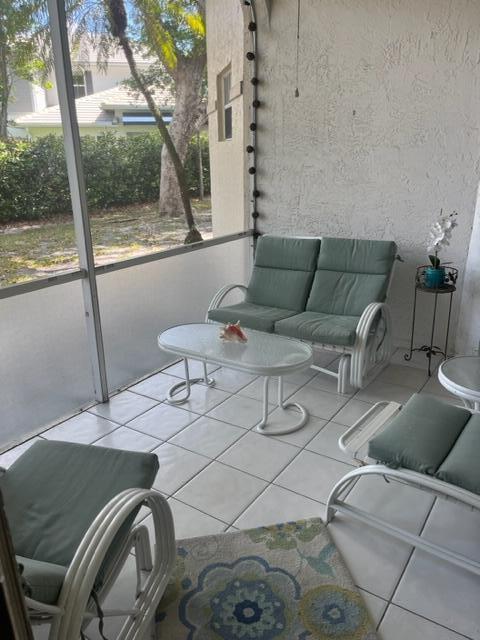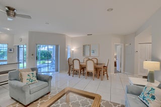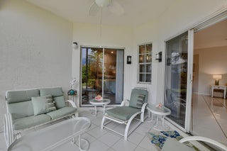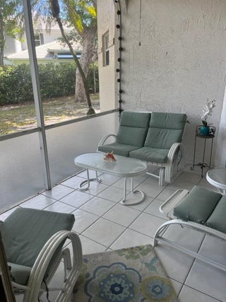 Annual furnished rental or 6 month minimum seasonal rental now available. Beautiful first-floor garden apartment, featuring tile floors in the main living areas and cozy carpet in the bedrooms. The updated open kitchen boasts granite counters, elegant white cabinets and replaced appliances. Perfect for entertaining, the great room flows seamlessly into the dining area. The spacious primary bedroom includes a large renovated bathroom, ample closet space, and direct access to the patio. The second bedroom offers a generous wall closet and easy access to the updated second bath. Enjoy serene garden views from the expansive screened patio. Convenient assigned parking is located right at the front entrance. The community offers a large pool with scenic lake views.