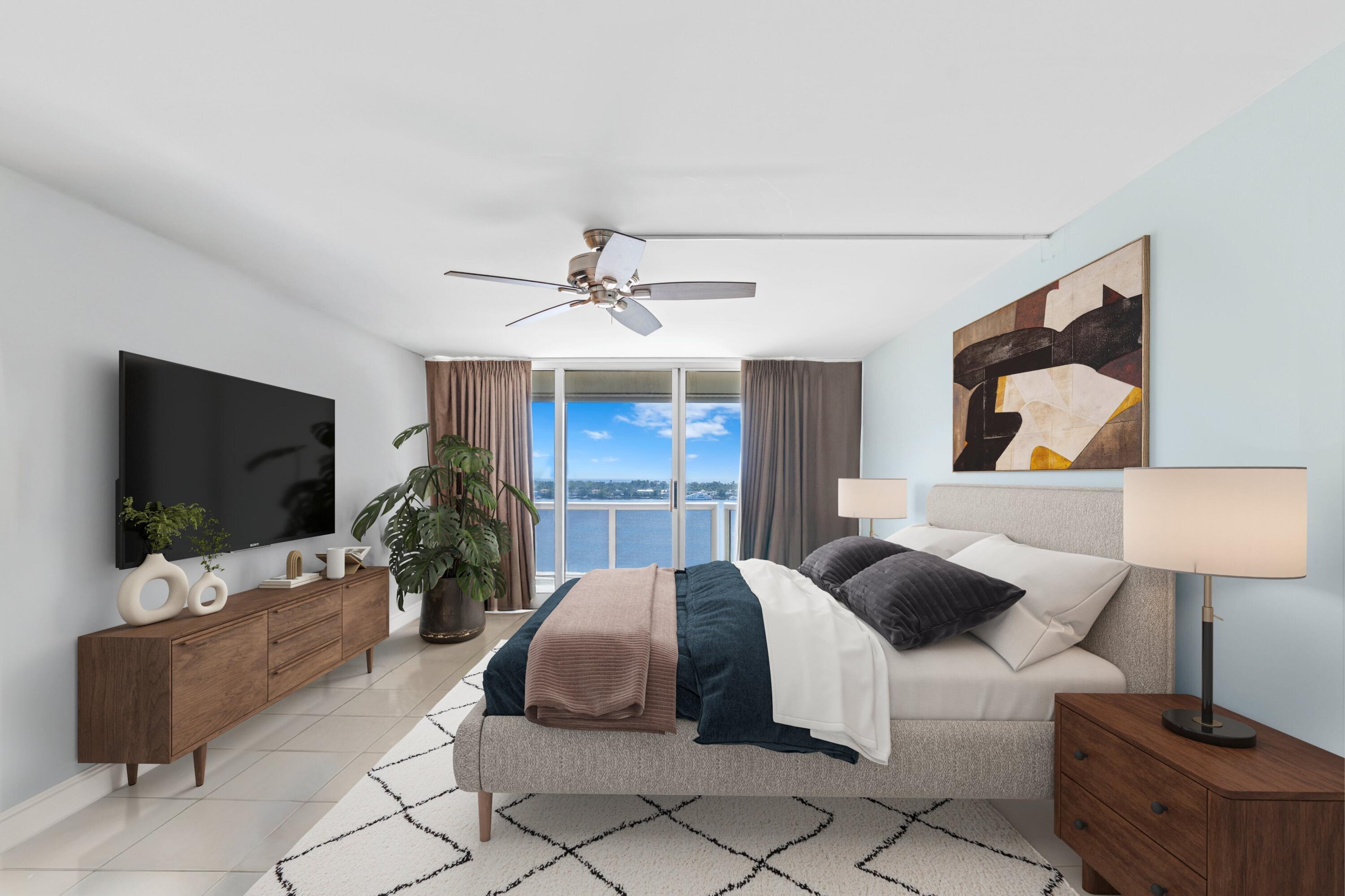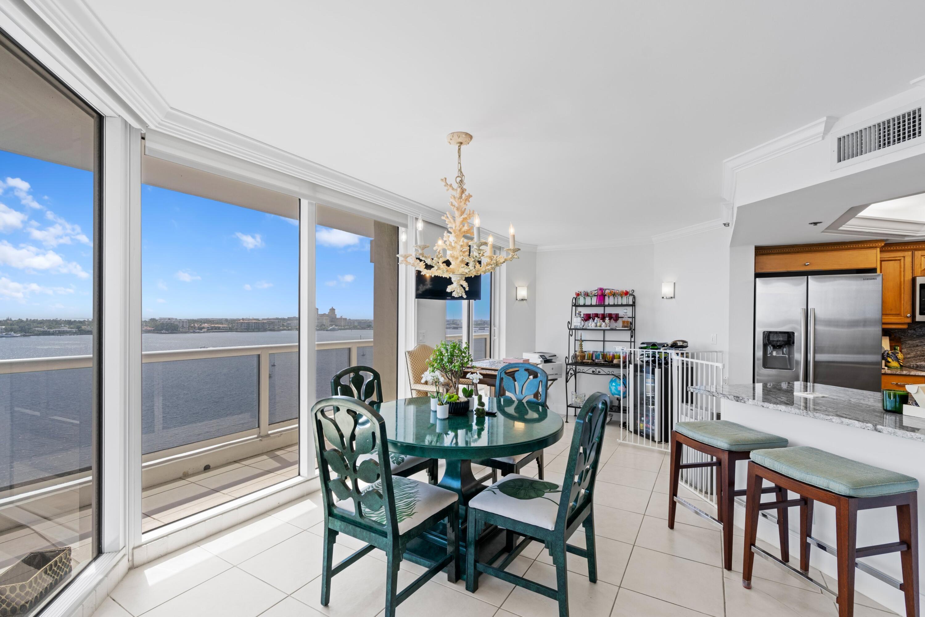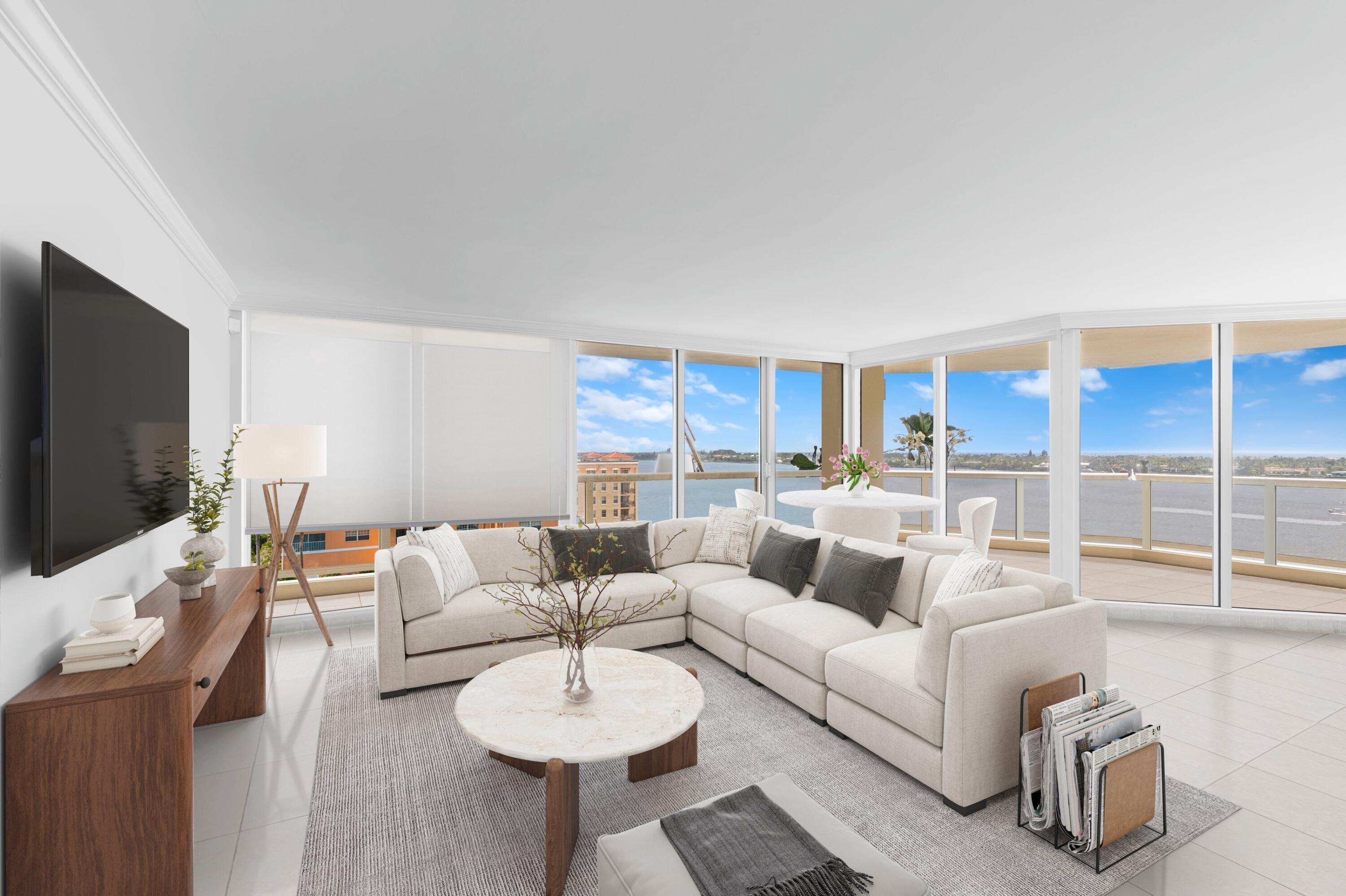 Full Service Boutique Condominium situated on the Intracoastal Waterway. Amazing Panoramic views of Palm Beach and the Ocean! Spacious 2 bd 2.5 Bath Corner Apartment with floor to ceiling windows and very large wrap around terrace. Only 2 Apartments on 12 floors for a very private, secure living experience! Dog friendly with dog run on site. 2 Pools, hot tub, gym, and 2 outdoor grills. 24 Hr Doorman and Security.