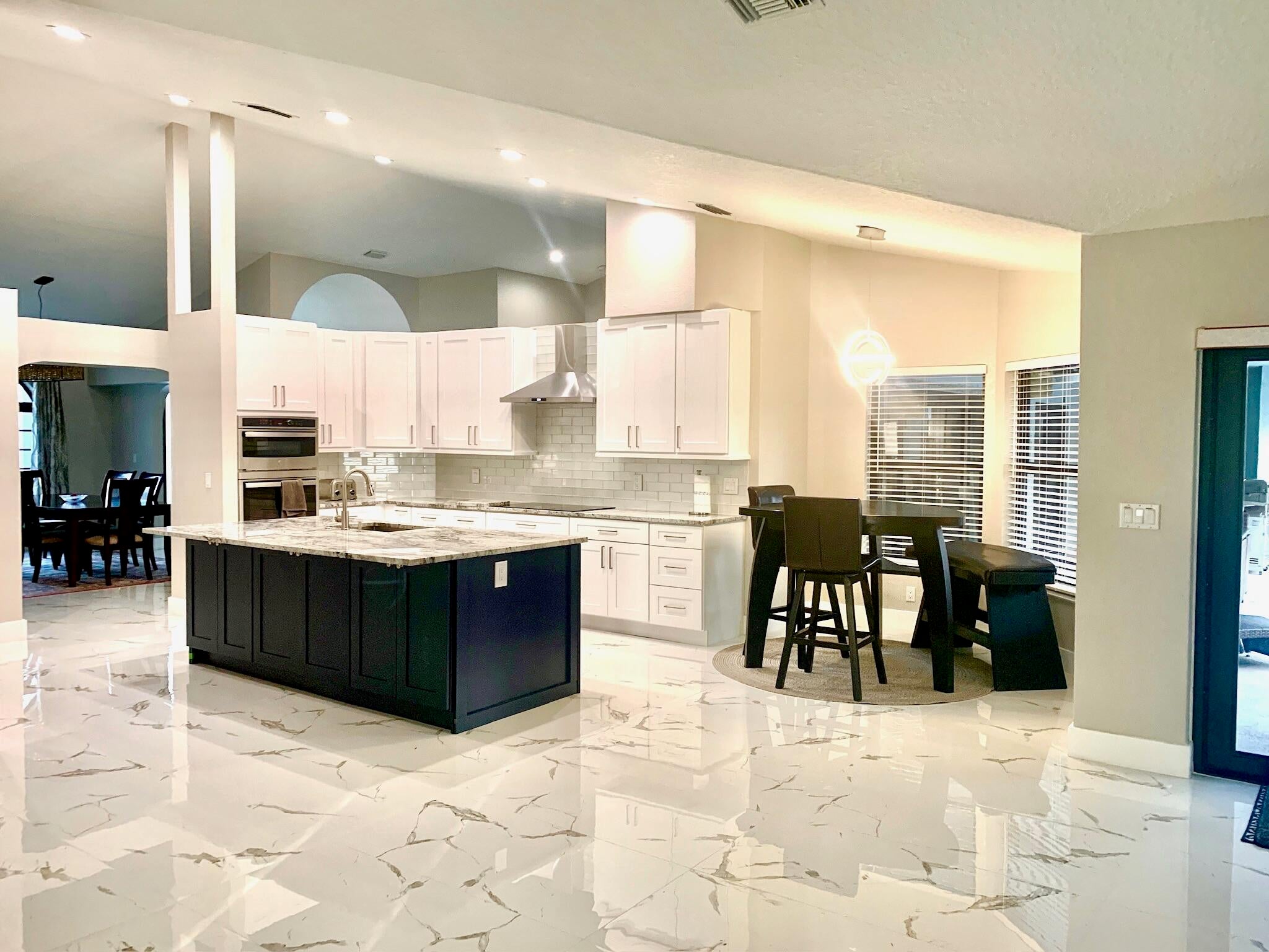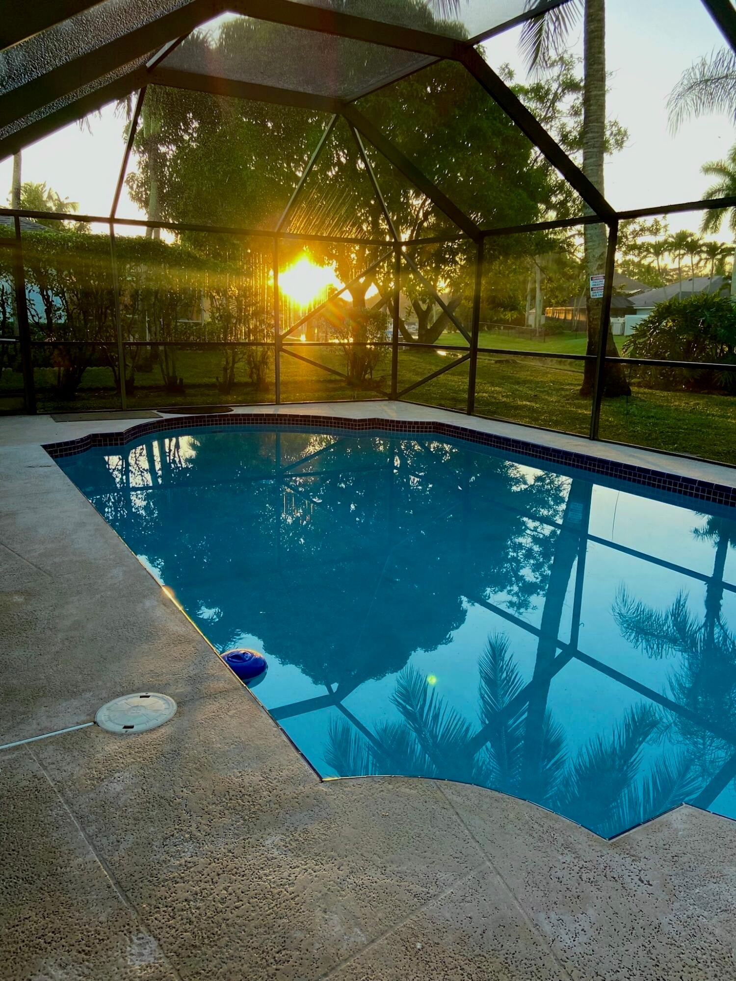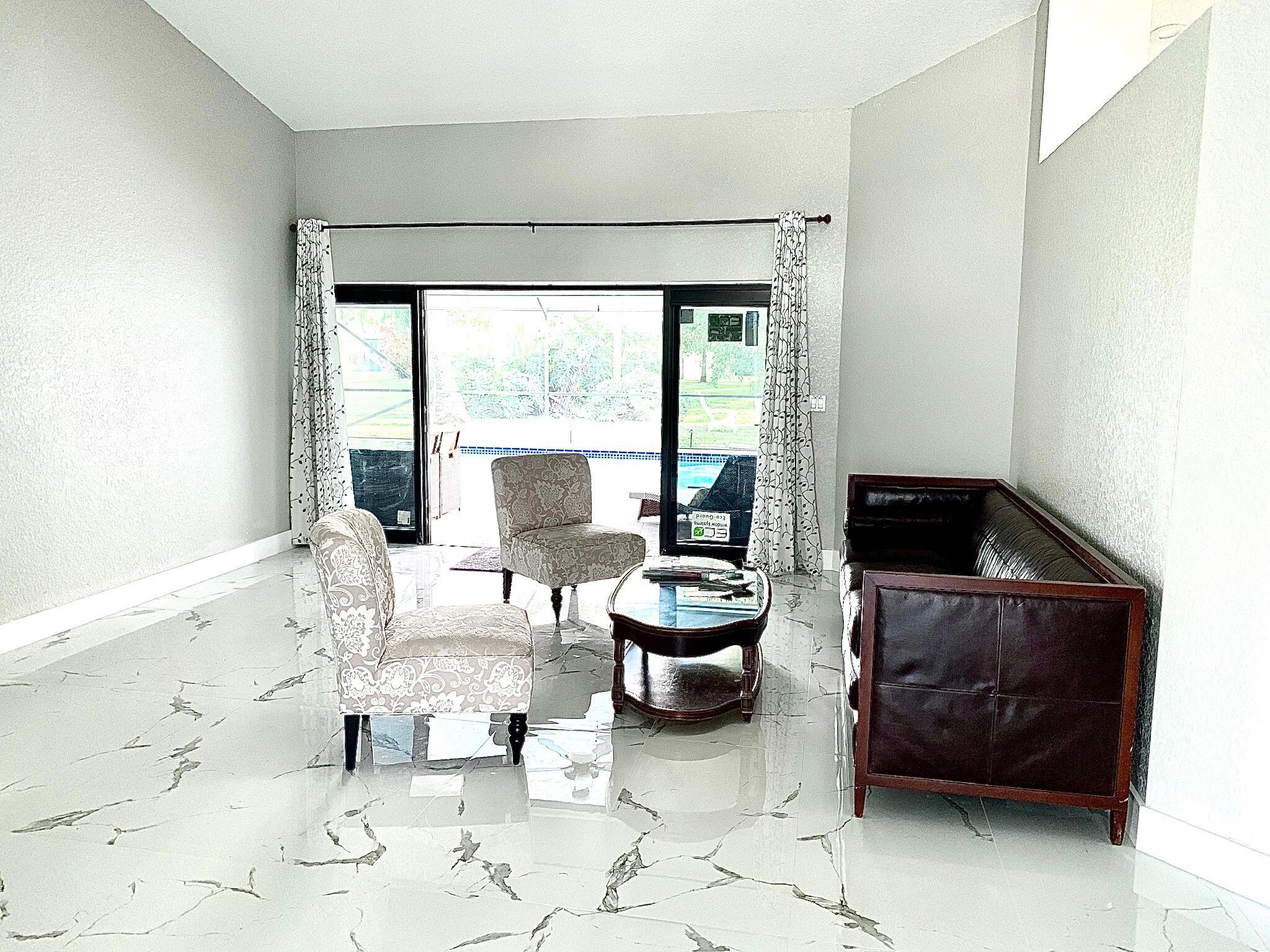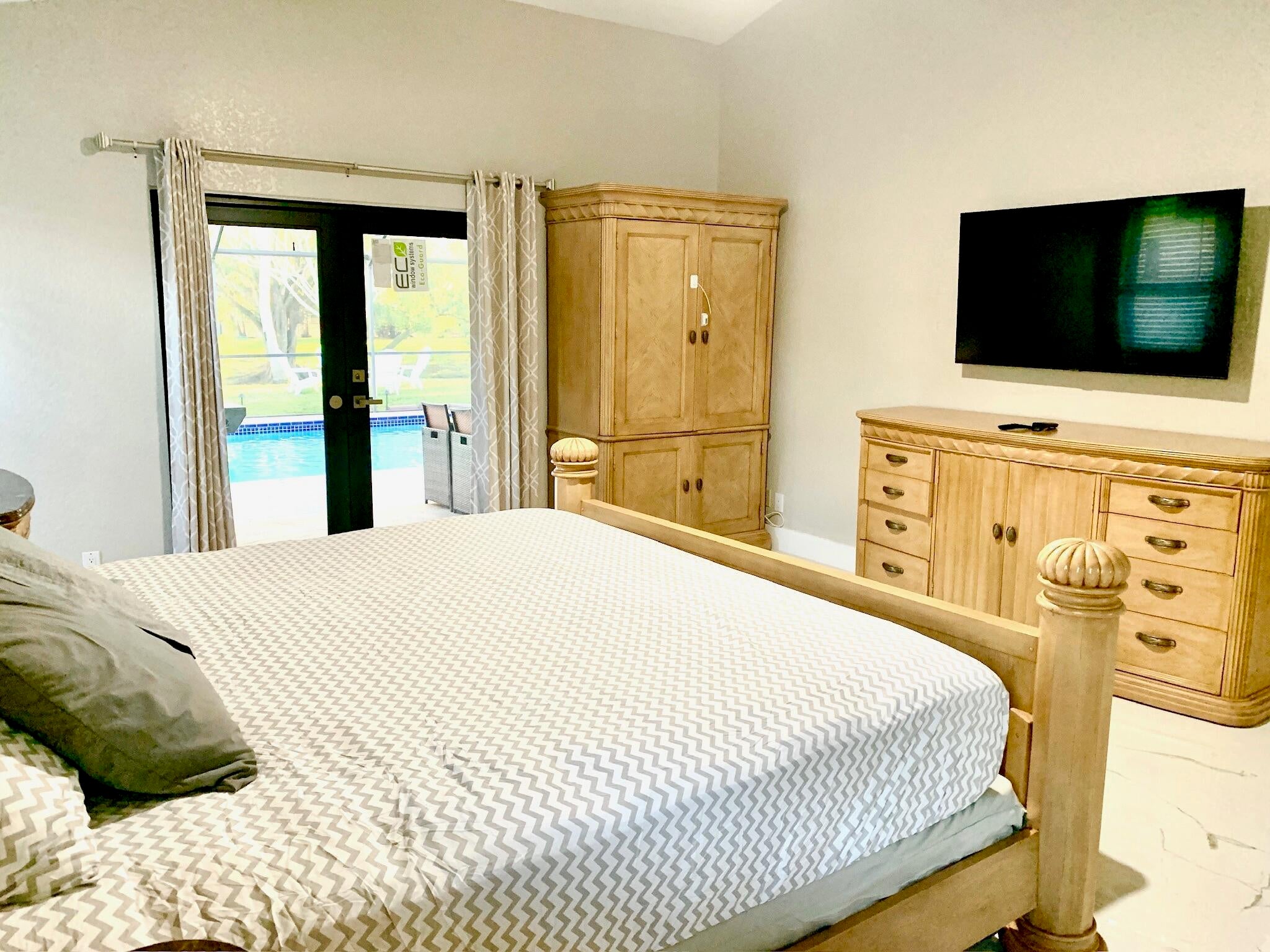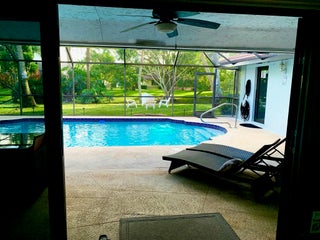No HOA approval required! No pet restrictions. Available for 2026 winter season. Take in a sunset or gather around the newly renovated oversized kitchen island with your favorite beverage. FULLY RENOVATED pool home on the lake 10 min golf cart ride to WEF and walking distance to shopping, top rated restaurants and amenities. Heated and screened pool, 2 car garage, and dual AC system. Oversized vehicles including Dully trucks allowed. No commercial vehicles unless they fit in oversized garage or covered with blank magnets. 1 king, 2 queen, 1 full and 1 twin beds in 4 rooms. Pets welcome.