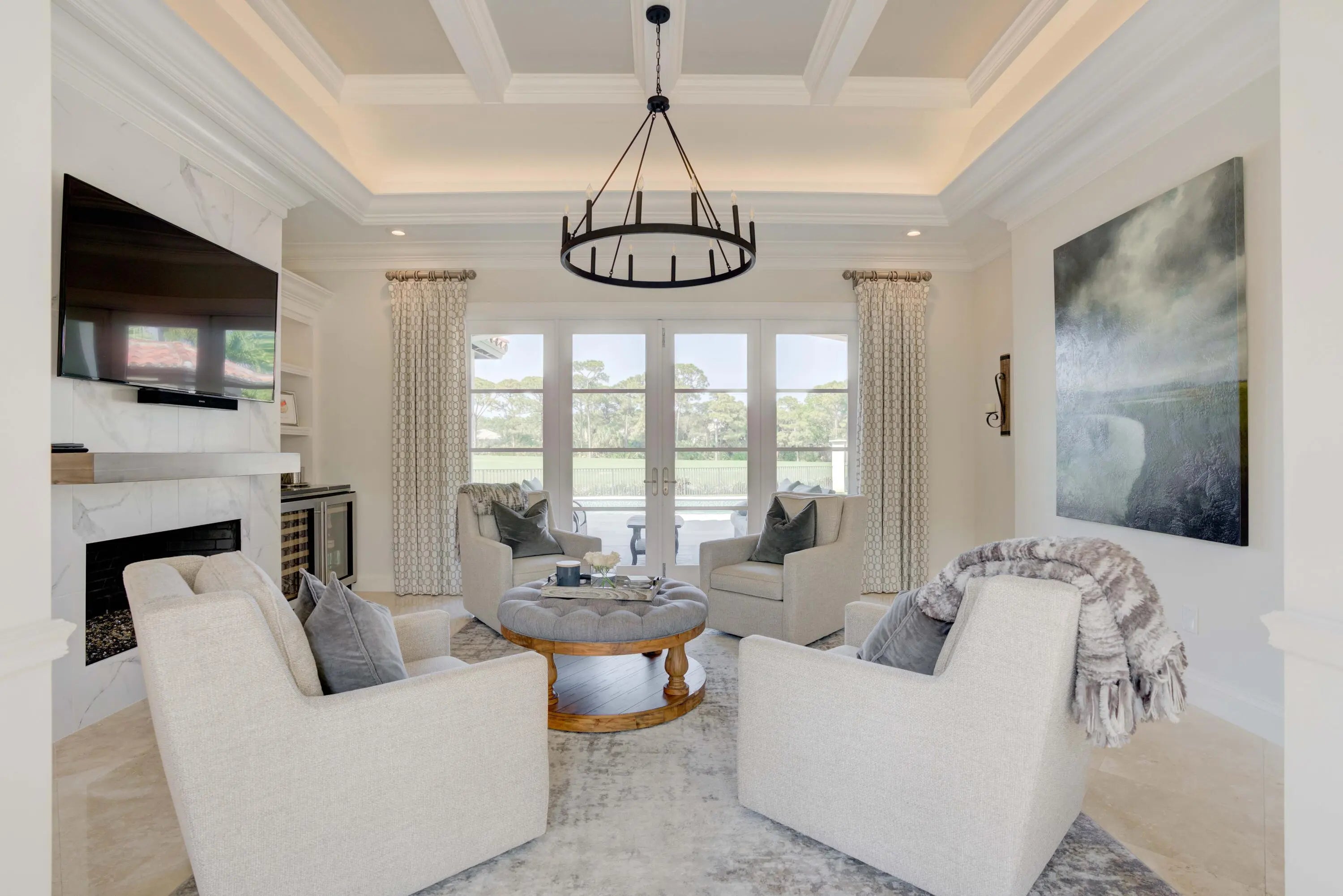 Built-in Shelves, Closet Cabinets, Decorative Fireplace, Volume Ceiling, Walk-in Closet, French Door