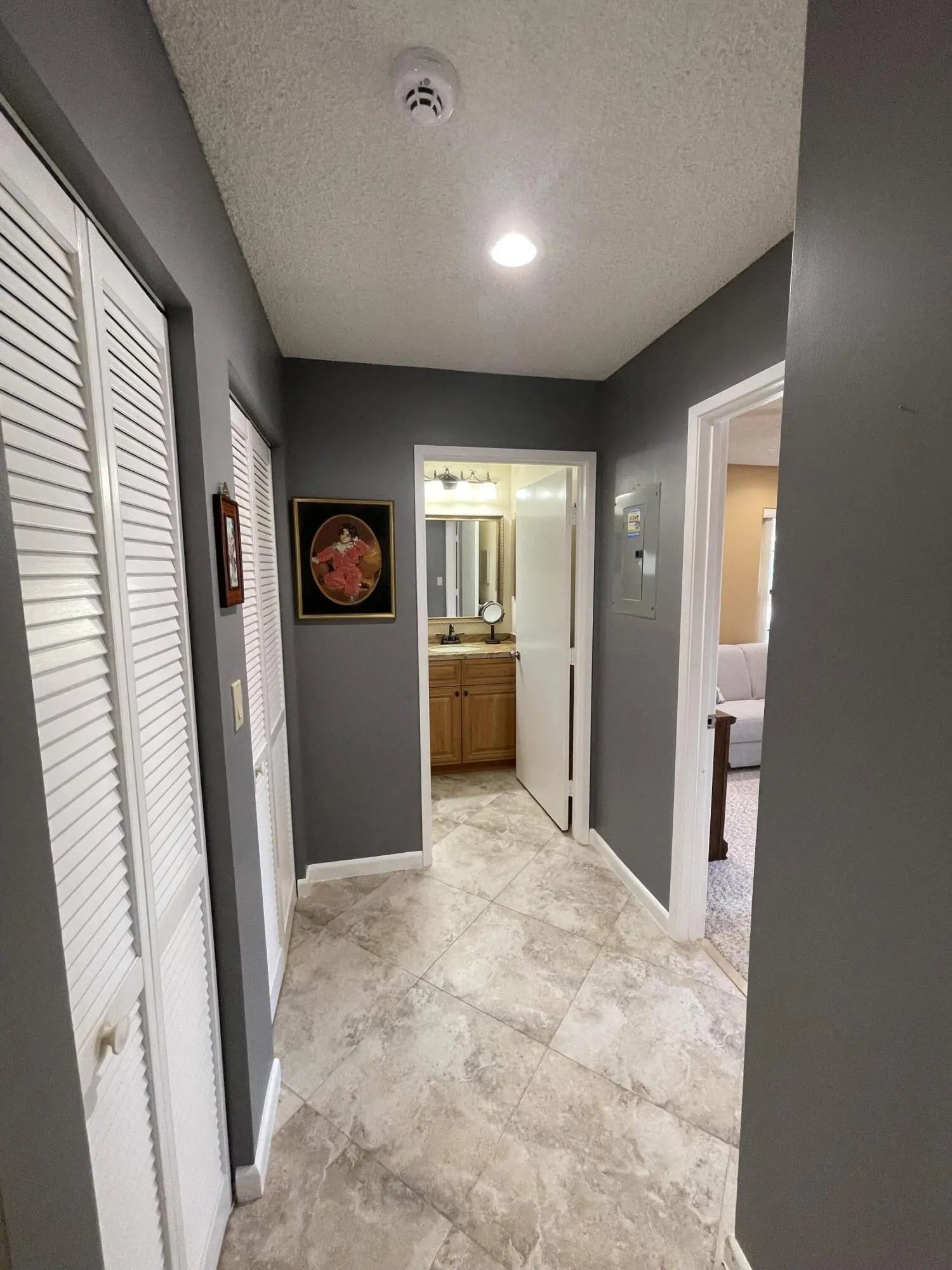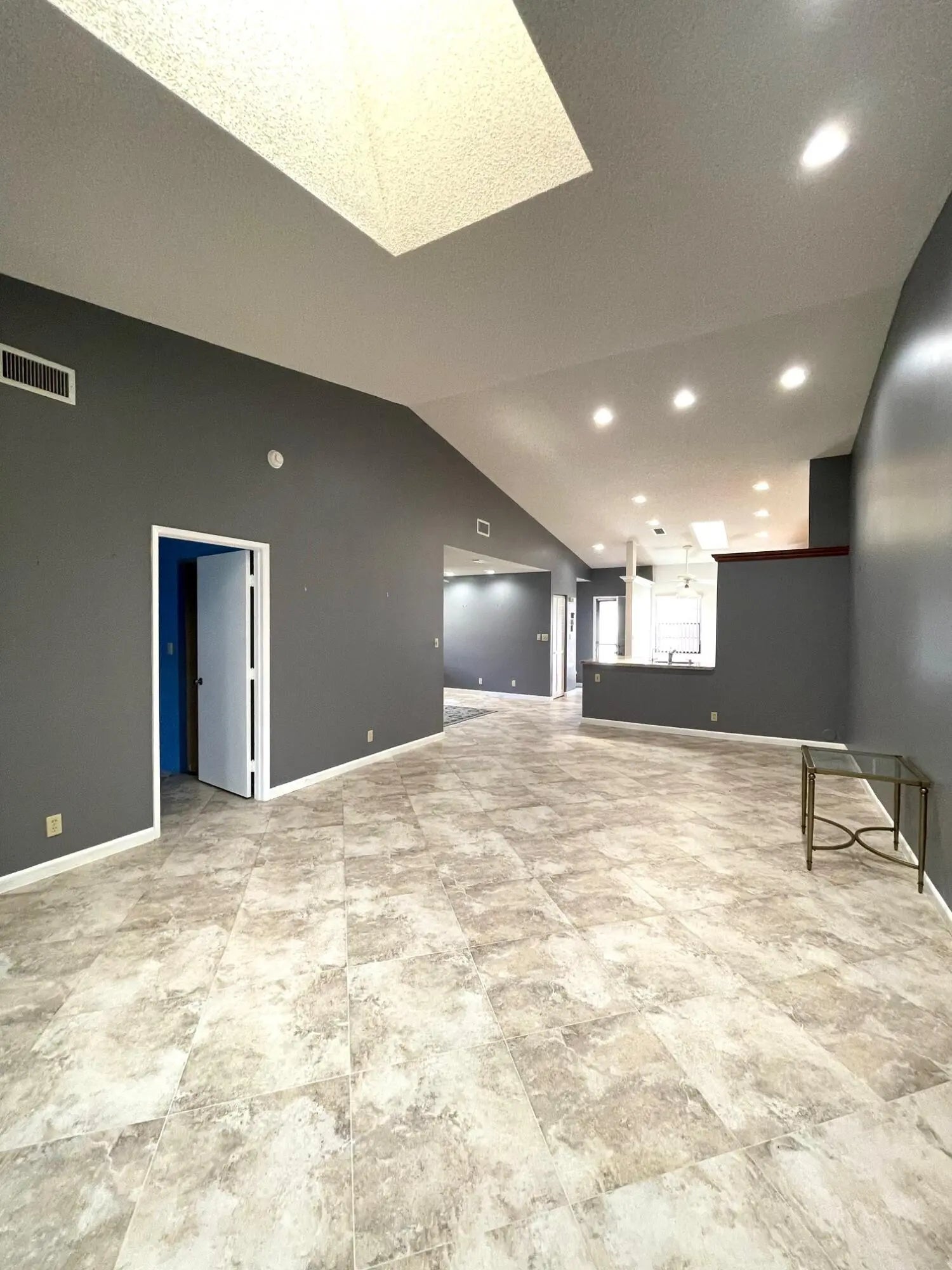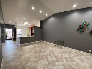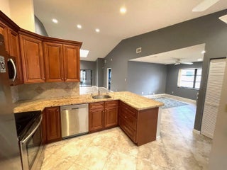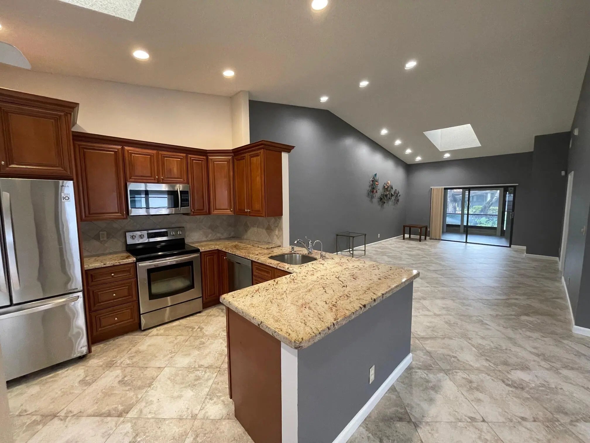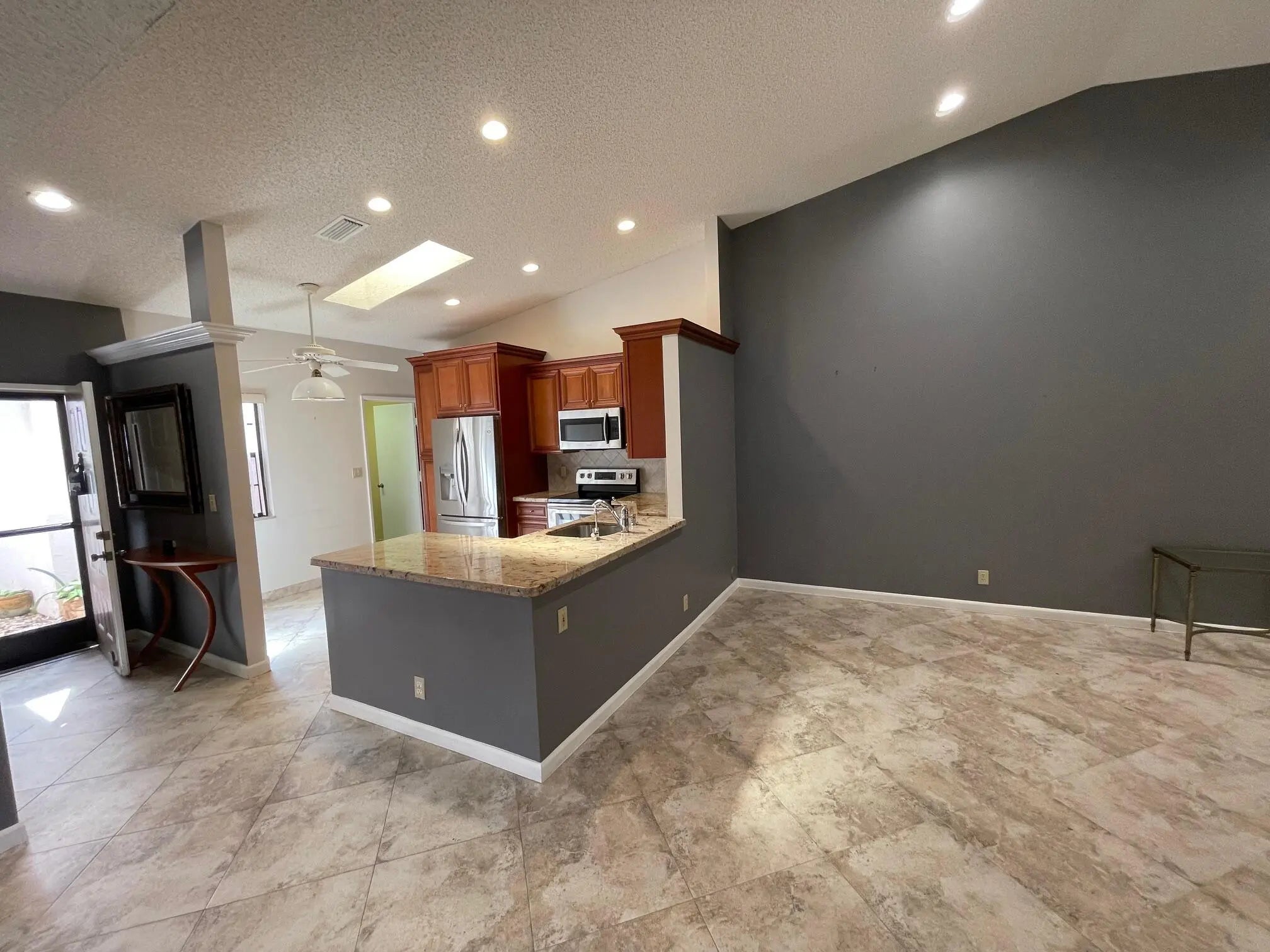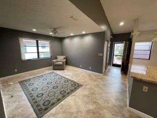 This expansive villa features soaring vaulted ceilings and an open concept layout perfect for modern living. The beautifully renovated kitchen is equipped with granite countertops and top-of-the-line stainless steel appliances, making it ideal for both cooking and entertaining. The home boasts elegant diagonal tile flooring throughout, complemented by ample high-hat lighting that adds a touch of brightness to every room.The renovated primary bathroom offers a serene retreat with modern finishes and a luxurious feel. Additional conveniences include a front-loaded washer and dryer and a quick closing option for your convenience.