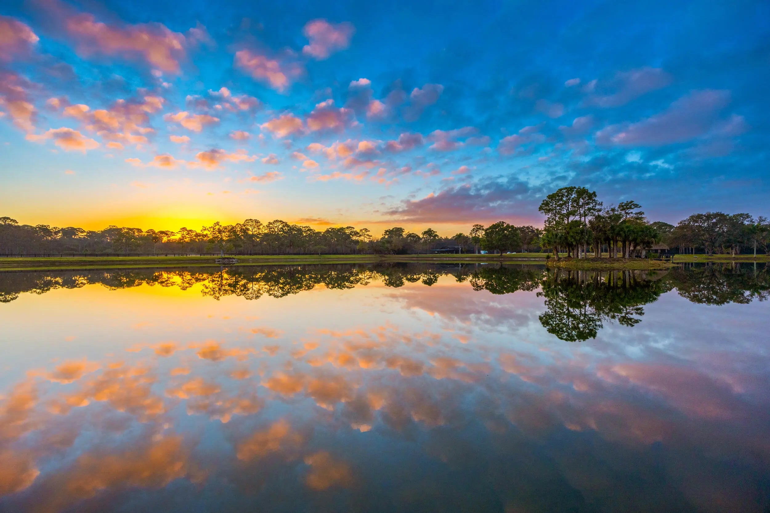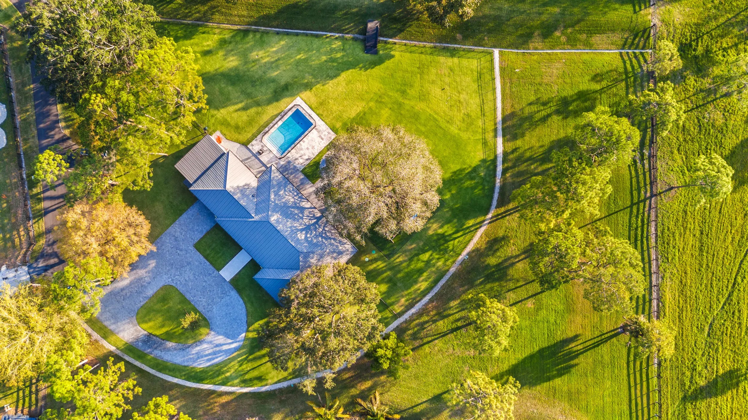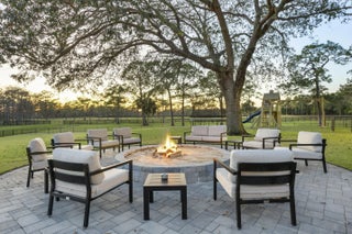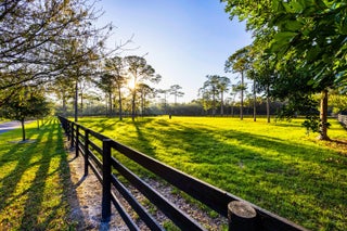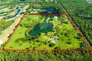 Gated community and privately gated 50 acre estate offers unparalleled potential in a prime Jupiter, Florida location. Property has all new fencing, freshly paved asphalt roads, expertly graded grounds and planted with Bahia grass, and an extensive irrigation system with multiple wells, creating the perfect template. This estate adjoins the prestigious Dye Preserve Golf Course, enhancing both privacy and natural beauty and a 6.25 acre lake enhances the privacy and views. Approximately 42 acres of the property is deemed dry by SFWMD. The main residence, a fully renovated 2,308 sq. ft. home, has been meticulously updated for modern luxury living. Potential includes an equestrian haven, a multi-generational family estate, or even a luxury car storage space for the discerning collector