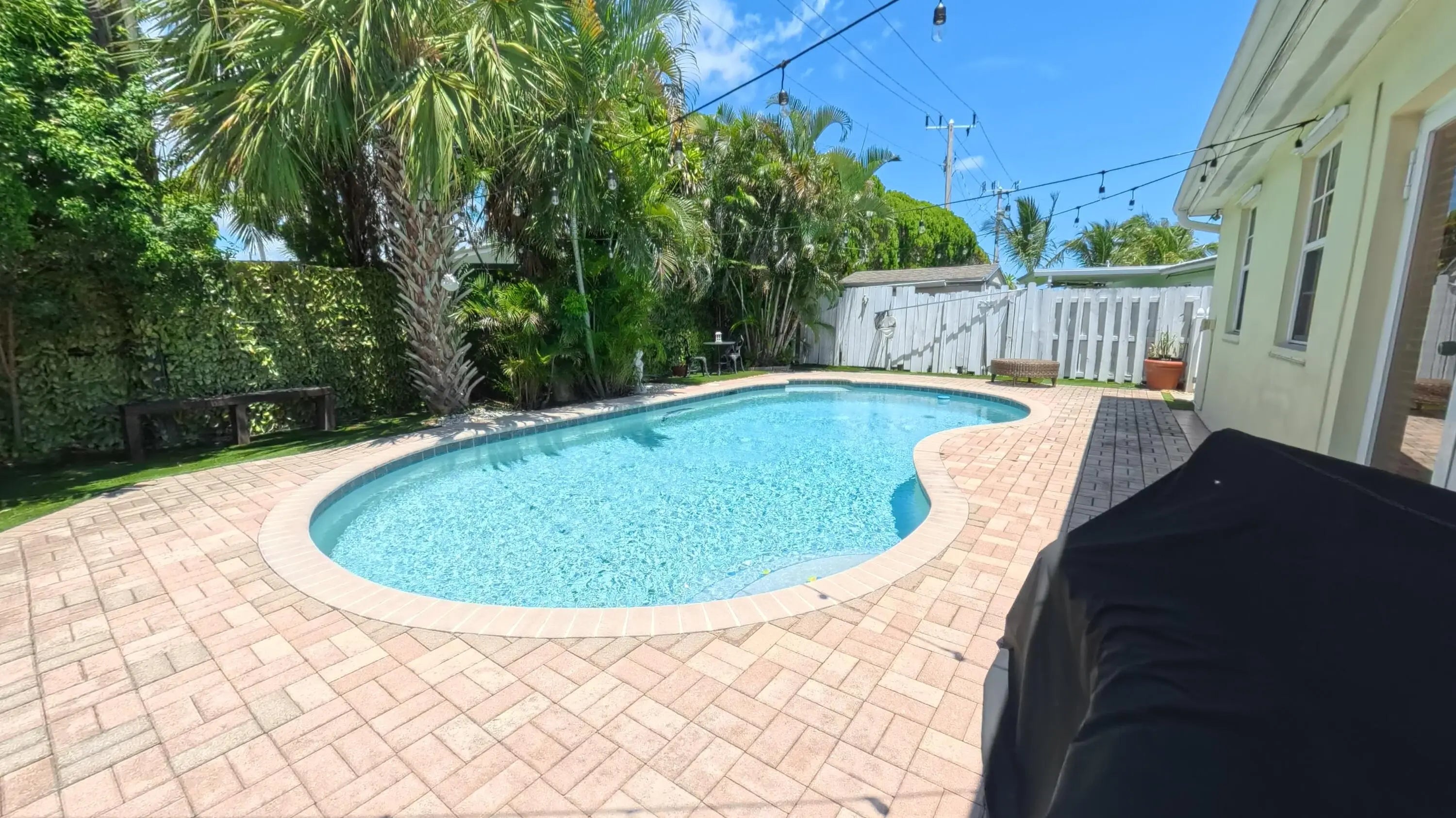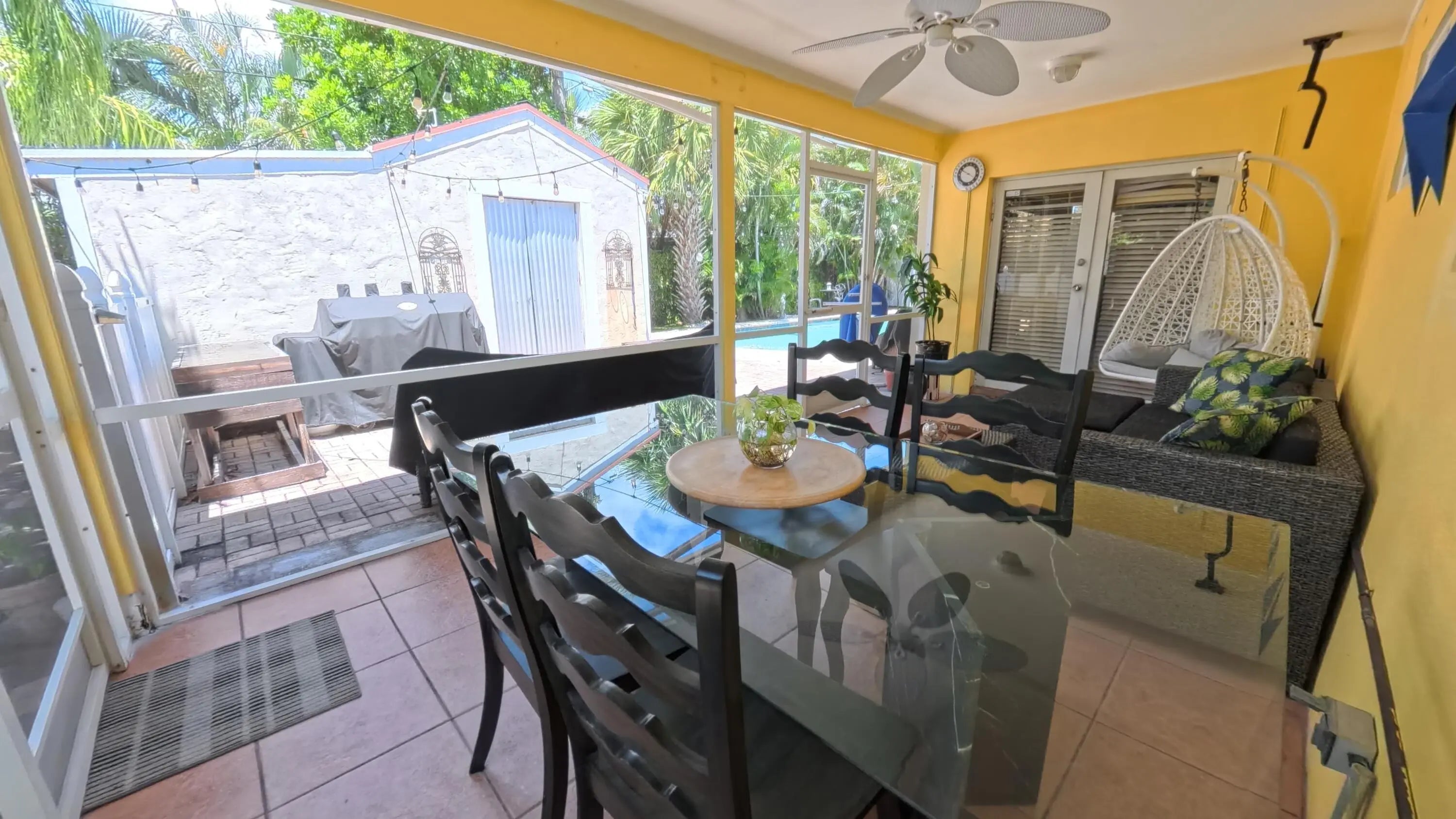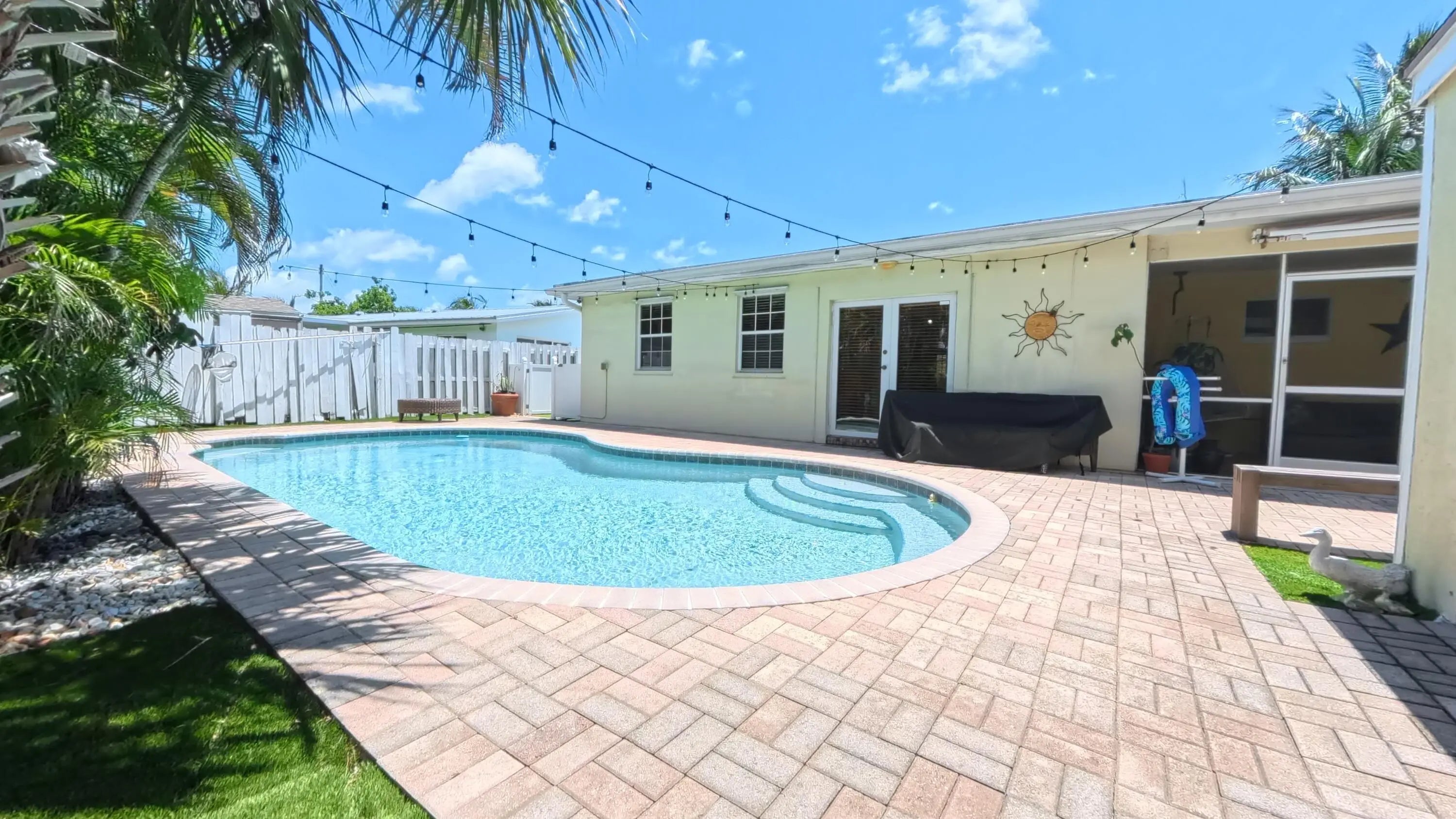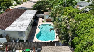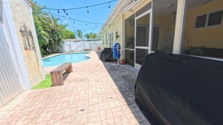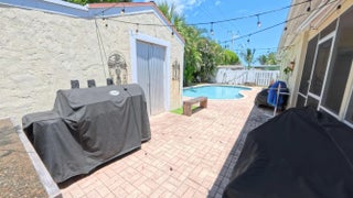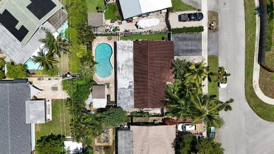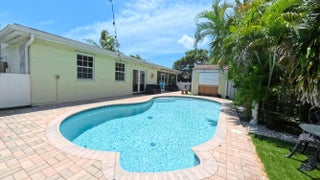 Great Single Family pool home with excellent location under 10 minutes to the beach and no HOA fees or restrictions. Tastefully redone kitchen with Cambria Quartz, SS Appliances & white Shaker cabinets, updated baths, gleaming terrazzo floors and an open flowing layout that makes entertaining a joy! Owner has removed the popcorn ceilings, and added distressed wood accents, plantation shutters and converted the garage to a large bonus room that could be an office. Large family room can be easily converted to a third bedroom but Owner made as their fitness space. New flat roof 2019, new A/C w HALO air purification 2020, tankless water heater 2020; whole house water purification, keyless entry and hurricane rated shed. Come enjoy this great Swimming pool with a tiki bar to bring friends over