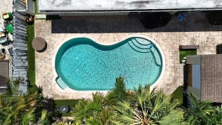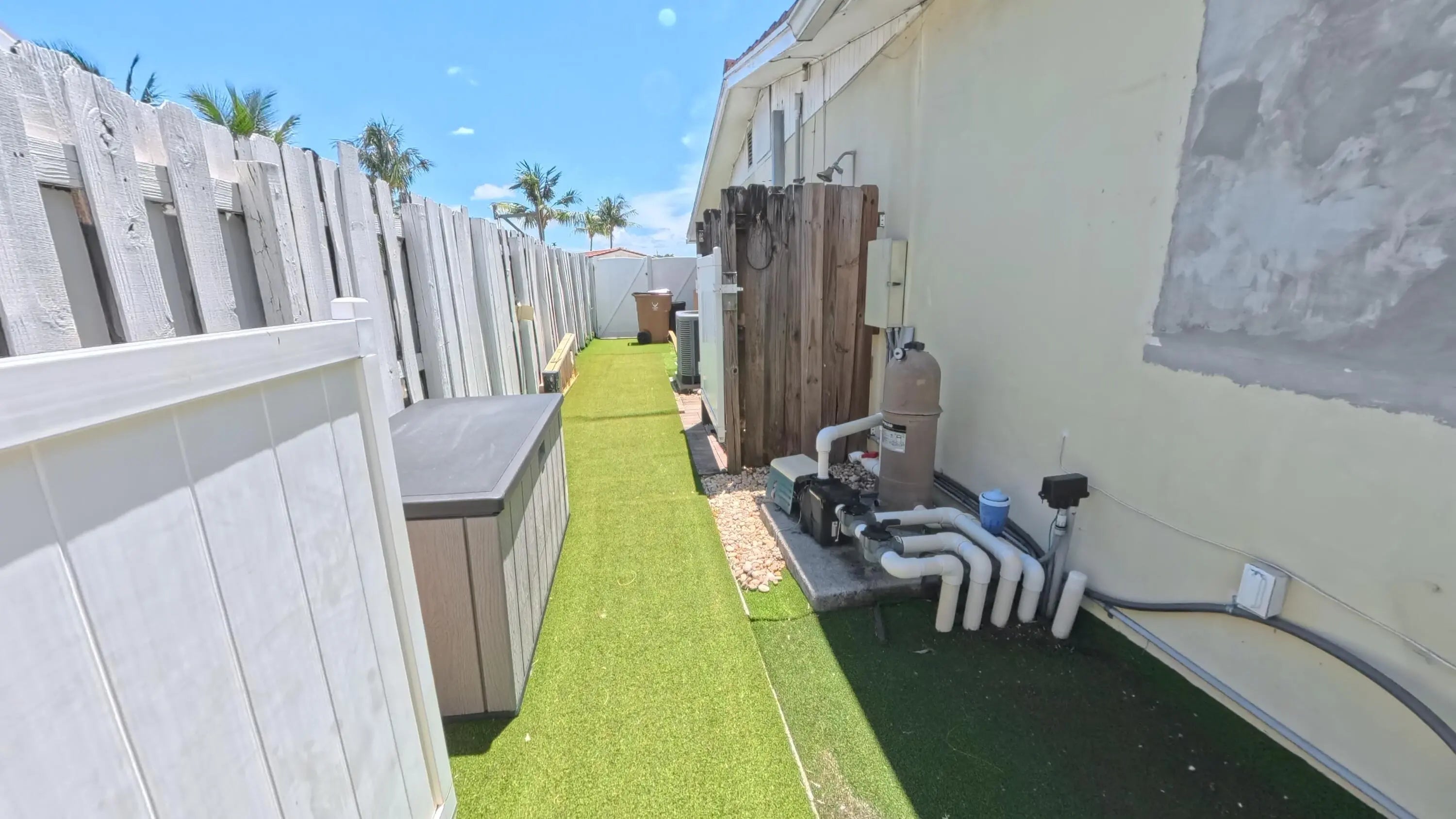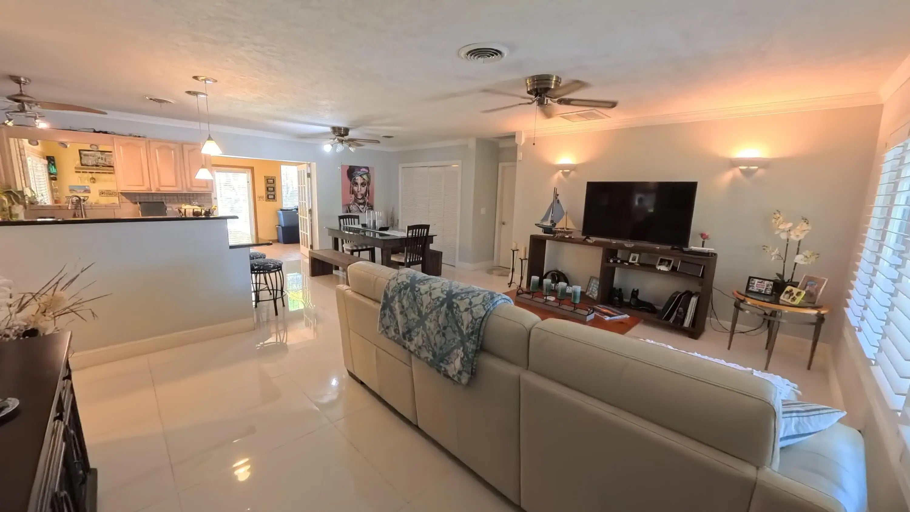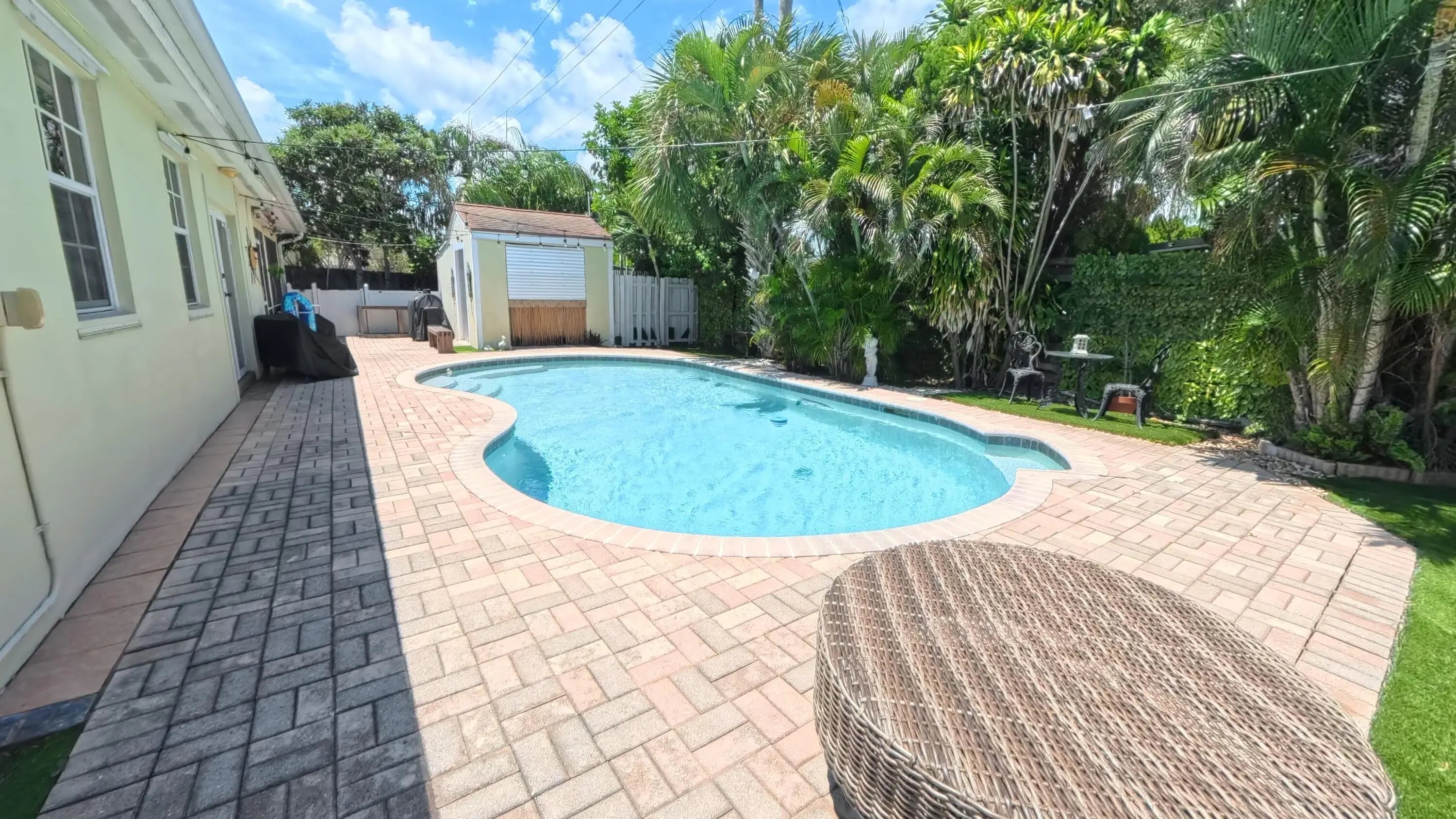 Great Single Family pool home with excellent location under 10 minutes to the beach and no HOA fees or restrictions. Tastefully redone kitchen with Cambria Quartz, SS Appliances & white Shaker cabinets, updated baths, gleaming terrazzo floors and an open flowing layout that makes entertaining a joy! Owner has removed the popcorn ceilings, and added distressed wood accents, plantation shutters and converted the garage to a large bonus room that could be an office. Large family room can be easily converted to a third bedroom but Owner made as their fitness space. New flat roof 2019, new A/C w HALO air purification 2020, tankless water heater 2020; whole house water purification, keyless entry and hurricane rated shed. Come enjoy this great Swimming pool with a tiki bar to bring friends over