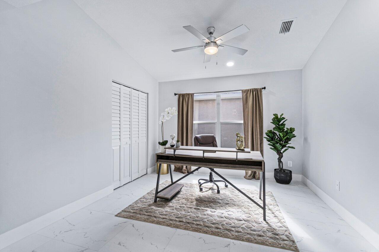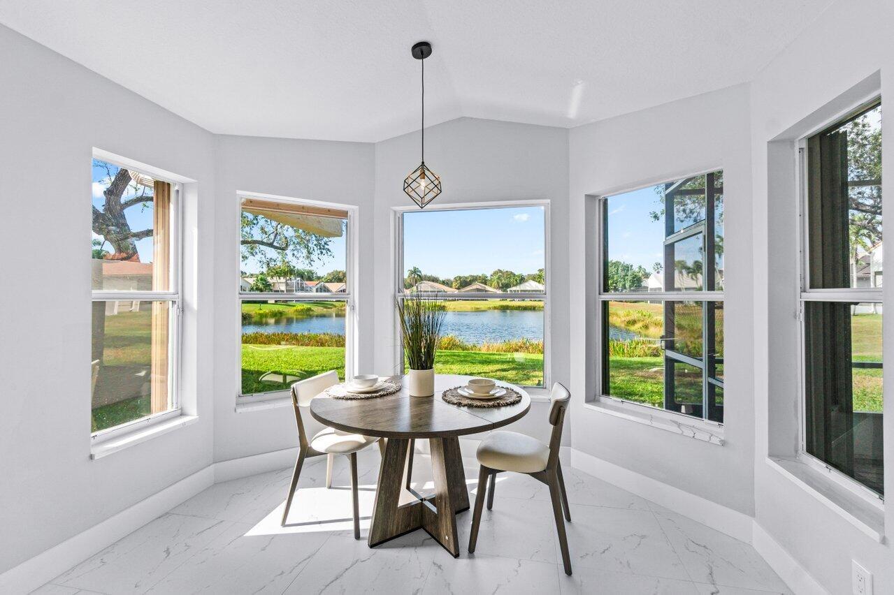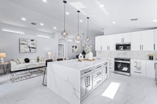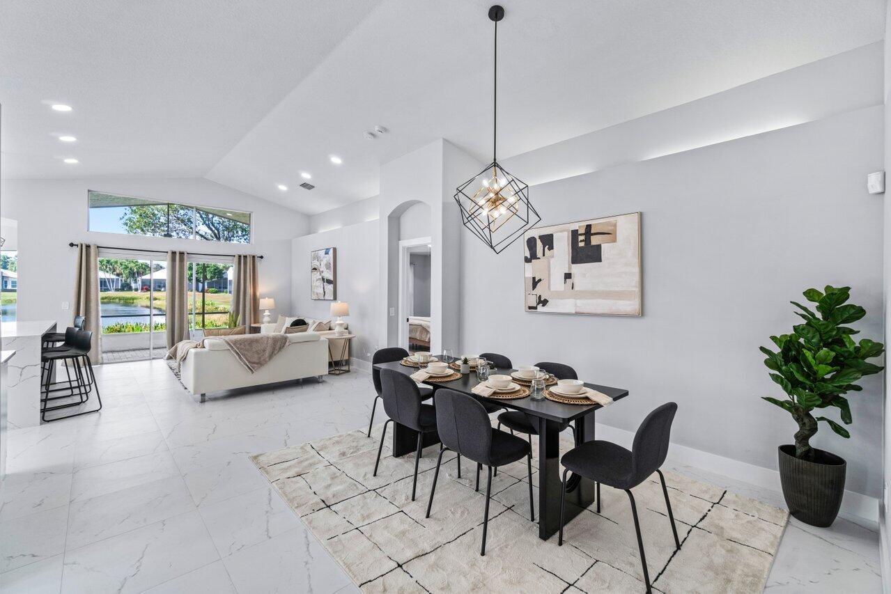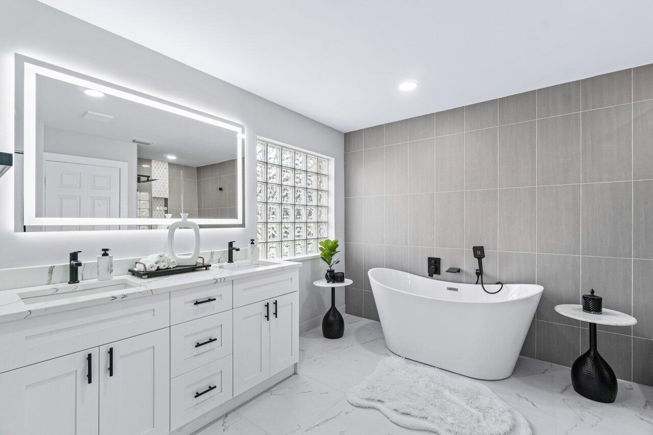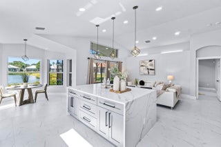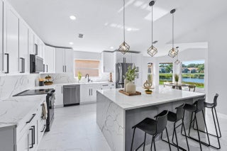 Welcome to your dream home in the picturesque Valencia Lakes! This BEAUTIFULLY RENOVATED 3-bedroom, 2-bathroom residence offers unparalleled lake views, arguable the best in the community. NEW 2025 AC. Step inside to an open floor plan adorned with exquisite marble-style porcelain flooring that seamlessly flows throughout all living spaces. Chef's kitchen, featuring brand new Samsung stainless steel appliances, kitchen island, ample storage, and sleek recessed & pendant lighting. It's the perfect space for culinary creations and entertaining guests. Retreat to the luxurious primary suite, where relaxation awaits. Indulge in the separate soaking tub or the walk-in shower, complemented by his and hers vanities, offering both convenience and elegance.