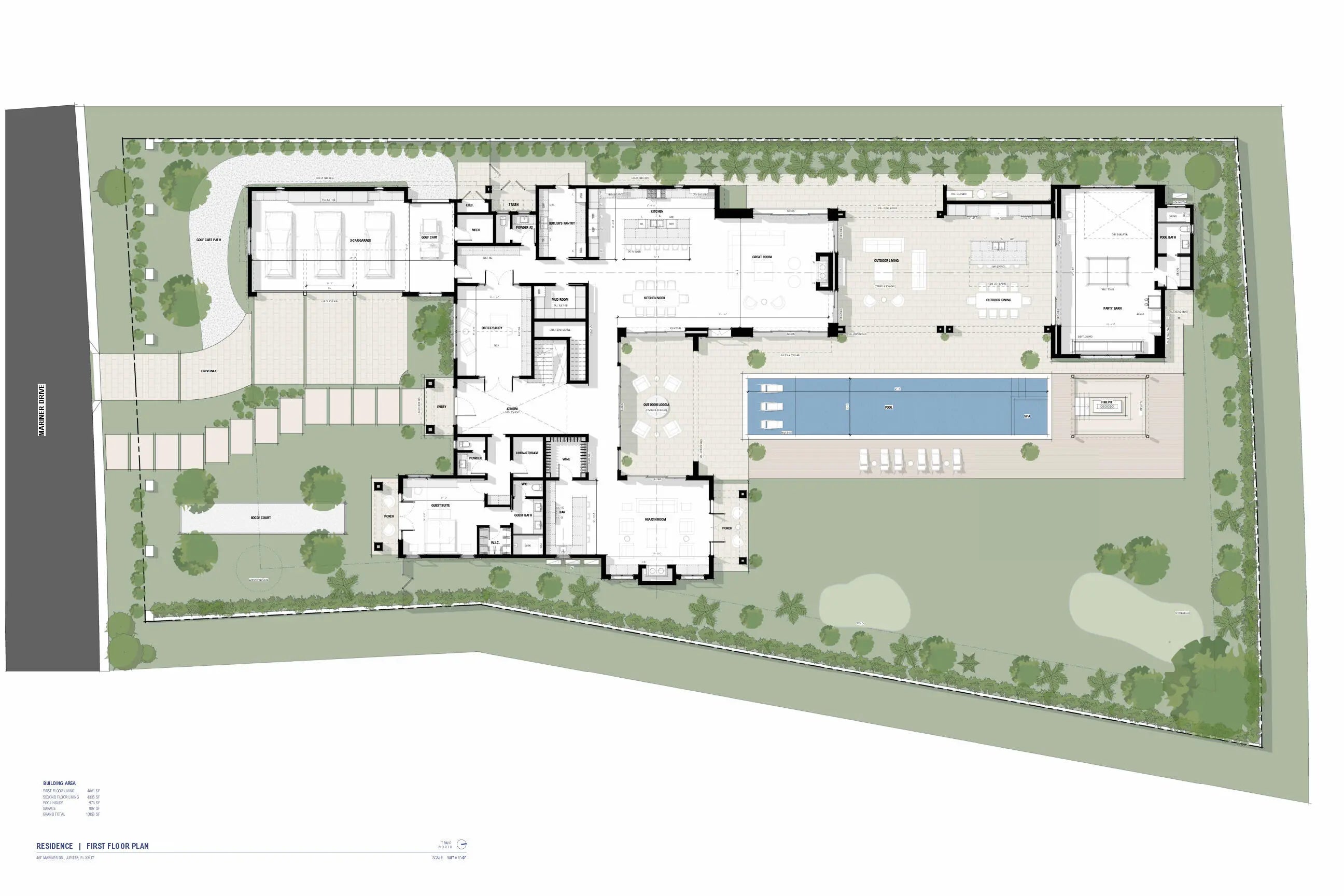 Experience the height of elegance and sophistication in this impeccably designed family estate, set within the exclusive enclave of Admirals Cove, offering a seamless blend of luxury living and premier golf and country club amenities. Showcasing unparalleled luxury, this exceptional residence is set on a private, oversized homesite (.61 AC) - one of the largest in Admirals - offering an extraordinary blend of architectural distinction, privacy, and refined living for the most discerning buyer. Designed exclusively by award-winning California firm, Brandon Architects, this custom two-story residence offers nearly 10,000 SF of living space, including 6 bedrooms, 8.2 bathrooms, a gym, spa, media room, and an expansive outdoor entertainment area with a resort-style pool and spa.