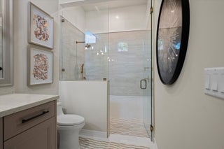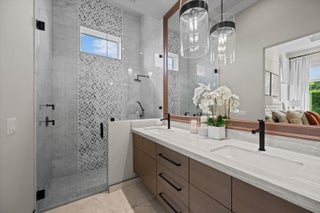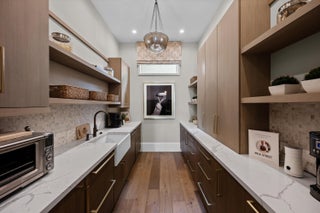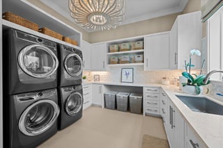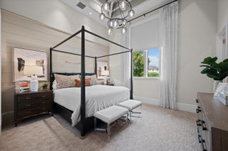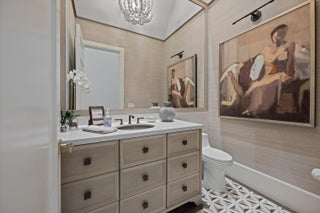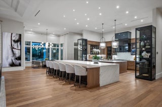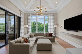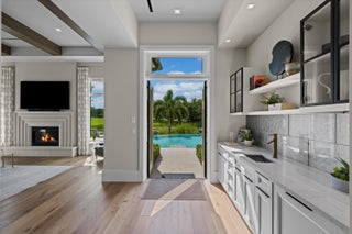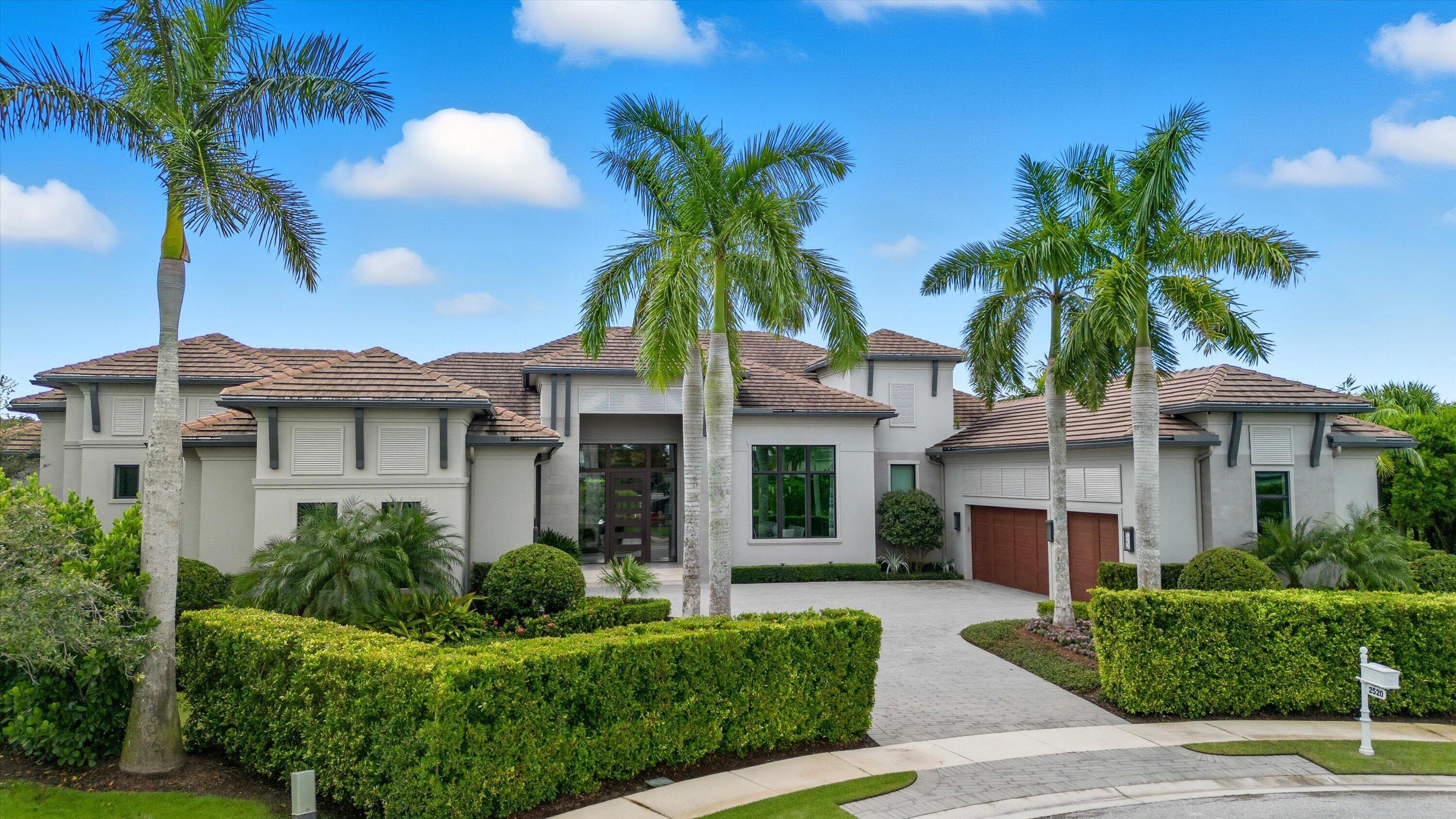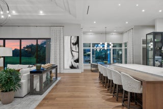 Nestled within the exclusive, gated golf community of Palm Beach Polo, this newly built estate by Stock Custom Homes is set on a waterfront 0.6-acre lot at the end of a tranquil cul-de-sac. The impressive designer pool home spans over 7,000 square feet, featuring 5 bedrooms, 5 full bathrooms, and 2 half baths, along with a split 5-car garage. The exquisite interiors, curated by Beasley and Henley Interior Design, blend elegant furnishings with striking, unique accents to foster a sophisticated yet comfortable ambiance. Highlights include grand tray and coffered ceilings with Oak beams, expansive Oak wood flooring, marble-tiled bathrooms, and top-of-the-line Wolf/Sub-Zero appliances paired with quartz countertops.