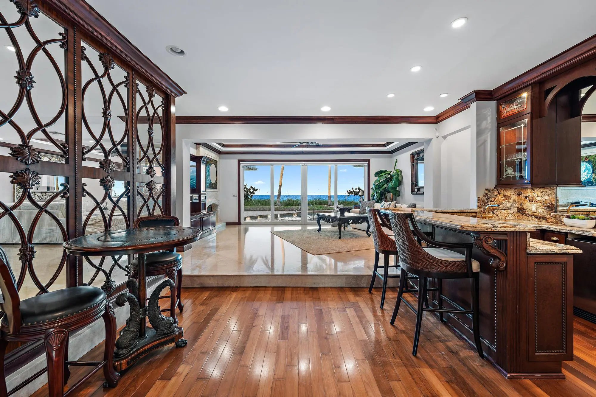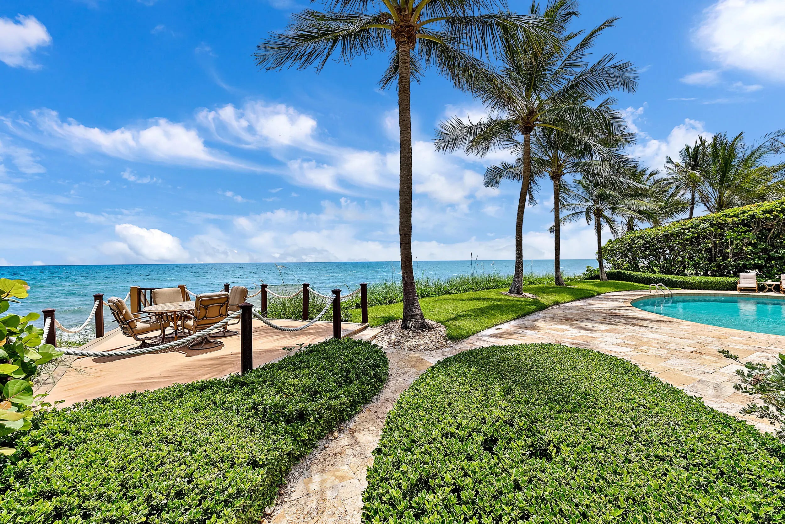 RARE and EXCEPTIONAL blend of beachfront elegance, coupled with the highly sought after Jupiter Island vibe that you've been searching for. 613 S Beach represents the best of both worlds, sitting directly on the sand on the exclusive Jupiter Island beachfront, while maintaining a casual tone with its deeded Intracoastal Waterway water frontage, boat dock, and lift. This luxurious retreat has been fully furnished and is fully equipped to make your South Florida stay effortless. Featuring an open, airy floor plan with five large bedrooms in the main home, each with a generous walk-in closet and large ensuite bathroom, plus an office or den in the main house, AND a detached large one-bedroom guest house! [click for more]