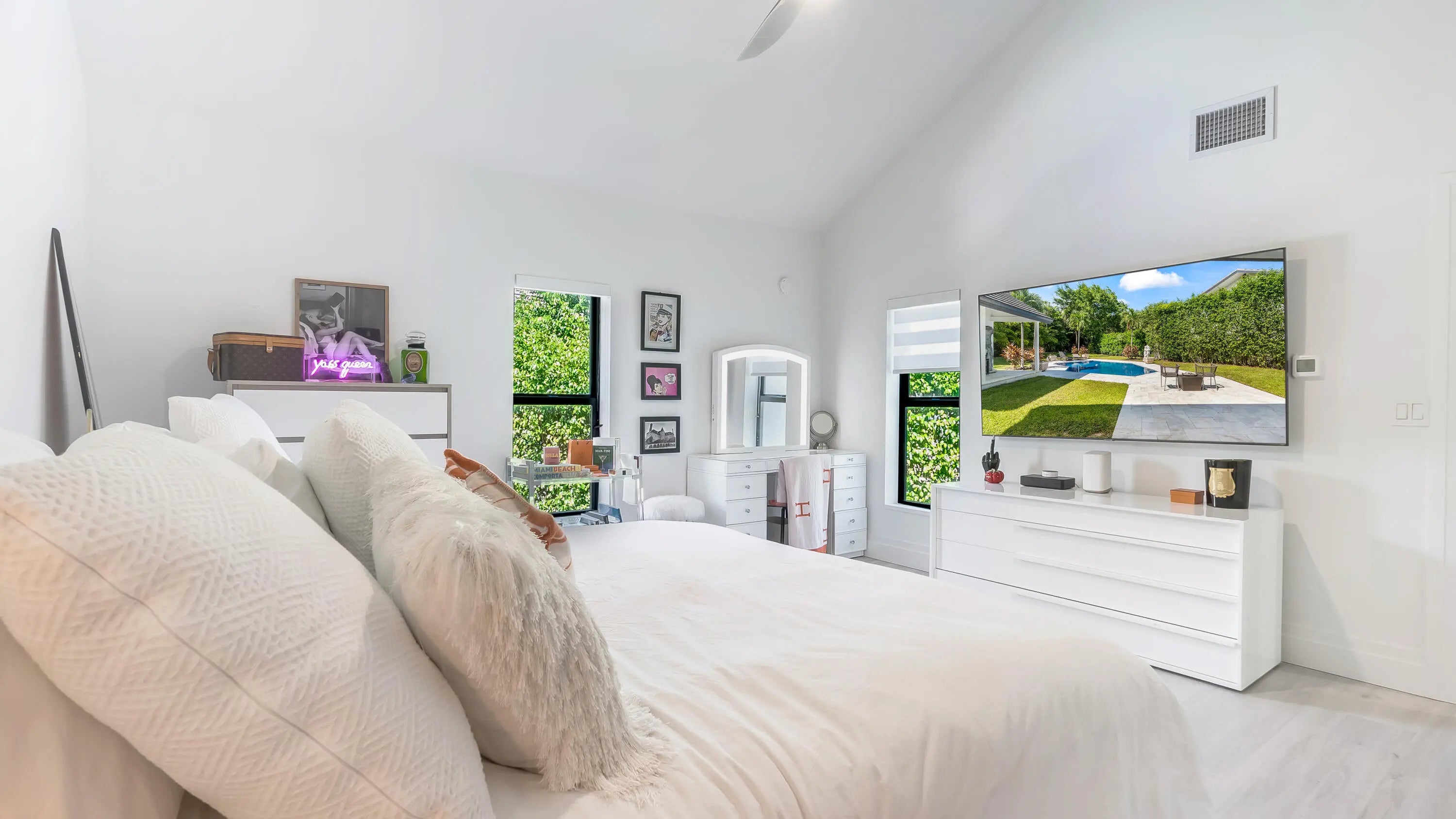 All new 2024 decorator designed work of art! This oversized-lot estate in Boca Raton's exclusive Sanctuary offers split bedroom plan, 4 bedrooms (2 first floor bedrooms), 5 full baths, & 2 half baths. Features include soaring ceilings, quartz countertops, custom cabinetry kitchen, high-end appliances, 2 master baths, bespoke fireplace, abundant storage. Updates include a new roof + Impact glass, new flooring, new en suite bathrooms in all rooms, 3 new AC units, & 2 water heaters. Enjoy a resort-style pool, covered loggia, pool bath, & outdoor shower, perfect for entertaining. The Sanctuary provides 24/7 armed security with land & water patrols, a private marina, pickle, b-ball, tennis courts, and a prime East location walk to beach, The Boca Raton Club, shopping, dining,& private airport!