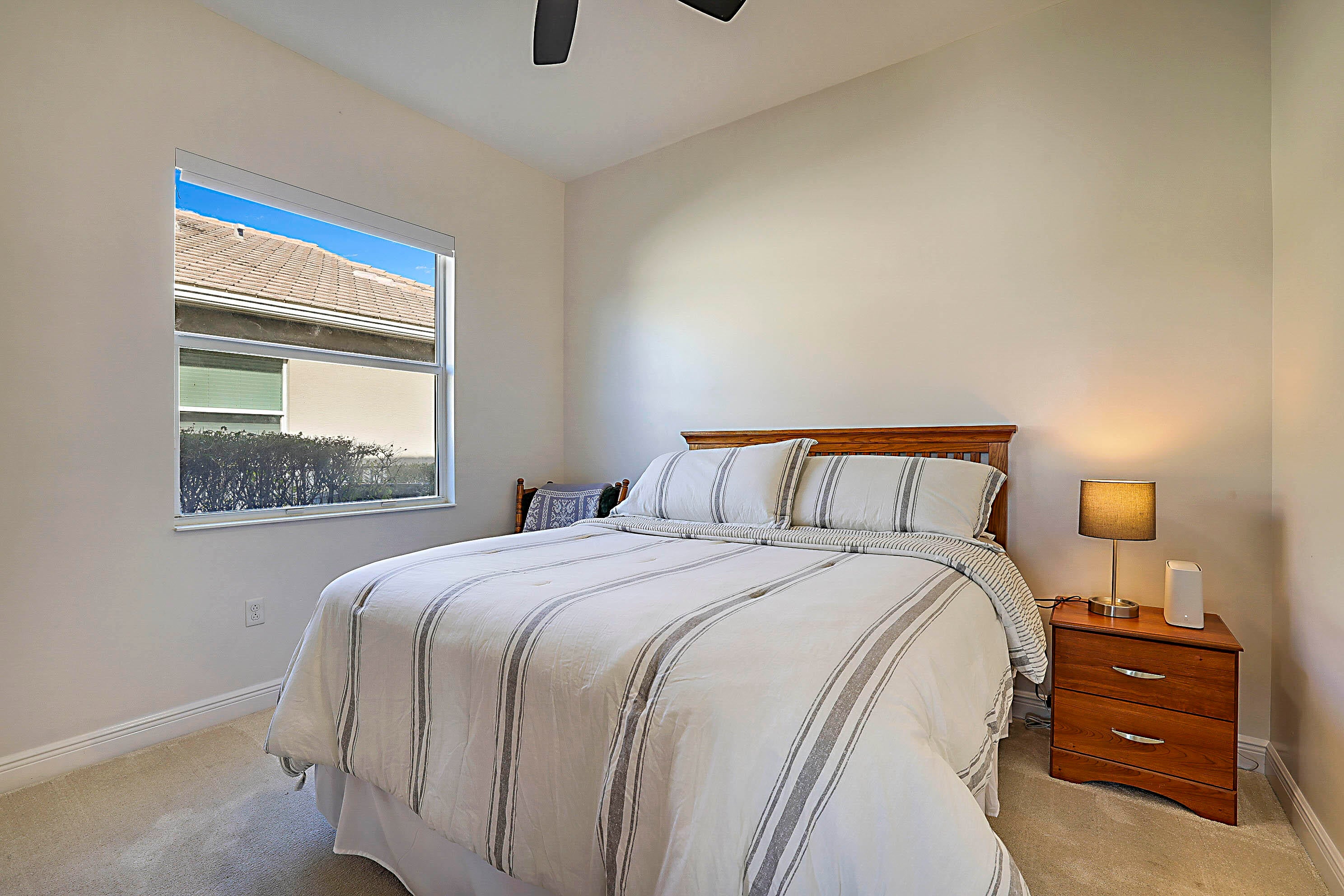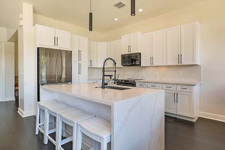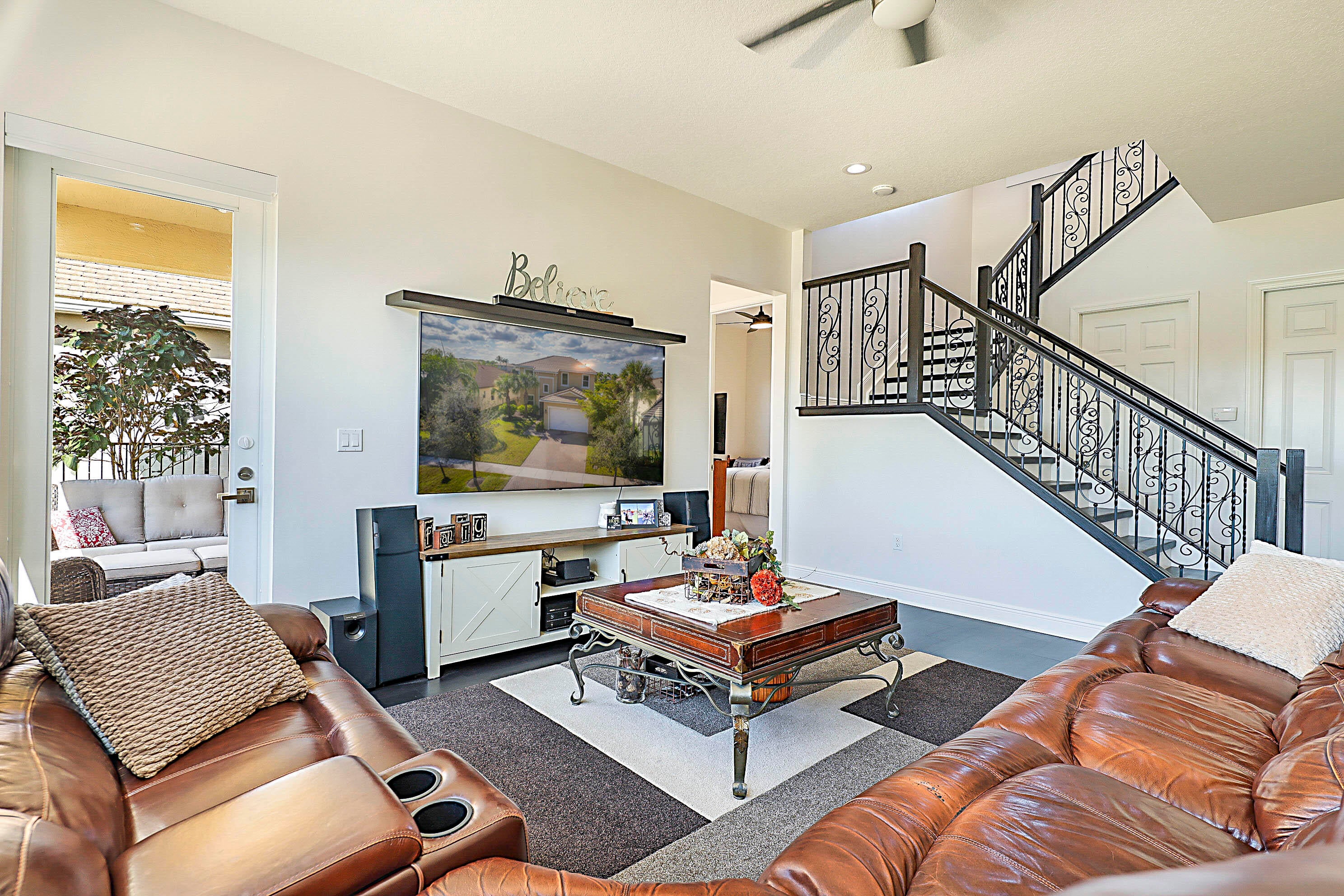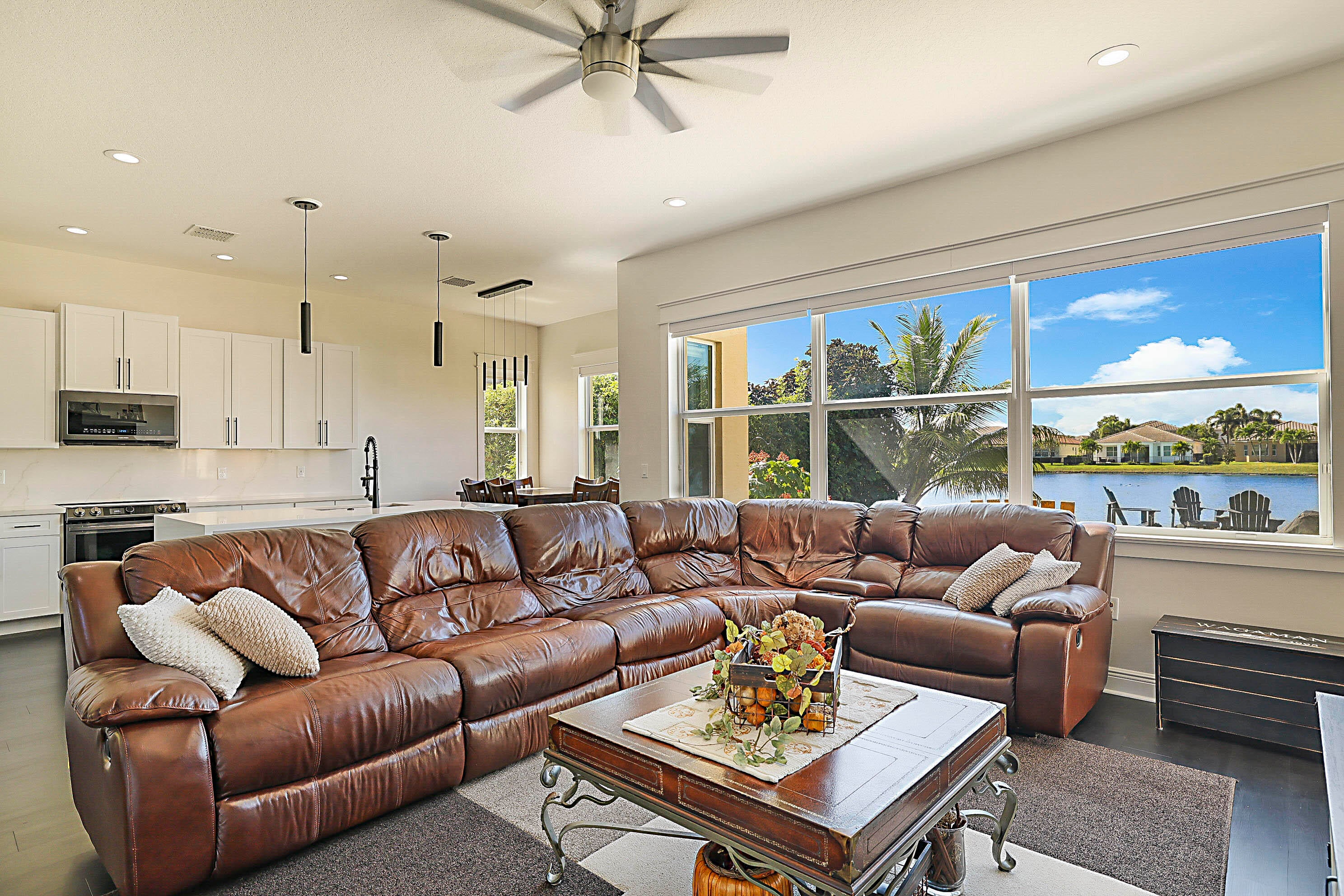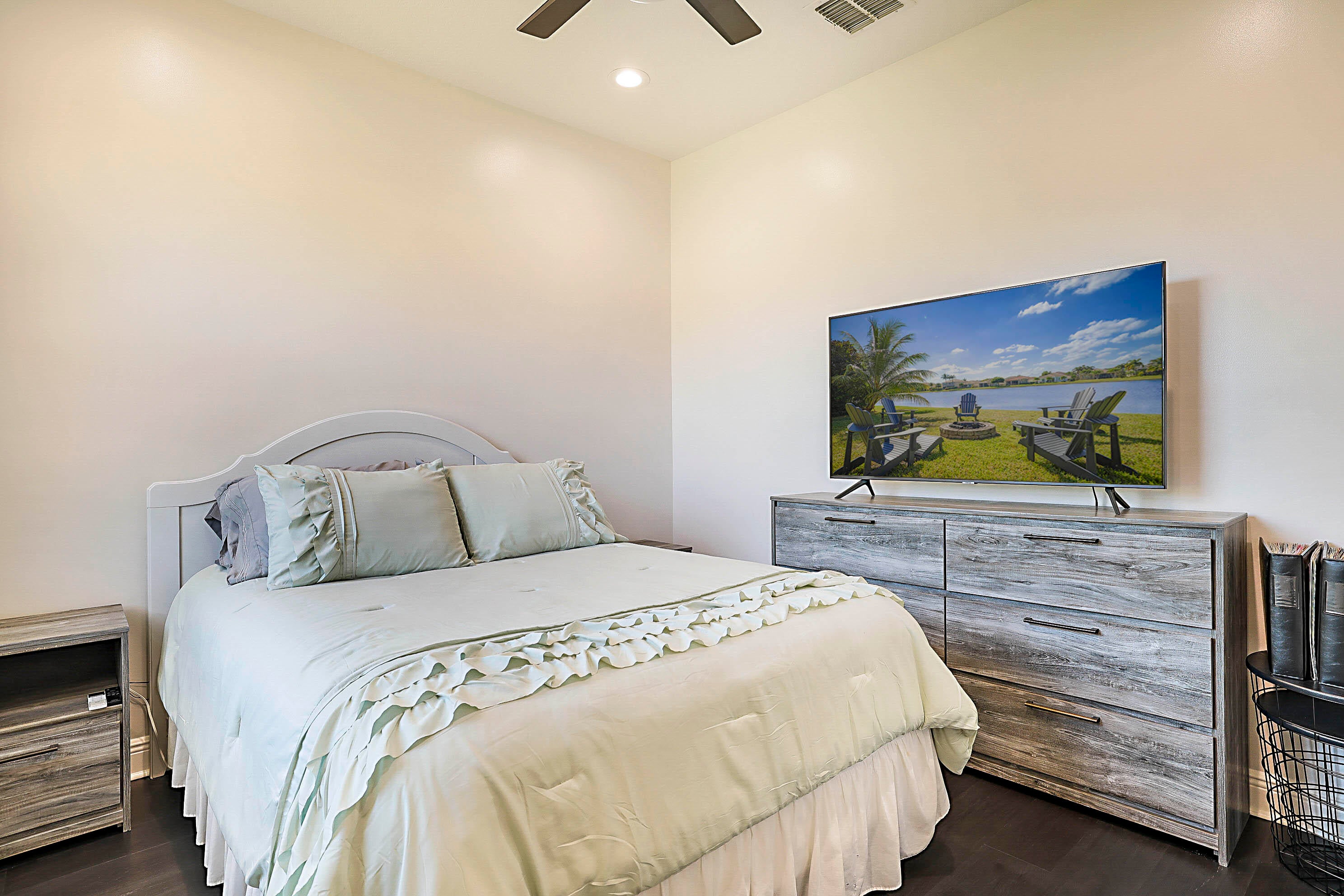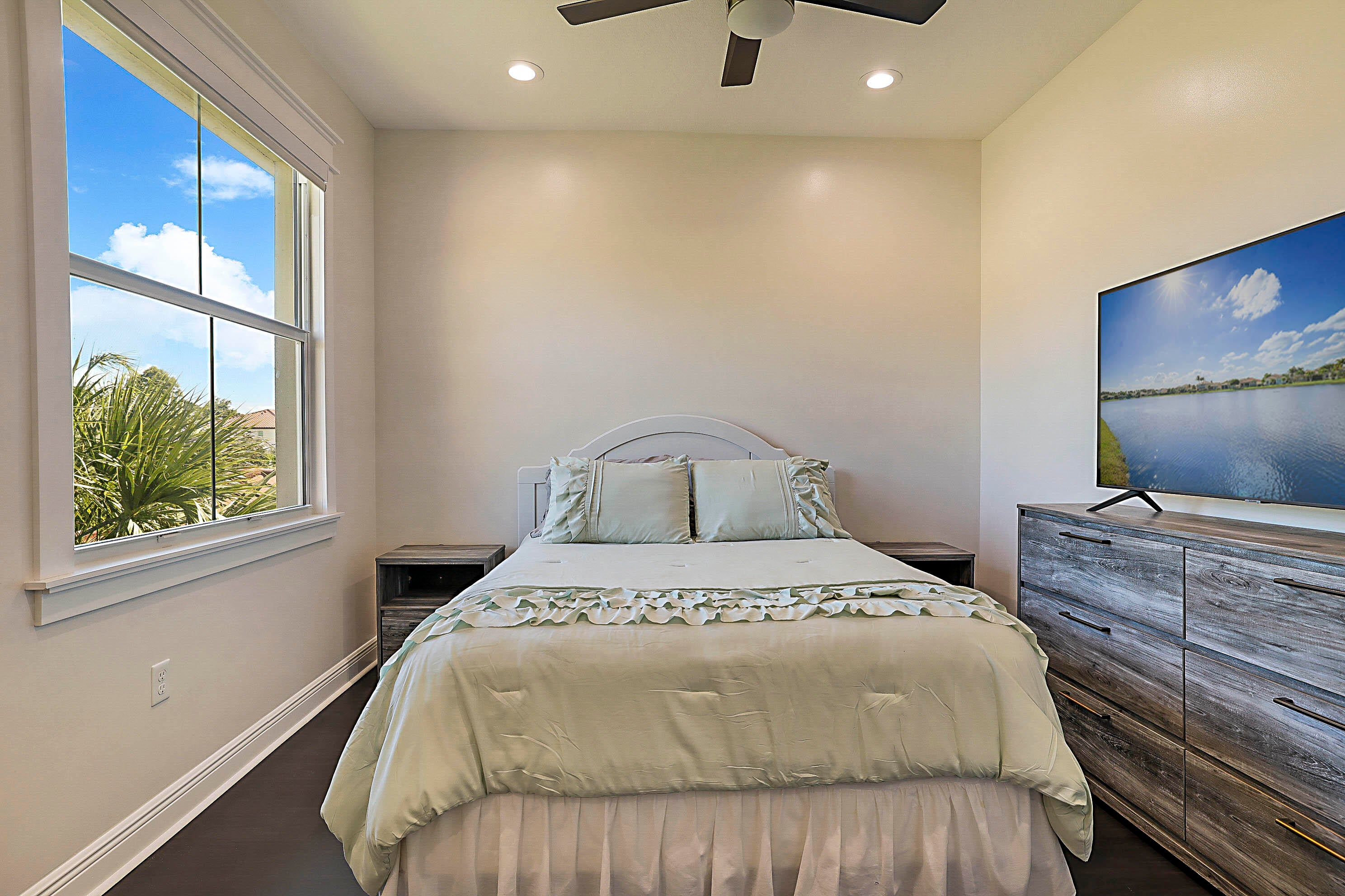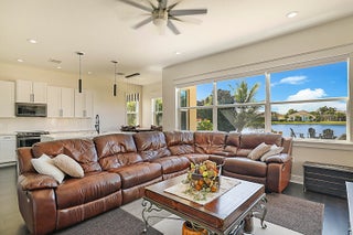 Enjoy stunning lakefront living in this impeccably updated and maintained home featuring upgraded floors, cabinets, quartz counter tops and backsplash, large kitchen island, stainless steel appliances, light fixtures, fans, impact windows and doors, remote control window blinds, travertine patio pavers and an abundance of natural light. Room for a pool and more in the large backyard. Enjoy fishing in the lake and nights around the fire pit. 3 bedrooms+ loft. One bedroom on main floor near cabana bath. Large closets and extra storage space. Close to schools, shopping, dining, entertainment, and recreation. Resort-style amenities include pickleball, pool, hot tub, tennis, clubhouse, gym, splash pad, sand volleyball, walking paths, basketball, and more. Low HOA Must see. Move-in ready.