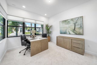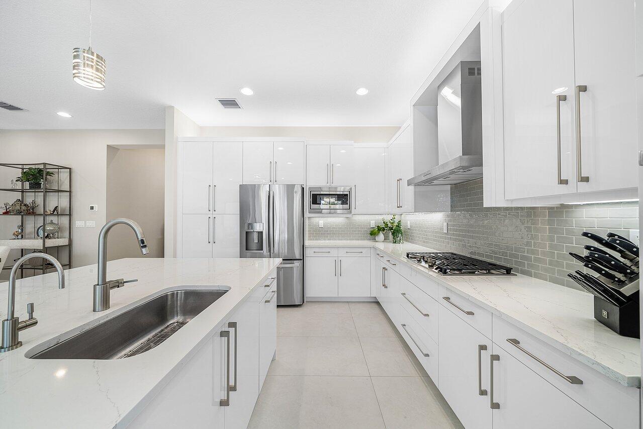 Stunning 3 BD 3 BA home + den and great room in the Valencia Grand 55 plus community, beginning with a bright hallway filled with natural light that reflects softly off white floors and chic fixtures for a warm, modern feel. Just off the entryway sits a flexible den or office space that adapts to any need. The kitchen stands out with high gloss white cabinetry, a beautiful grey tile backdrop, a gas stove, updated appliances, stainless steel finishes, and a spacious central island. Seating at the island creates an easy, welcoming flow that complements both the breakfast area and the separate dining space, allowing the main living areas to feel naturally connected. The living room opens to views of the luxurious pool area, enhancing the calm indoor outdoor atmosphere.Experience resort-style living with a brand-new pool and tranquil waterfall that fills the backyard. The primary bedroom features two large walk in closets, peaceful views of the pool, and a stunning bath with a soaking tub. Two additional bedrooms offer convenient space for guests, work, or hobbies. Outside, the private pool area provides ample room to relax, tan, and enjoy the South Florida sunshine.