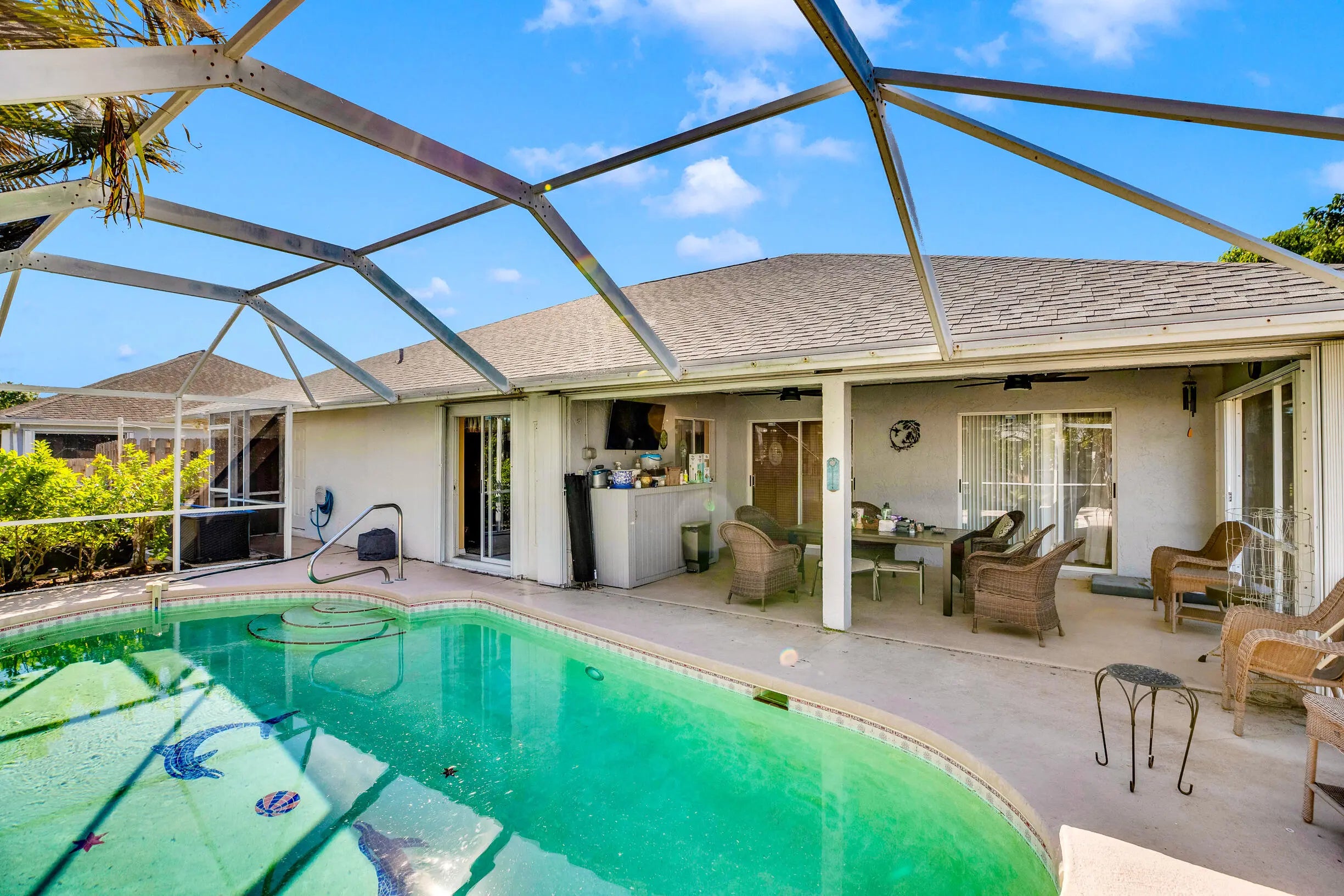 Look at this finely landscaped corner lot located in desirable Southbend! Featuring a solar heated pool and spa under a screened-in porch, a fully fenced yard, and fruit trees. The spacious home boasts tile and carpeted areas with vaulted ceilings. The eat-in kitchen includes appliances, granite countertops, and a breakfast bar next to the formal dining room. An accommodating split bedroom floor plan offers a spacious master bedroom, master bath with Roman tub, and double sinks. Some added features are:Septic services and pumped May 2022New spa pump May 2022House power washed May 20222021 RoofAccordion ShuttersHybrid water heater
