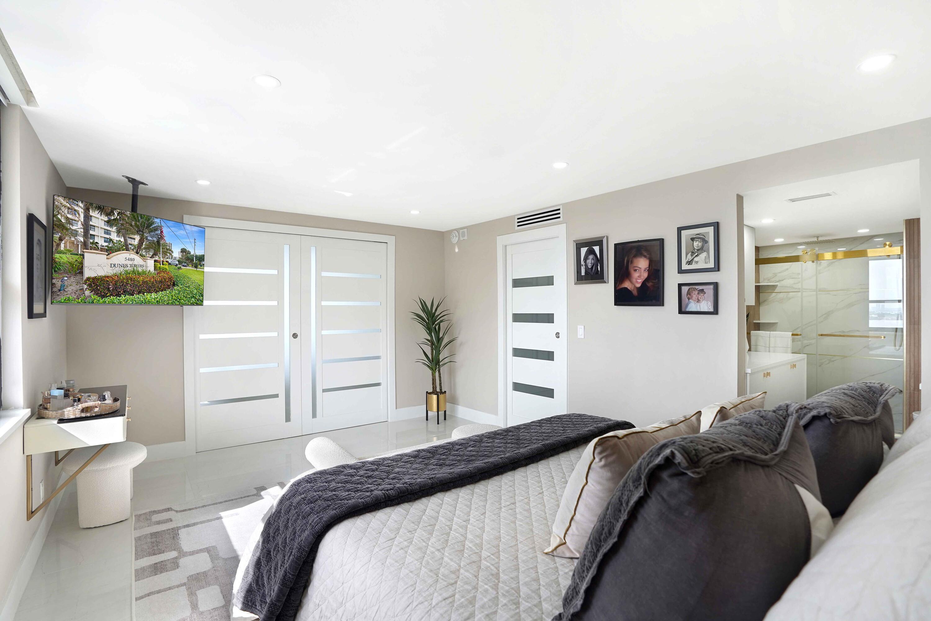 Incredible opportunity to own a fully renovated unit in an amazing boutique beachfront building! The Dunes offers an intimate setting with only four units per floor, direct access to the sand, and incredible ocean-to-Intracoastal views. Inside, the completely renovated condo is truly breathtaking, with no expense spared, featuring brand-new hurricane-impact windows and doors, a new A/C system with updated ducts, and new flooring throughout. The open kitchen overlooks the Intracoastal and is enhanced by custom accent walls and a remote-controlled fireplace. Additional highlights include dropped ceilings with recessed lighting, an in-unit washer and dryer, and a French pocket door in the master suite capturing stunning sunset and water views, while both bathrooms have been remodeled.The community provides a pool, fitness center, lounge, extra storage, beach access, and an advanced HVAC UV light sanitizer system for cleaner air, with the HOA covering cable, building insurance, pest control, parking, water, and more. Dunes Towers just steps from the beach and the second complex from the north end of Singer Island, offers easy access to top shops, restaurants, area clubs, Palm Beach, and PBIA, with all building restoration assessments already paid by the seller.