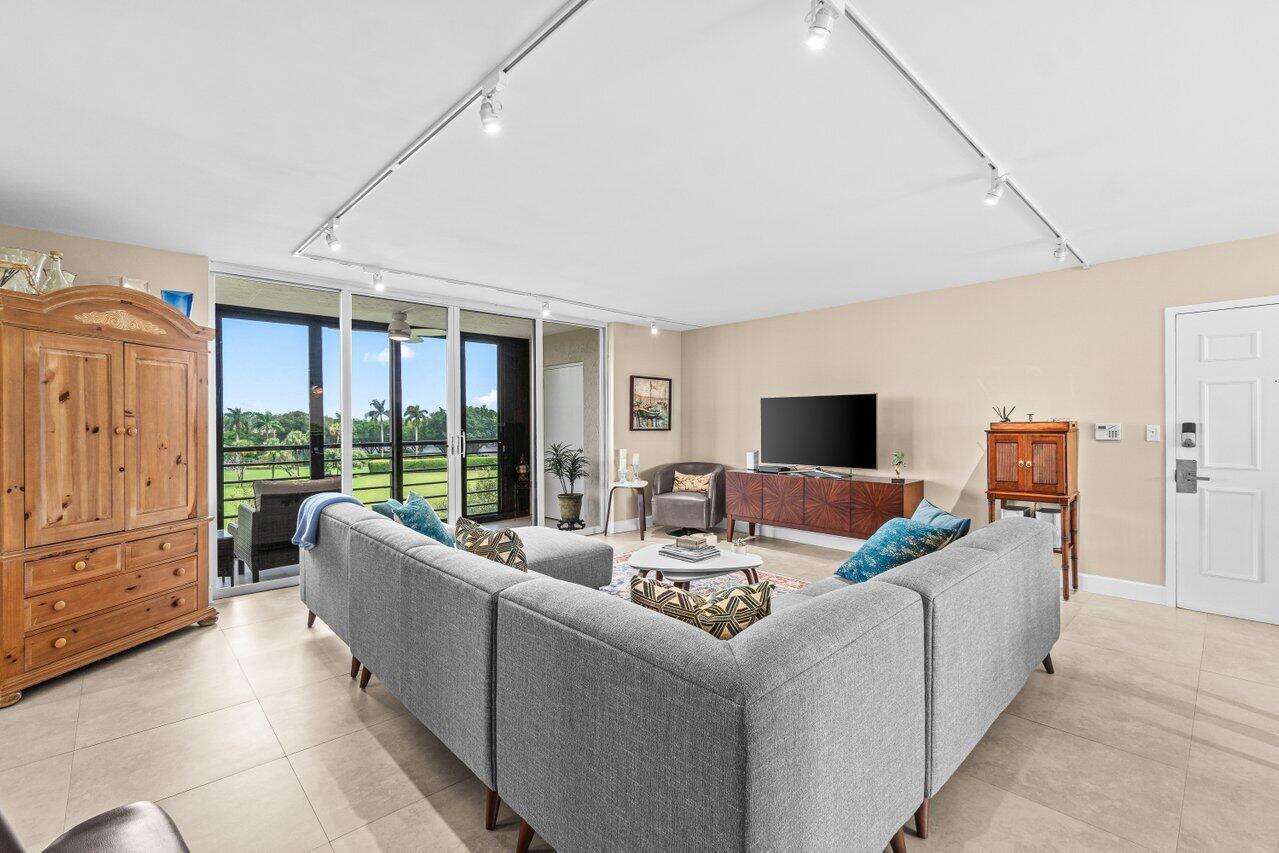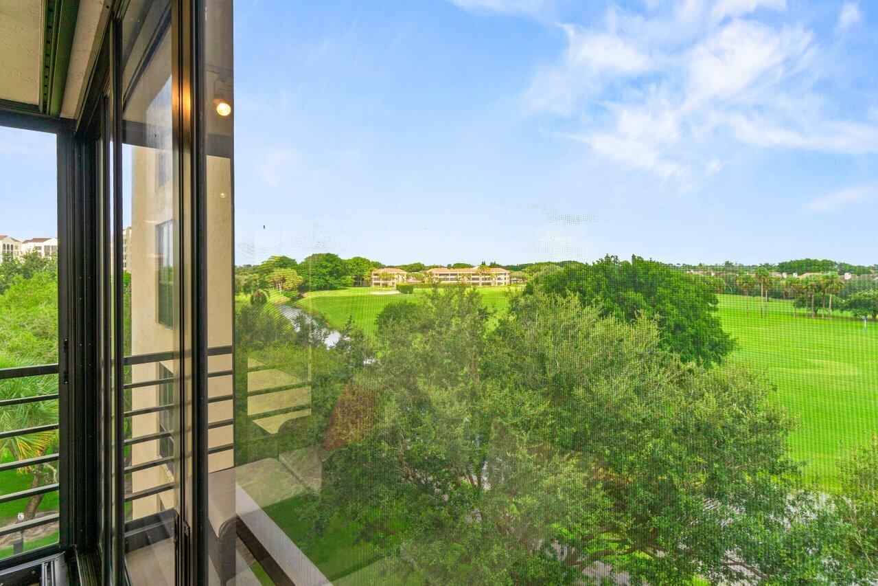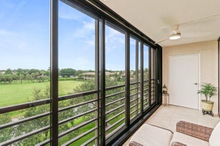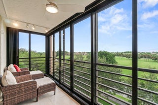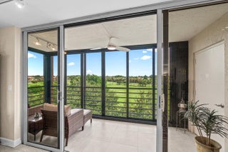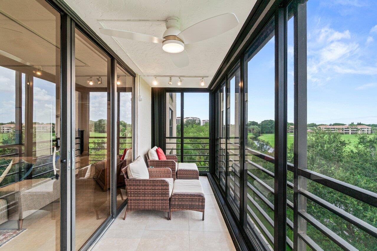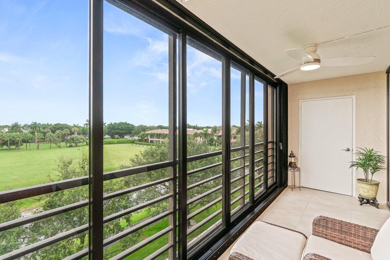 High-floor Promenade condo with 3 bedrooms, 2.5 baths, and stunning golf course and northern views. Expanded living space with impact glass. Second patio is glass-enclosed with shutters and screens. Beautifully updated throughout with large tile floors, smooth ceilings, and renovated kitchen and baths. Den/third bedroom features a stylish barn door. Kitchen offers white cabinets, granite counters, stainless appliances, French-door fridge, and custom backsplash. Electrical panel replaced; A/C 2022; updated water heater and washer/dryer. Primary suite has built-in closets and an updated bath with double sinks and Corian counters. Plantation shutters, upgraded powder room, and large patio storage. Enjoy a pool, on-site manager, exercise room, meeting room, walking paths and more.