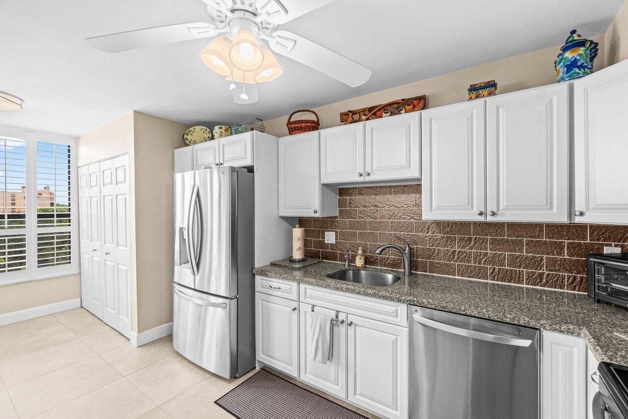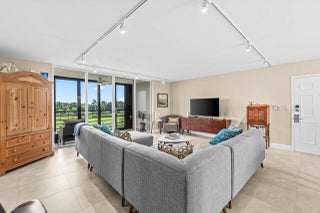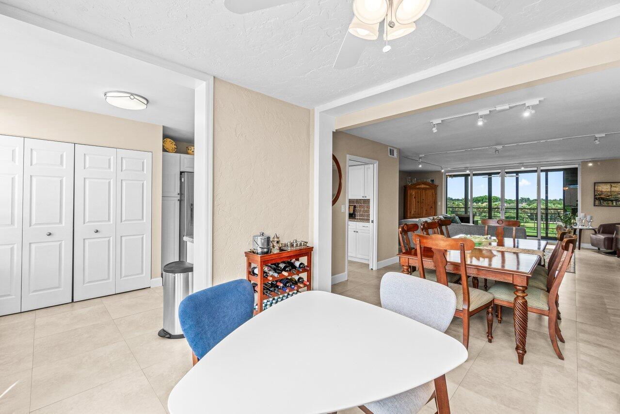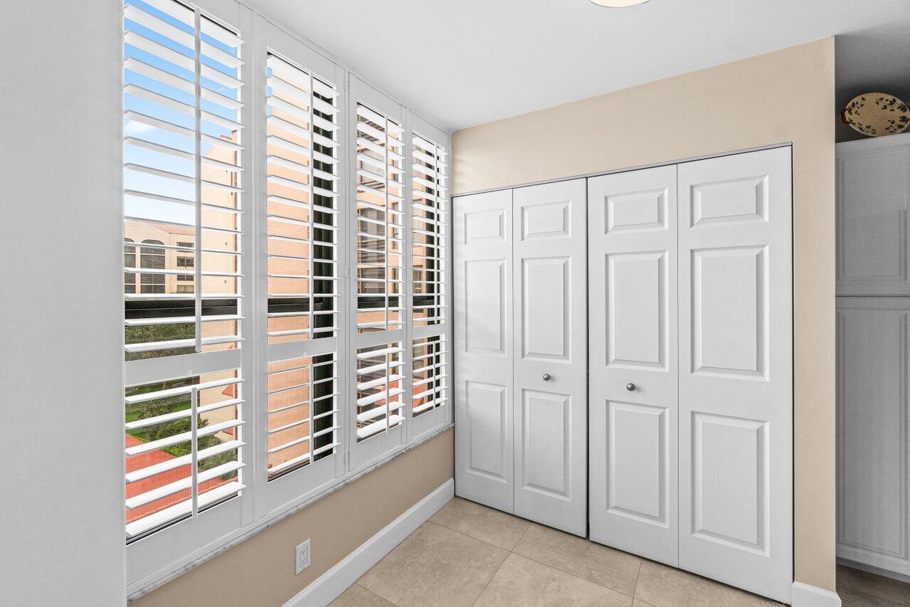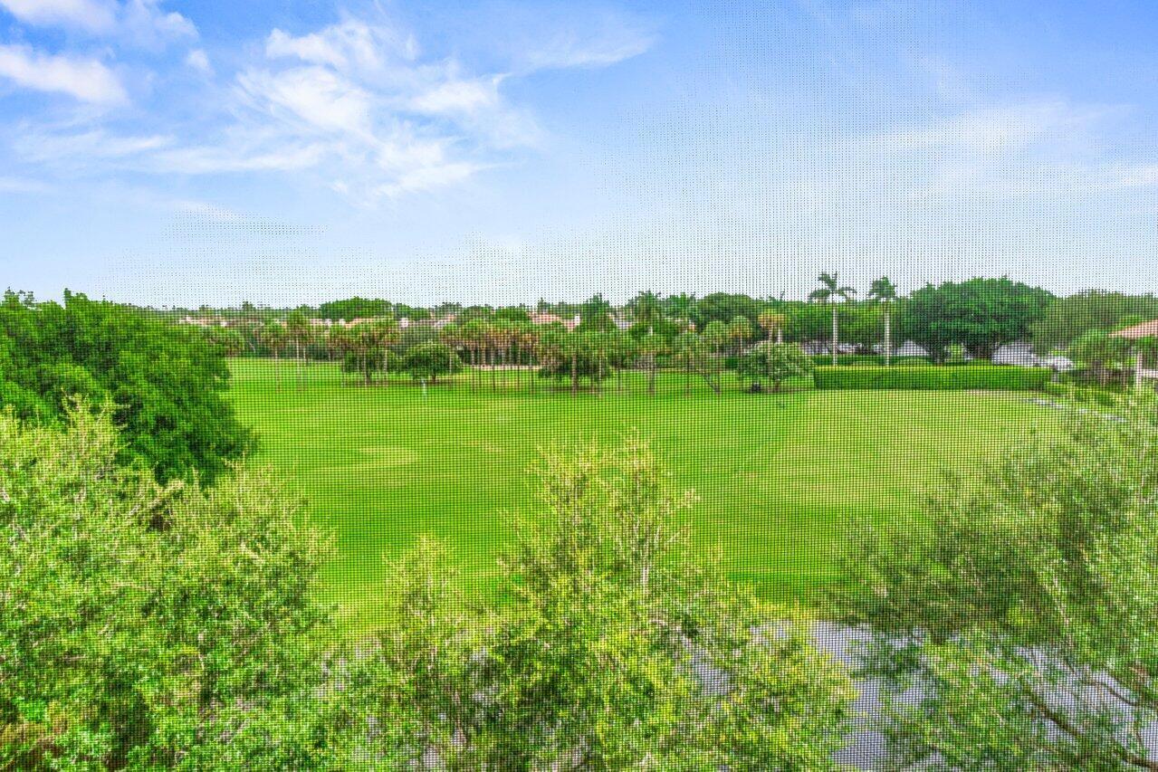 High-floor Promenade condo with 3 bedrooms, 2.5 baths, and stunning golf course and northern views. Expanded living space with impact glass. Second patio is glass-enclosed with shutters and screens. Beautifully updated throughout with large tile floors, smooth ceilings, and renovated kitchen and baths. Den/third bedroom features a stylish barn door. Kitchen offers white cabinets, granite counters, stainless appliances, French-door fridge, and custom backsplash. Electrical panel replaced; A/C 2022; updated water heater and washer/dryer. Primary suite has built-in closets and an updated bath with double sinks and Corian counters. Plantation shutters, upgraded powder room, and large patio storage. Enjoy a pool, on-site manager, exercise room, meeting room, walking paths and more.