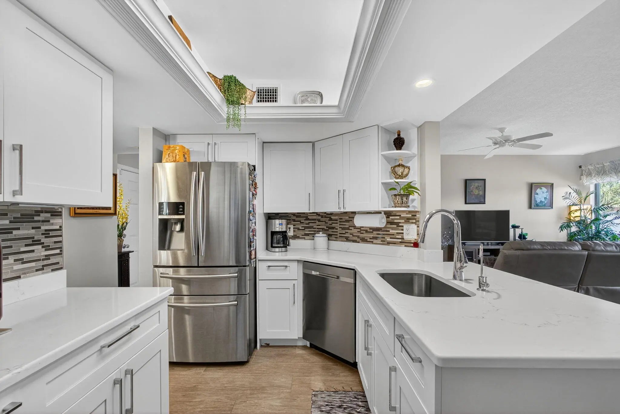 Experience sophisticated coastal living in this elegantly upgraded waterfront residence in the highly coveted Sea Oats of Juno Beach. Overlooking a tranquil preserve and shimmering pond, this 2BD, 2BA home with a 1-car garage features a screened-in porch, perfect for enjoying refreshing ocean breezes and just a short walk to the beach. Inside, the chef-inspired kitchen showcases quartz countertops, premium Samsung appliances, soft-close cabinetry, and designer lighting accenting a crown-trimmed tray ceiling.The primary suite is a serene retreat with preserve views and a beautifully renovated bath, while the guest suite offers custom closet built-ins and fresh modern finishes. Additional luxury upgrades include PGT impact windows (2020), new HVAC and water heater (2025),