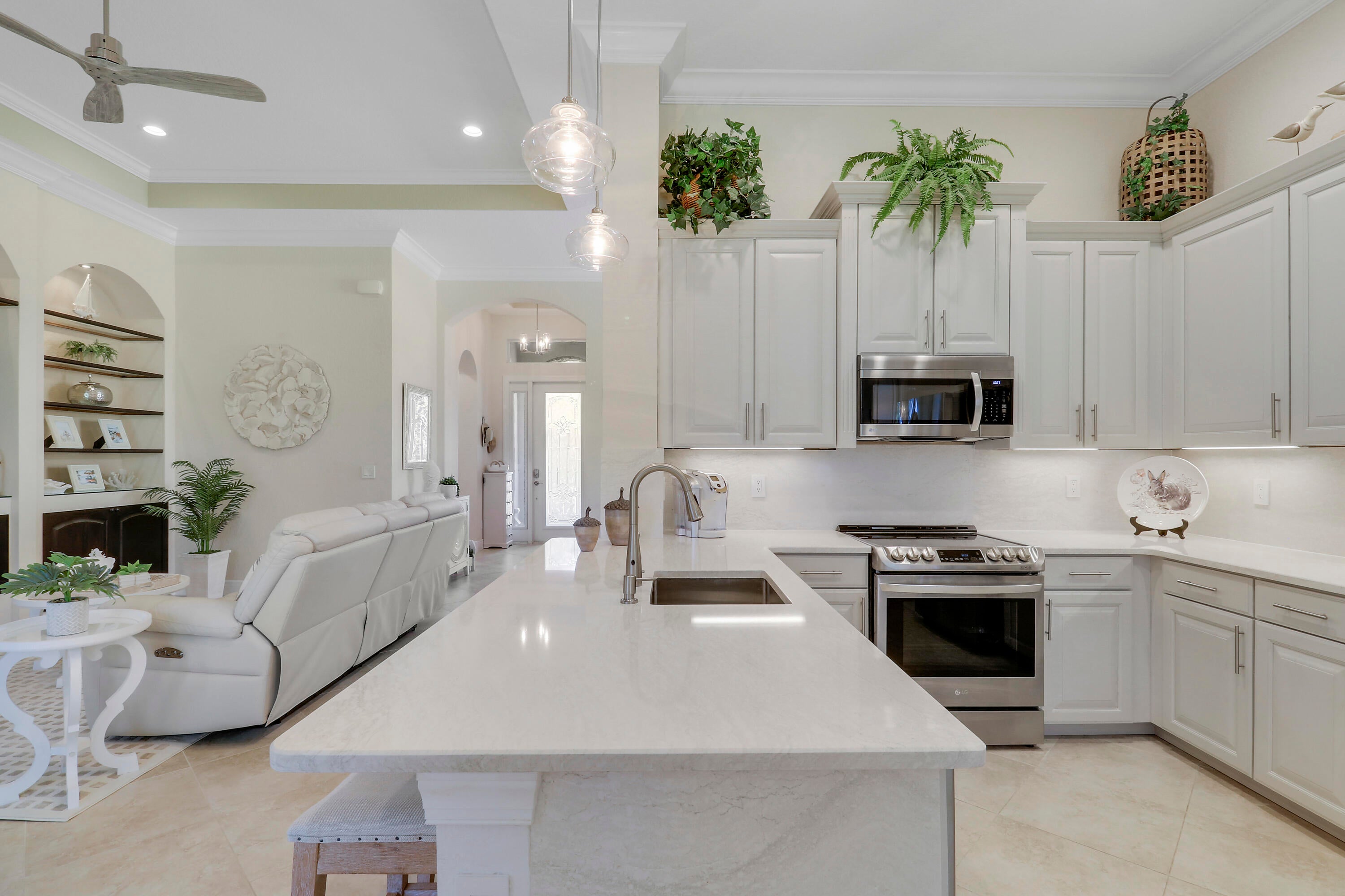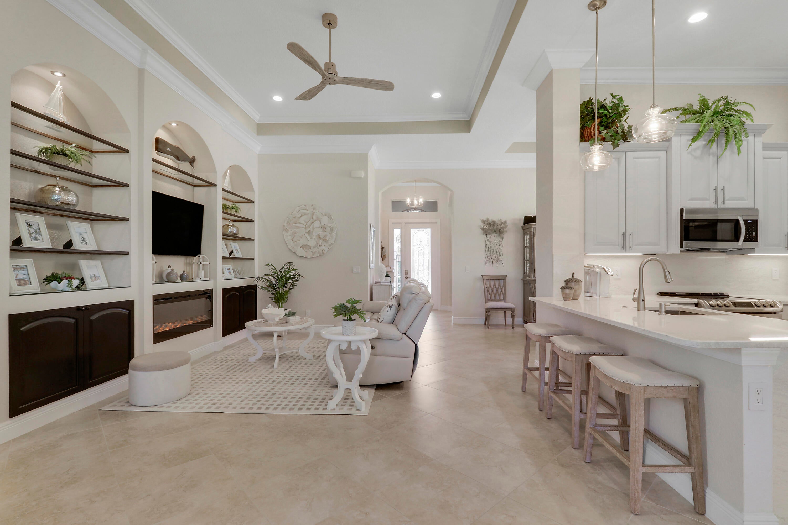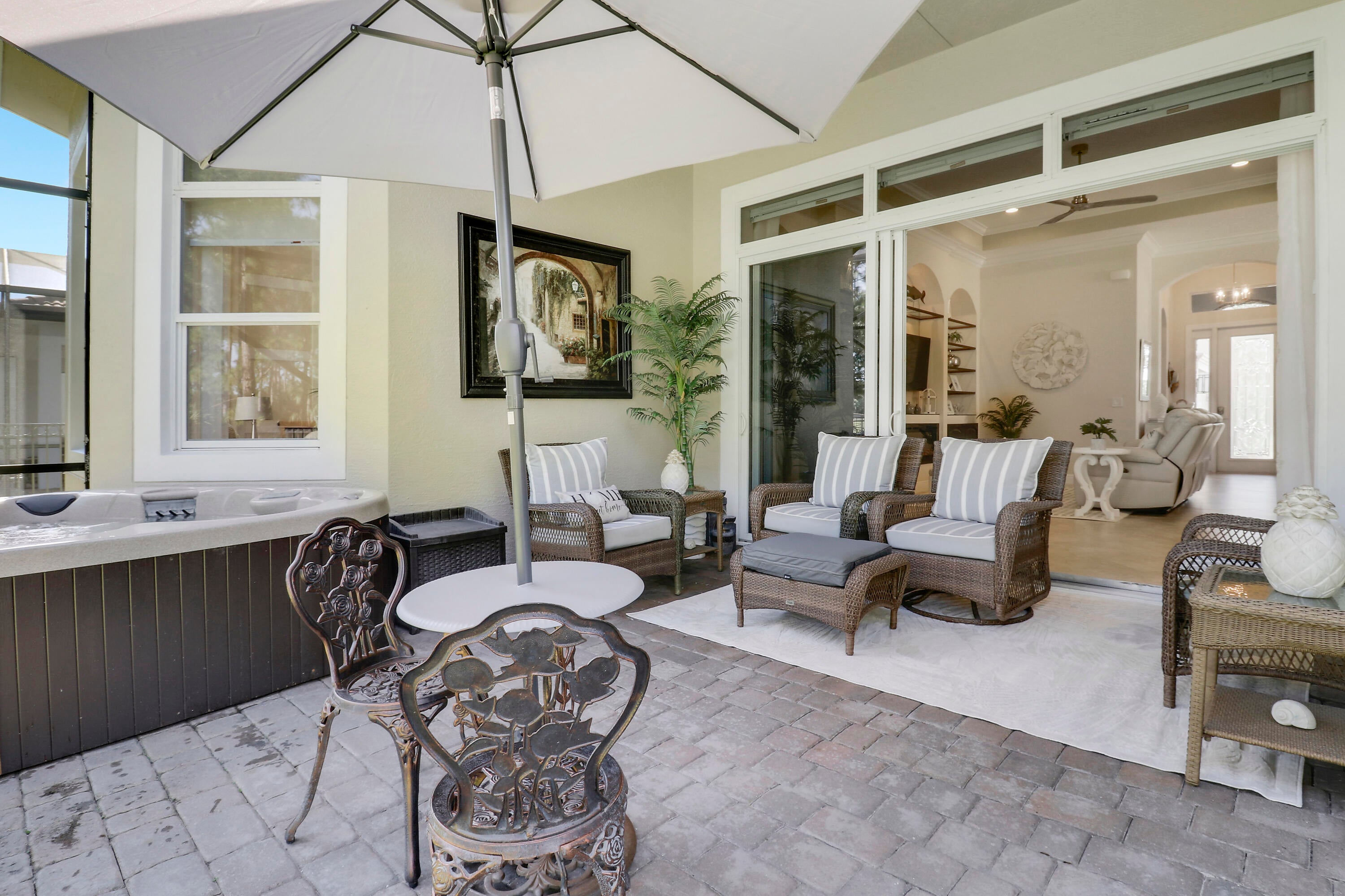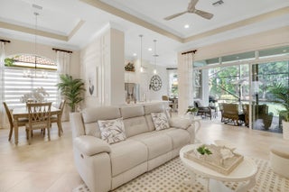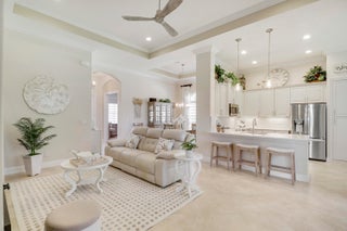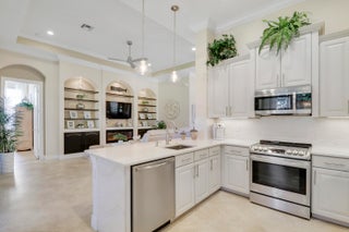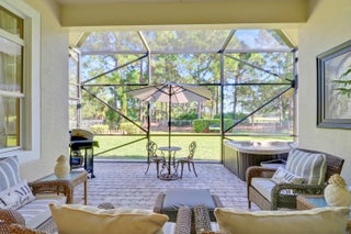 LOCATION, LOCATION, LOCATION! PRIDE OF OWNERSHIP GLEAMS THROUGHOUT THIS UPDATED HOME NESTLED ON ONE OF VERANO'S MOST DESIRABLE STREETS! Enjoy golf views from this 2BR+Den/2BA/2CG 'Isabella' plan which has many special features including hard surface flooring throughout, updated kitchen & bathrooms, updated lighting, custom woodwork details, living room with wall to wall built in unit including an electric fireplace, elegant window treatments, updated appliances, impact glass windows & doors, decorative glass entry front door, fenced yard, expanded screened patio with hot tub, NEW WH in 2019, fresh exterior paint in 2025, private mailbox and more! The moment you step through the front door of this tranquil home you will notice the keen attention to detail throughout.The kitchen has light cabinetry, quartz counters and backsplash, under cabinet lighting, newer stainless steel appliances, pendant lighting, pantry cabinet with rollouts and a charming breakfast nook overlooking the back yard and serene golf course views. The master bedroom suite serves as a relaxing retreat after a busy day with dual closets and spa-like ensuite with dual quartz topped vanities, frameless shower, soaking tub, timeless vanity lighting and neutral wallpaper accent. The guest bedroom is adjacent to the updated hall bathroom. Working from home? Not a problem! The spacious den with double glass door entry overlooks the front yard and has built in corner desk unit with attached cabinetry and countertop for storage. Laundry room with newer washer and dryer in 2019, shiplap accent wall and utility sink almost makes laundry an enjoyable chore! Rounding out this beautiful home, is the outdoor living space with expanded screened lanai, corner hot tub, fully fenced yard and park-like setting. Perfectly situated to enjoy golf views but still maintain privacy, you will not be disappointed! Verano is an amenity rich resort style community with a 27 court pickleball center, walking paths, multiple community pools & fitness centers, sauna, dog park, tennis courts, social clubhouse with activities and more. HOA dues include basic cable, internet, alarm monitoring, lawn care, common area maintenance, gated security and access to all amenities. For avid golfers, there is a cart path from the community leading to the PGA Golf Club (membership is optional and availability varies). This community truly has something for everyone, call today to view!