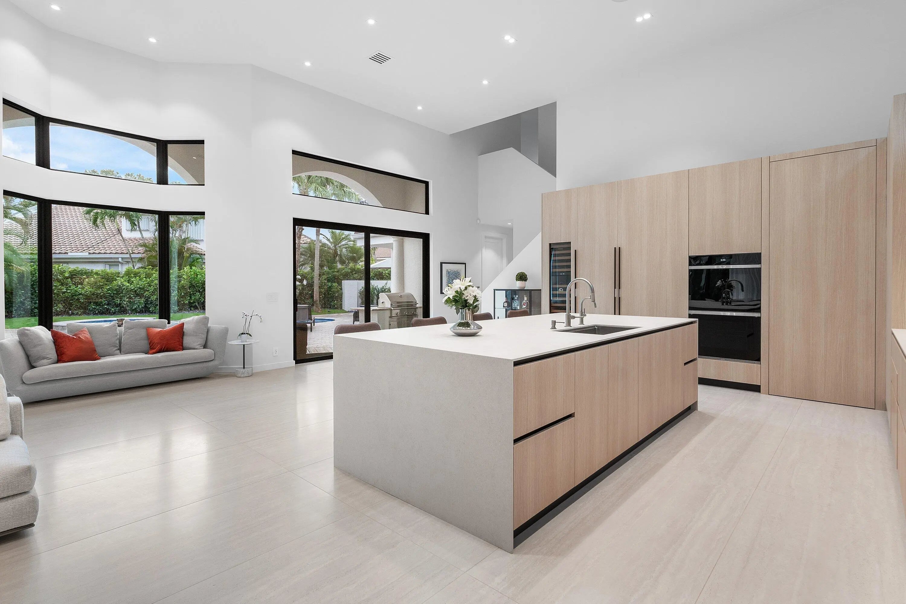Located in the prestigious Central Boca community of Seasons, this exceptional home was renovated in 2025, and sits on a private, spacious lot. The home offers a phenomenal floor-plan with a downstairs Primary bedroom, which is a luxurious retreat with a spa-like bathroom and two walk-in closets. The Primary wing features an adjacent, separate home office with a beautiful view of the pool. On the other wing of the home, there is one guest bedroom and full bath downstairs (also serving as a cabana bath), and three beautifully designed bedrooms upstairs, plus a loft. Upon entrance, you are swept away with the breathtaking vaulted ceilings, large format tiles and dream Italian kitchen by Mia Cuccina- stunning white oak cabinetry and porcelain countertops and Sub Zero paneled appliances.