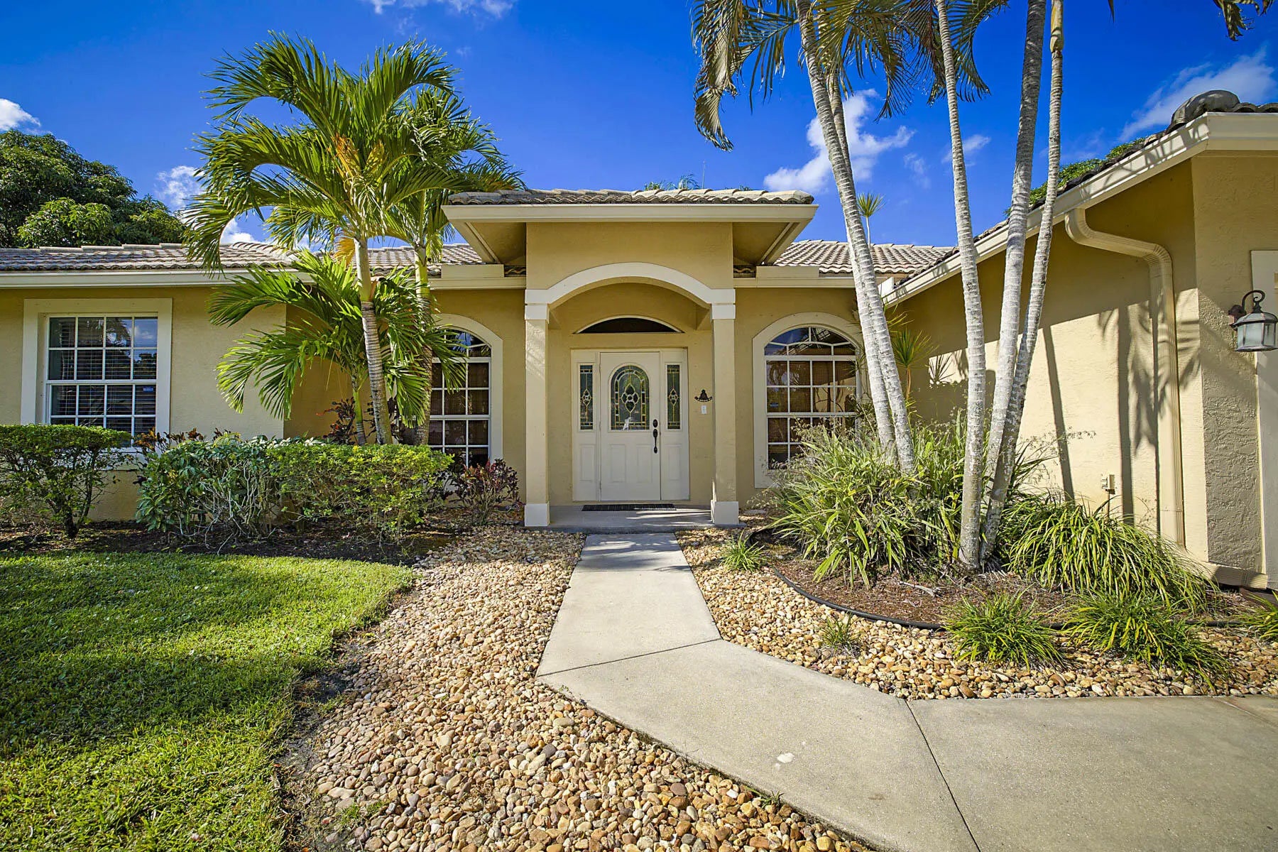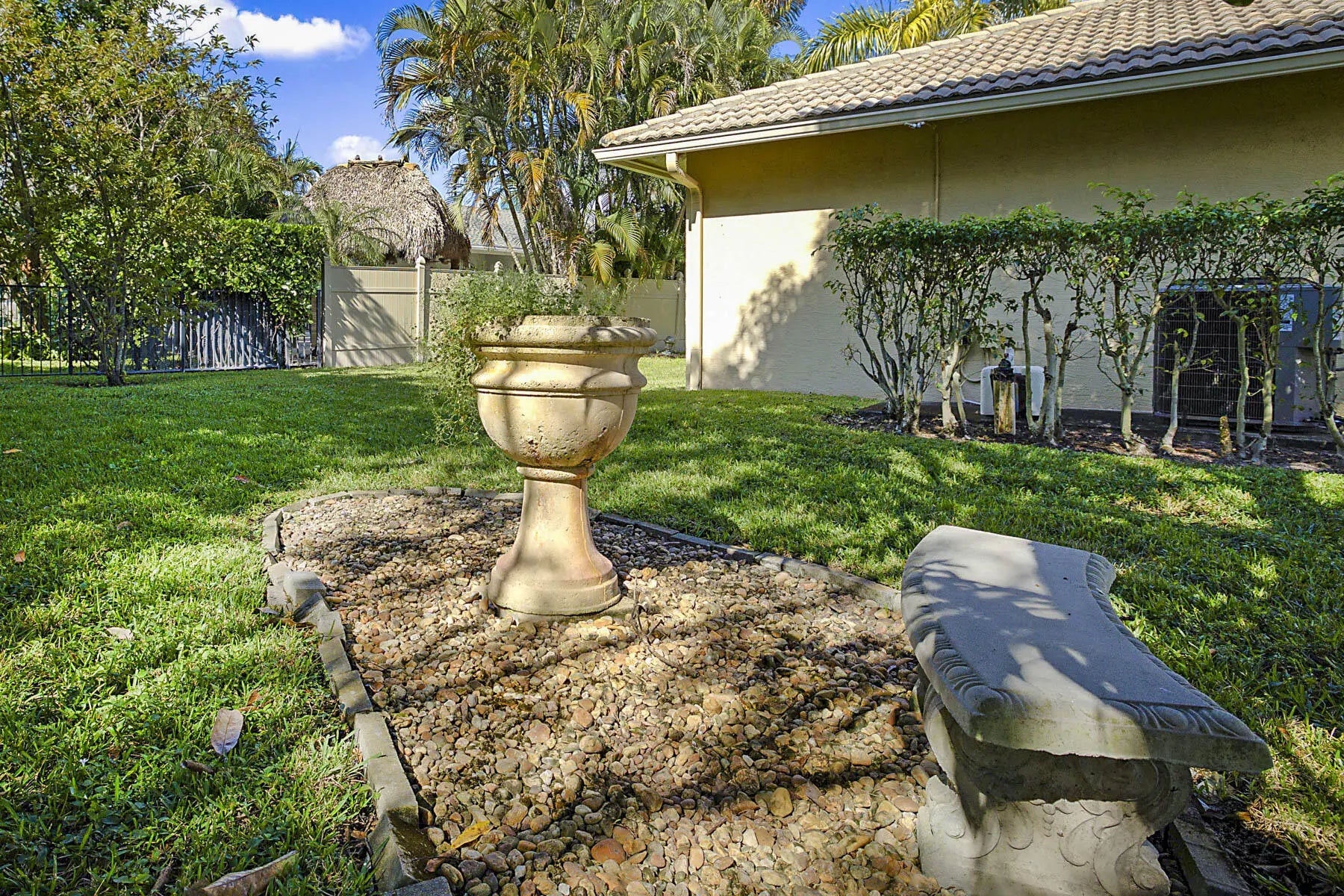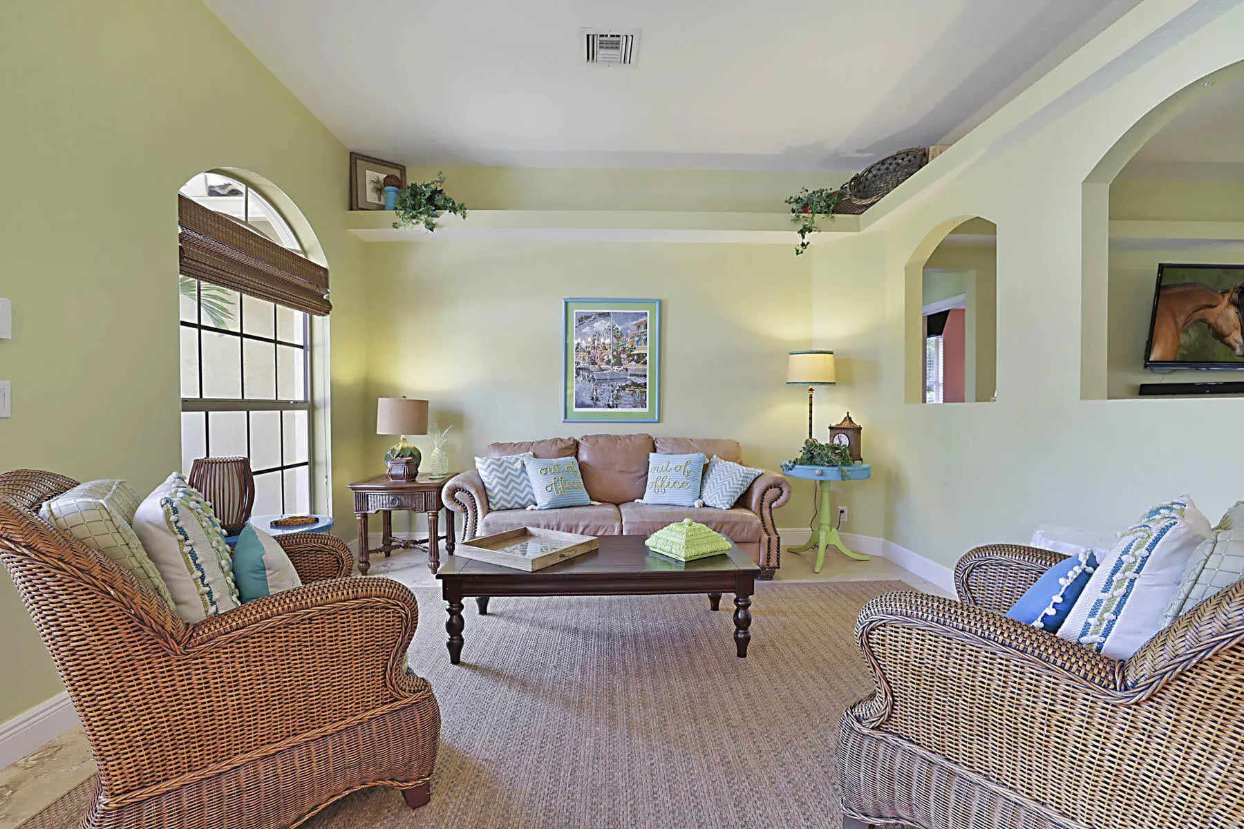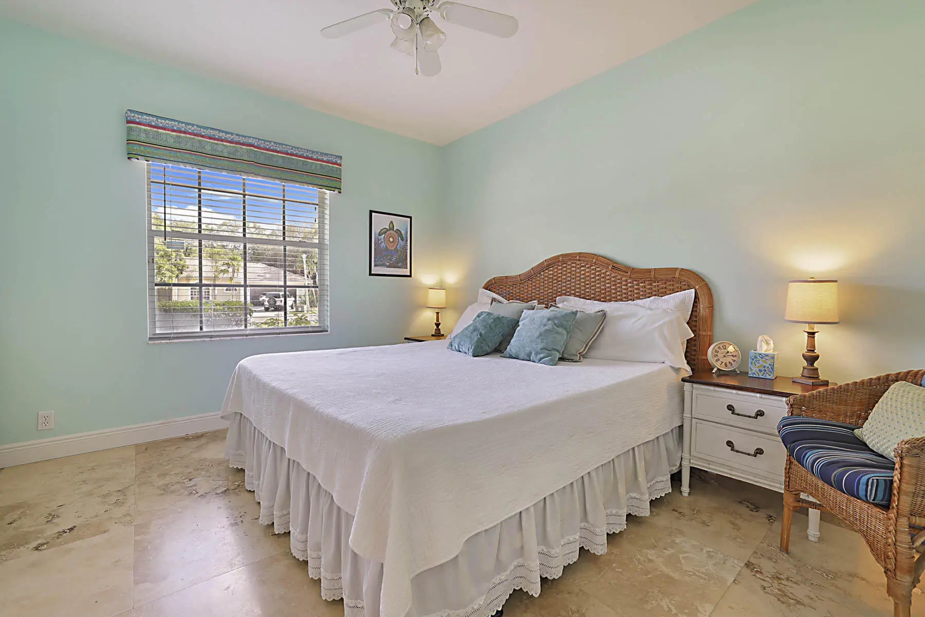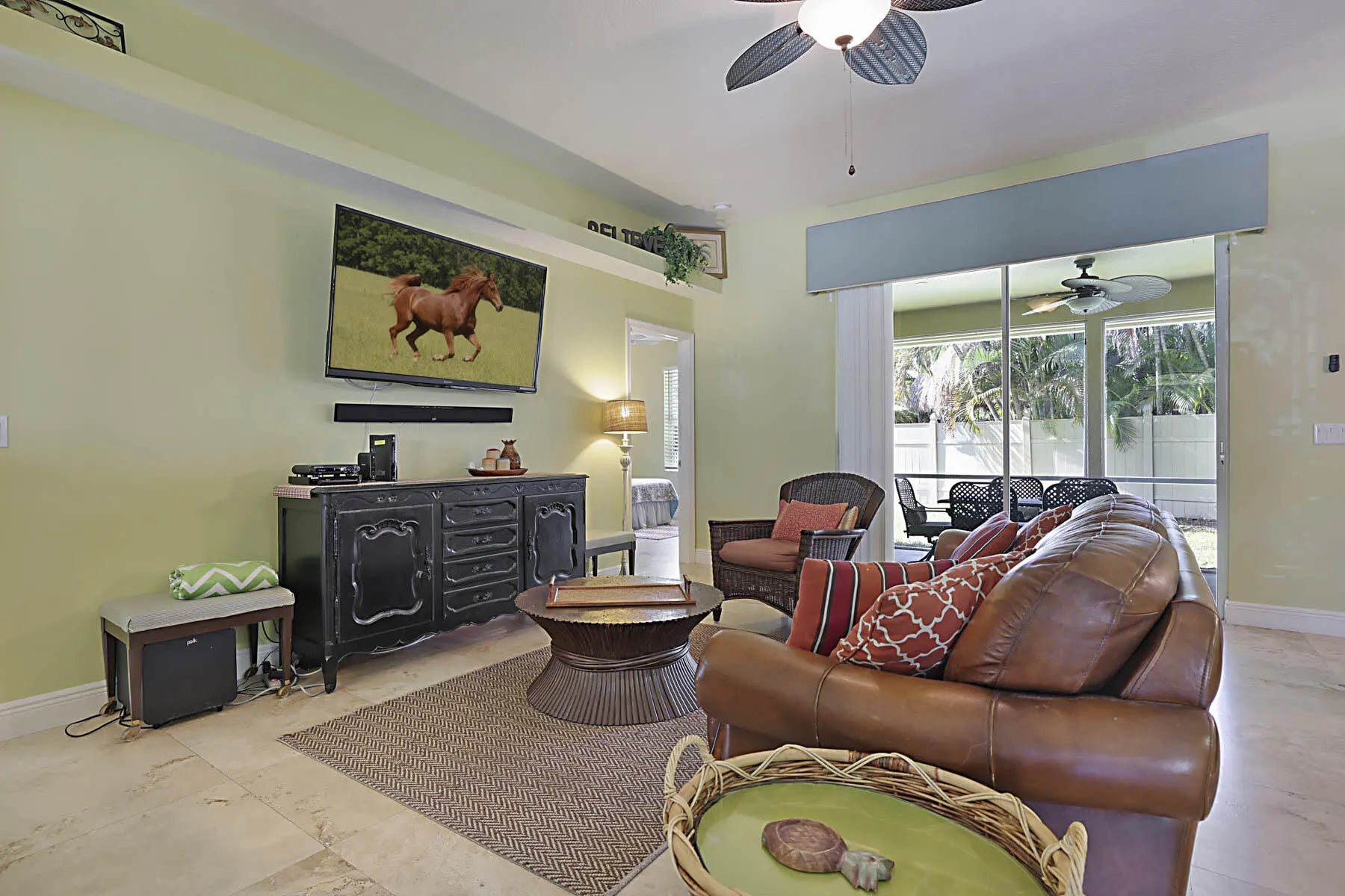 Prime location! Fully furnished 4/2/2 luxury rental located on a peaceful cul-de-sac. This beautifully appointed home features travertine flooring throughout, tumbled-stone baths, & tropical furnishings. Bedrooms are generously sized with 3 king beds & 1 queen bed, each with its own flat-screen TV. The granite kitchen offers stainless steel appliances, ample counter space, a breakfast area, & a pantry. Enjoy the private covered patio for morning coffee or evening relaxation. The primary suite includes a large walk-in closet & ensuite bath with a Jacuzzi whirlpool tub. The family room is equipped with a 60'' Smart TV and a wireless printer/scanner for guest convenience. Wi-Fi & cable TV are included, along with an allowance for water & electric. Don't miss it!
