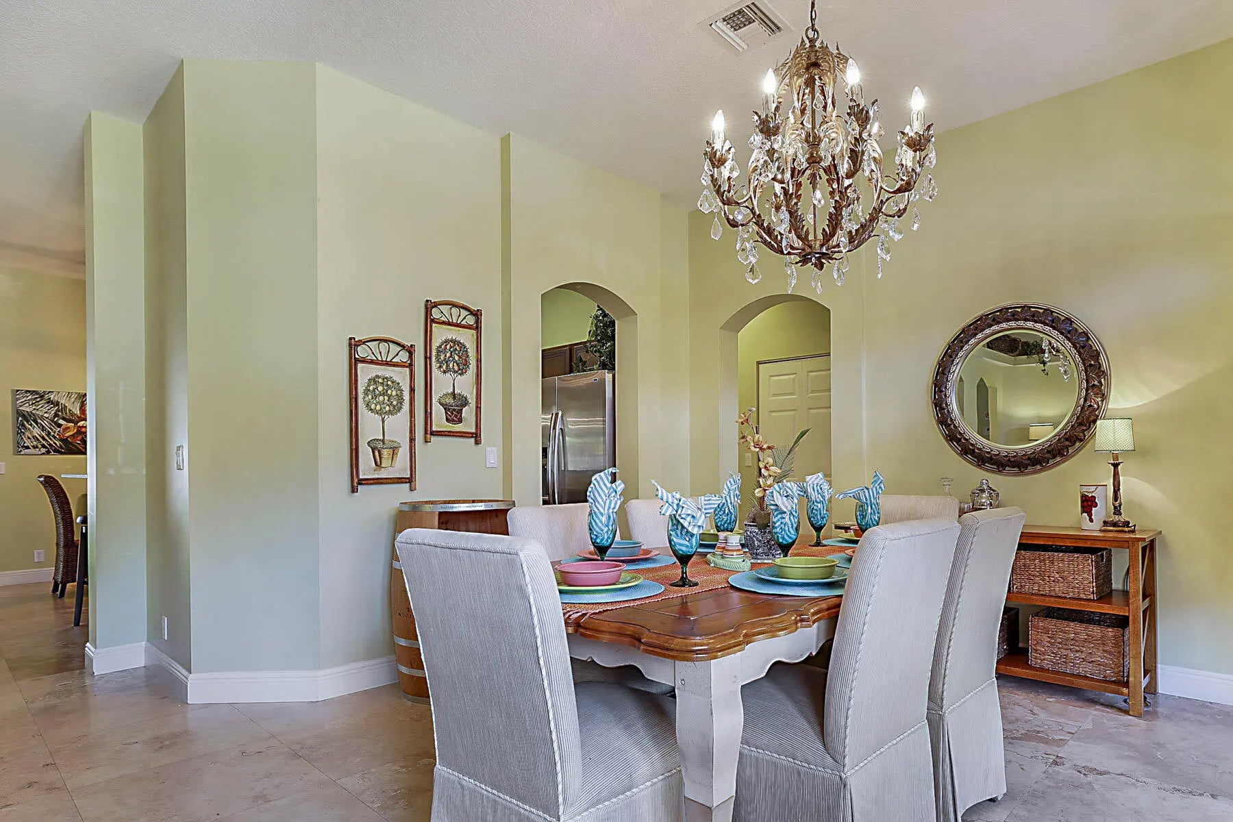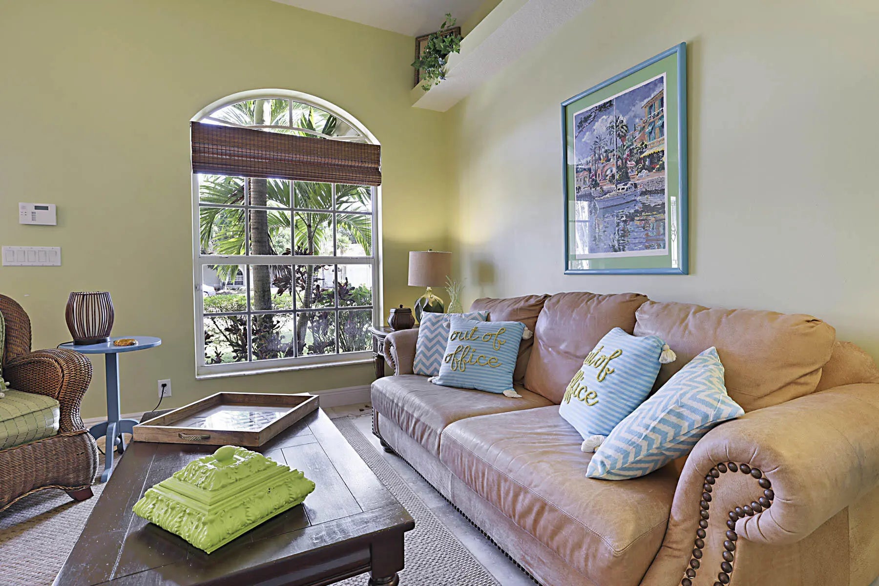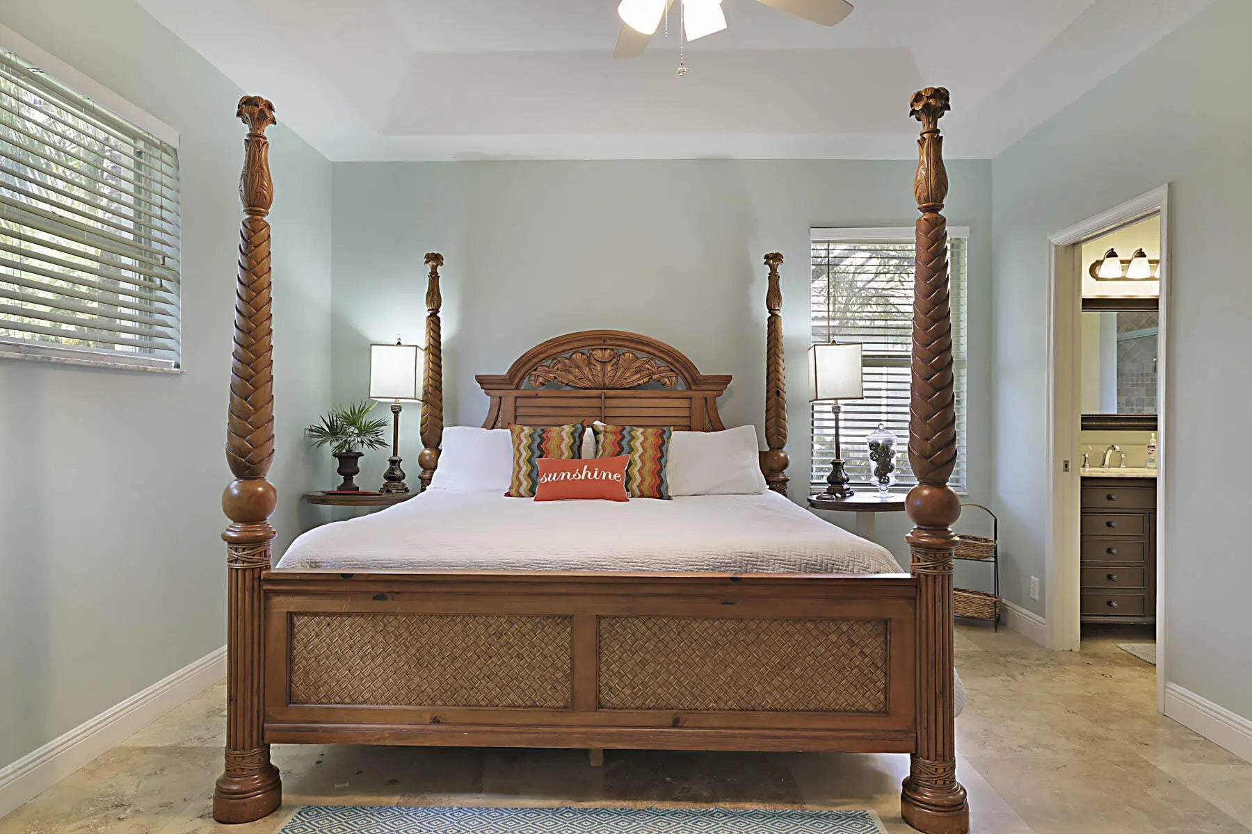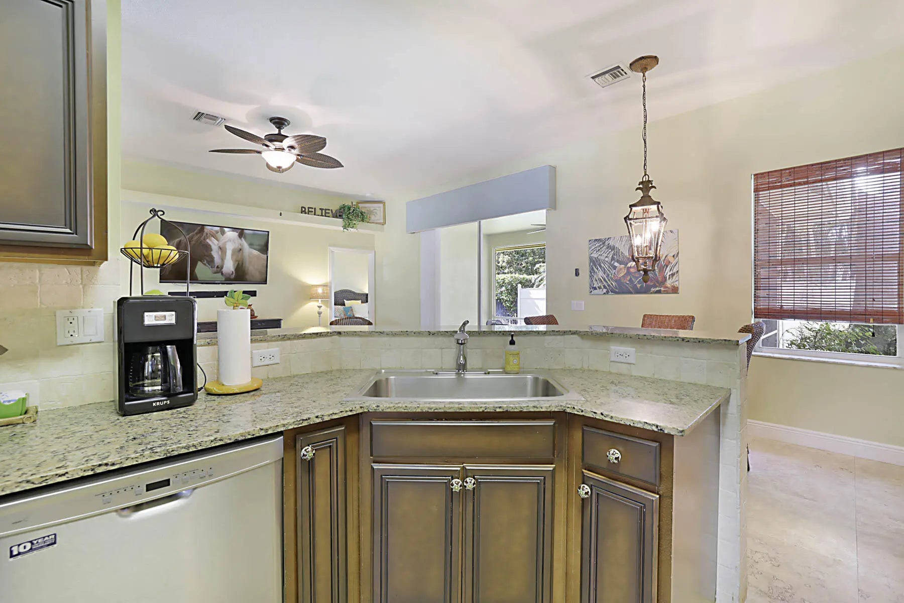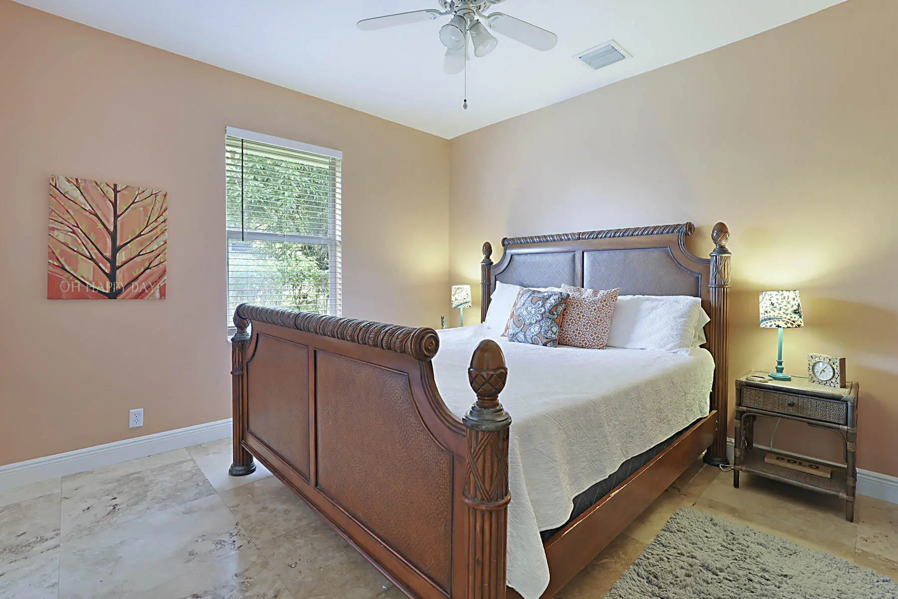 Prime location! Fully furnished 4/2/2 luxury rental located on a peaceful cul-de-sac. This beautifully appointed home features travertine flooring throughout, tumbled-stone baths, & tropical furnishings. Bedrooms are generously sized with 3 king beds & 1 queen bed, each with its own flat-screen TV. The granite kitchen offers stainless steel appliances, ample counter space, a breakfast area, & a pantry. Enjoy the private covered patio for morning coffee or evening relaxation. The primary suite includes a large walk-in closet & ensuite bath with a Jacuzzi whirlpool tub. The family room is equipped with a 60'' Smart TV and a wireless printer/scanner for guest convenience. Wi-Fi & cable TV are included, along with an allowance for water & electric. Don't miss it!