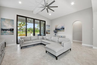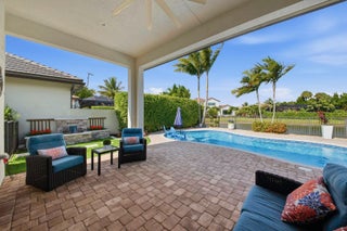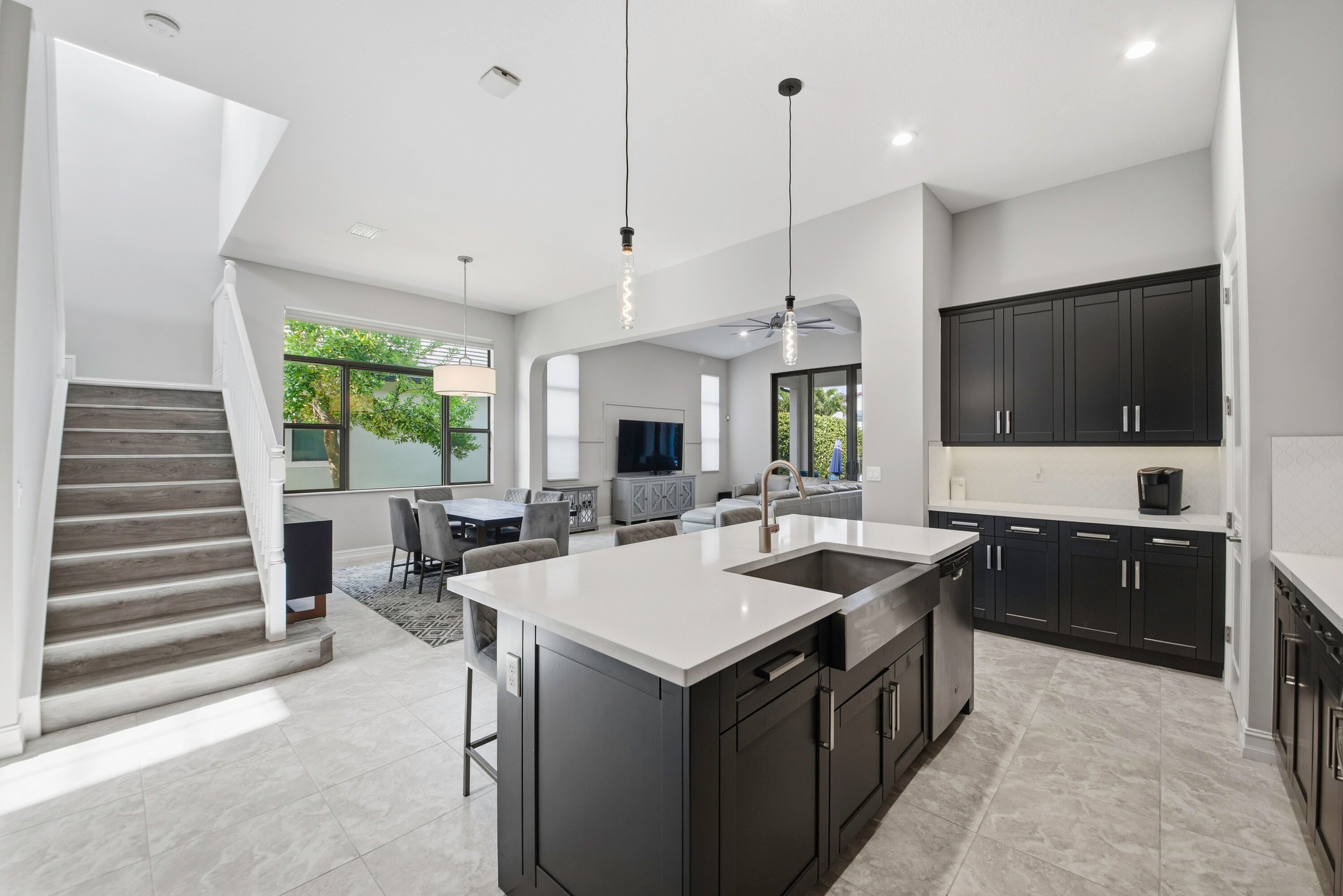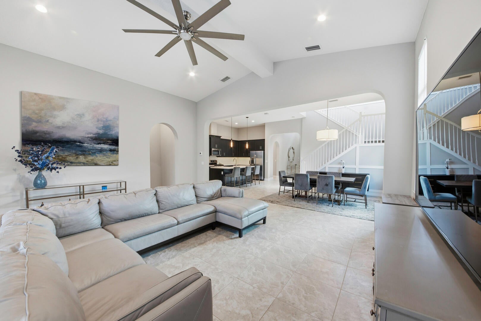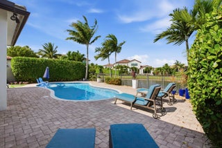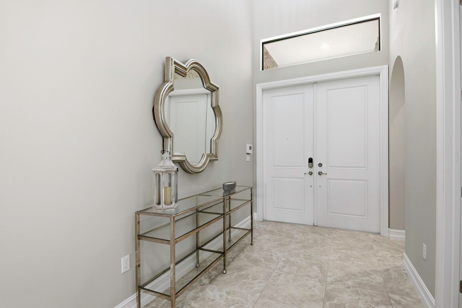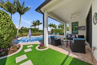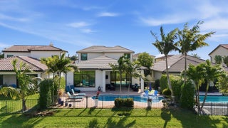 Unparalleled elegance with pool and panoramic lake views! This Provence model in Palm Meadows Estates is a stunning 4 bedroom plus den and loft, 4.5 bath home showcasing exceptional design and impressive upgrades throughout. A double-door entrance opens to an impressive two-story foyer, setting the tone for the elegant design throughout. The stunning chef's kitchen features quartz countertops, a gas stove with griddle, stainless steel farmhouse sink, stainless steel appliances, a large island with snack bar, pendant lighting, decorative tile backsplash, under-cabinet lighting, a butler's pantry area, and a walk-in pantry closet. The bright and spacious living room offers vaulted ceilings, abundant windows, and sliders to the patio.The dining area shines with a transom window, open-concept layout, and custom wall moldings, which continue throughout the home for a refined touch. The first-floor primary suite is a luxurious retreat with a double tray ceiling, high ceilings, dual closets with custom organizers, and tranquil views of the pool and lake. The spa-like primary bath includes a soaking tub, step-in shower with bench seat, large subway tile, dual quartz-topped counters, and framed mirrors. Additional features include smooth walls, impact windows, cellular shades throughout, curved arches, and a whole-house generator for peace of mind. Step outside to the covered patio overlooking a custom pool with sun shelf, water feature, fenced yard, and serene lake view perfect for relaxation or entertaining. This exceptional home combines style, comfort, and function in one breathtaking package. The resort-style Palm Meadows clubhouse is designed with every detail in mind, featuring a sparkling, oasis-inspired pool, a state-of-the-art fitness center, an indoor sports court, pickleball, and tennis. Families will love the additional amenities, including a kid's splash zone, tot lot, and more. Scroll down to view the full list of community features!