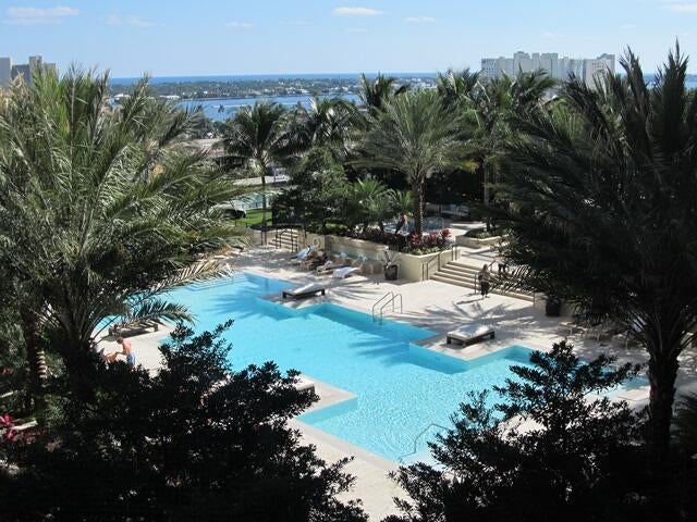 Perfect unit for full condo benefits with a private entrance! Enjoy living with 20-ft ceilings in a huge 1-bedroom apt just steps away from your assigned parking place, and with a private entrance for pets or fitness activities! Hurricane windows, pool, hot tub, sauna, gym, billiards, meeting rooms, building generator, doorman, and concierge, in walking distance of everything in downtown West Palm Beach. Perfect for full-time living, investor income, guest overflows, or protected, safe hurricane zone! Grab this fast!