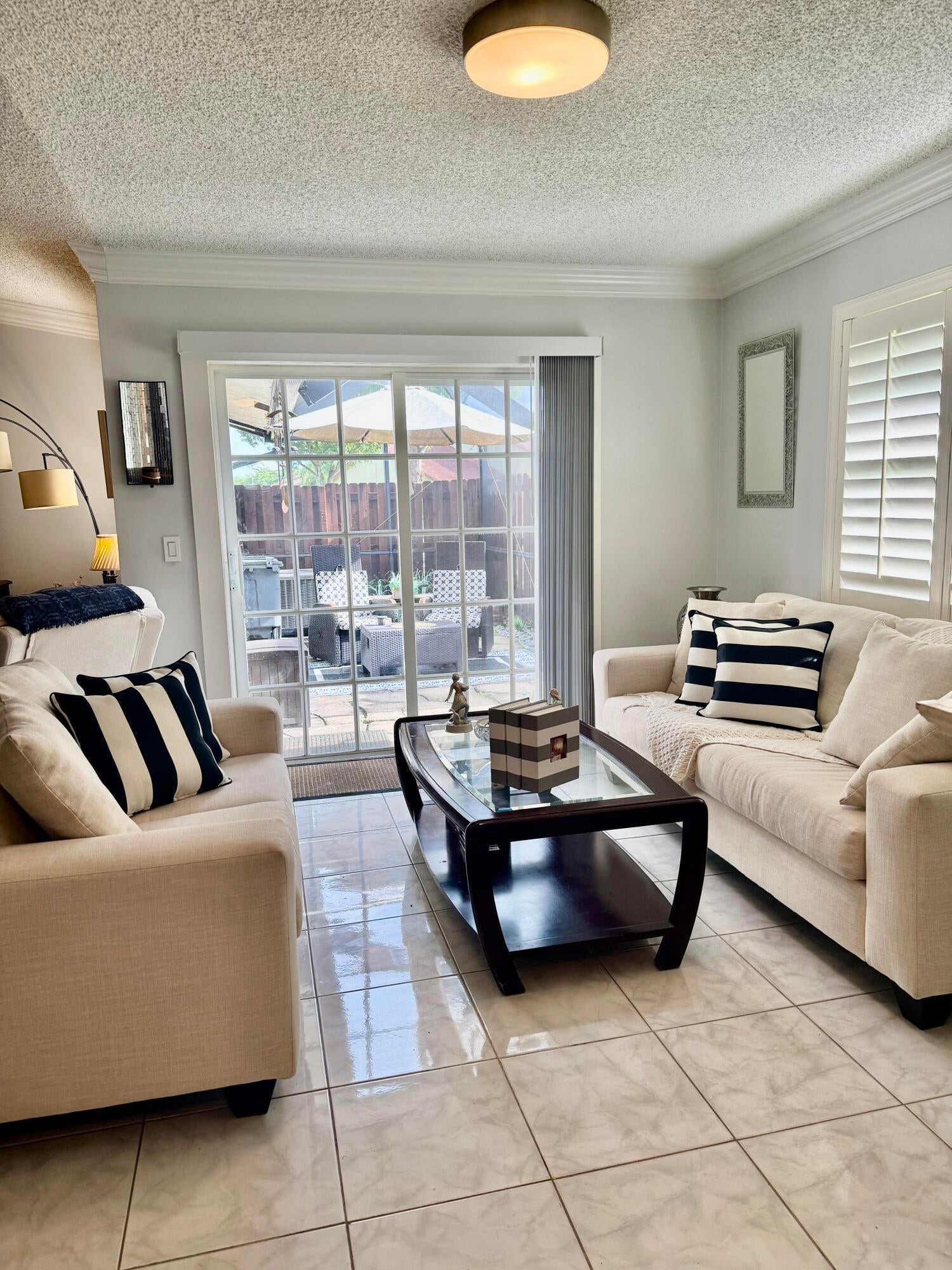 Welcome Home! This Impressive 2 bed / 2 bath single-story villa is FULLY RENOVATED and boasts modern upgrades throughout. A true open-concept design connects the living, dining, and kitchen areas beneath vaulted ceilings and features a skylight that fills the home with natural light. The beautifully designed kitchen features Stainless Steel Appliances, Wood Cabinets, tiled countertops, custom glass bar top and more.Both bathrooms have been completely remodeled. The primary suite features fully tiled walls and flooring, a designer step down walk-in shower with upgraded fixtures, and a contemporary vanity. The guest bath includes a relaxing Jacuzzi tub.Gorgeous tile flooring runs throughout the home, complemented by new sliding glass doors, white plantation shutters featured on all windows, updated wood interior doors, fresh crown molding, new baseboards, and a new electrical panel. The A/C is only two years old and regularly serviced. Outside, enjoy a private screened-in patio with newly stained 6-ft fencing, river rock accents, and designer concrete tile flooring. Additional conveniences include a large attic storage area with built-in ladder, updated flooring, and lighting. The home offers Hurricane protection with Accordion aluminum shutters for ease and peace of mind. Assigned parking is conveniently located directly in front of the home with lots of guest parking only steps away. Oakwood Lakes West, a highly desired 55+ community in the heart of Boynton Beach, offers a heated/cooled pool, clubhouse, tennis and pickleball courts, meeting room, and library. The HOA covers cable/internet, insurance, and exterior landscaping. Restaurants, shopping, medical facilities, and beaches are all just minutes away in walking distance from the community. Perfect as a full-time residence or your South Florida getawaythis beautifully updated villa is ready for its next owner. Don't miss your opportunity to see and own it!