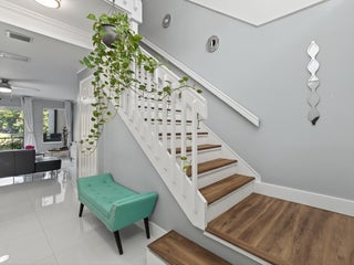Welcome home to this stunning, fully renovated 3-bedroom, 2.5-bath townhome in Boca Pines at Verde Trail, one of Boca Raton's most desirable and centrally located communities. Enjoy tranquil lake views and a serene waterfront setting in a neighborhood known for its peaceful charm and unbeatable location.Zoned for A-rated schools and within walking distance to Verde Elementary, this home is also just minutes from shopping, dining, Mizner Park, the beach, and major highways, offering the best of the South Florida lifestyle. Step inside to an open-concept floor plan filled with natural light, stylish upgrades, and modern finishes that create a warm and inviting atmosphere.Recent updates include stainless steel appliances, granite countertops, an in-unit washer and dryer, and hurricane-impact windows and doors. The first floor features elegant 2' × 2' tile, while the staircase and second floor are finished with durable, luxury vinyl plank (LVP) flooring (no carpet anywhere). Every bathroom has been tastefully refreshed with high-quality finishes. Additional highlights include new solid closet and pantry doors, upgraded light fixtures, and refined crown molding with custom baseboards that add a touch of sophistication throughout. The home offers abundant storage with multiple closets, an extra-wide pantry, and additional space under the staircase. The bedrooms are generously sized, and the expansive primary suite provides a true retreat with room for large furniture and a calm, comfortable ambiance. Step outside to a spacious screened-in porch, the perfect spot to enjoy peaceful lake views, gentle breezes, and plenty of natural light all day long. Boca Pines is a beautifully maintained community featuring a sparkling pool and lush landscaping, ideal for relaxing or connecting with neighbors. The association fee includes all common areas, lawn care, exterior maintenance, and roof maintenance. The roof, replaced in 2021, is covered under the association for added peace of mind. Don't miss this rare opportunity to own a beautifully renovated lakefront home in the heart of Boca Raton! Schedule your private showing today!