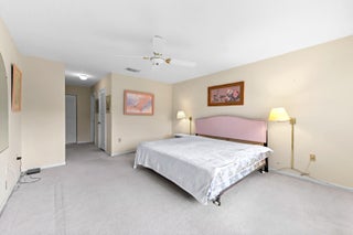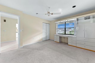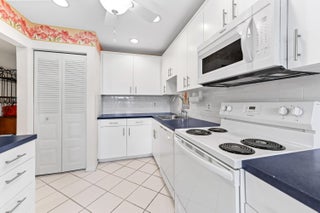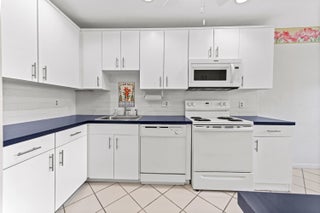 Prepare to be energized and inspired by this truly unique and expressive condo, where vibrant artistic design meets functionality in a fantastic community. The exterior boasts a classic Florida aesthetic roof and a covered entry. Inside, the home is a celebration of color, defined by vivid bright walls and clean white tile flooring throughout the main level, creating an unforgettable atmosphere.The kitchen is a bright and efficient galley style, featuring pristine white shaker-style cabinets, a white subway tile backsplash, and contrasting dark blue countertops. It is fully equipped with appliances and includes a delightful breakfast nook illuminated by a pendant light. The home also features a bold, custom-designed bathroom with a modern countertop, and a walk-in shower/tub combo. The private quarters make an equally striking statement. The bedrooms are spacious, with the master suite featuring vibrant turquoise walls and dramatic red carpeting, with a ceiling fan for comfort. The home offers a blend of style and substance, including a fantastic screened balcony that serves as a private outdoor retreat. This property is a truly unique sanctuary for the discerning buyer who values expressive design.