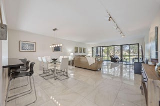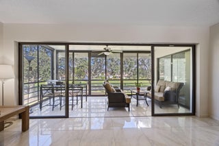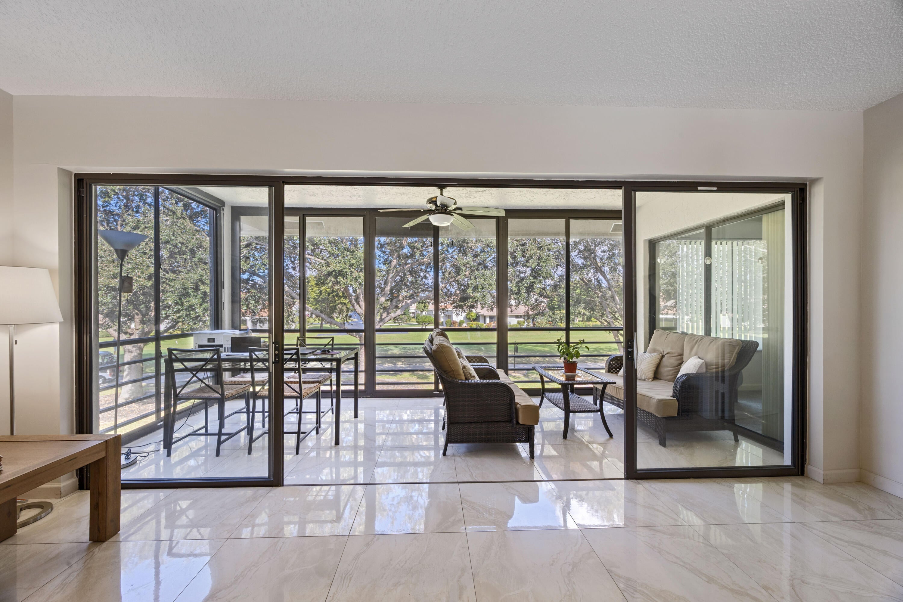 Beautifully renovated and spacious 2 bedroom, 2 bath condo overlooking the golf course. Completely renovated eat-in kitchen with new cabinetry, granite countertop, pantry, built-in desk and enlarged pass-through to the dining-room. Gorgeous updated bathrooms. Large porcelain tile everywhere, Hurricane Impact windows, all newer appliances, AC (2022), water heater (2024) and new electric panel. To ensure complete privacy, Quiet Rock soundproofing panels have been added to all the walls shared with neighbors. The oversized screened Florida room is equipped with panel sliders for year-round enjoyment. Large storage room off the front porch. Sold furnished and ready to move-in! Indian Spring is a 55+ gated community where golf and tennis memberships are available but not mandatory