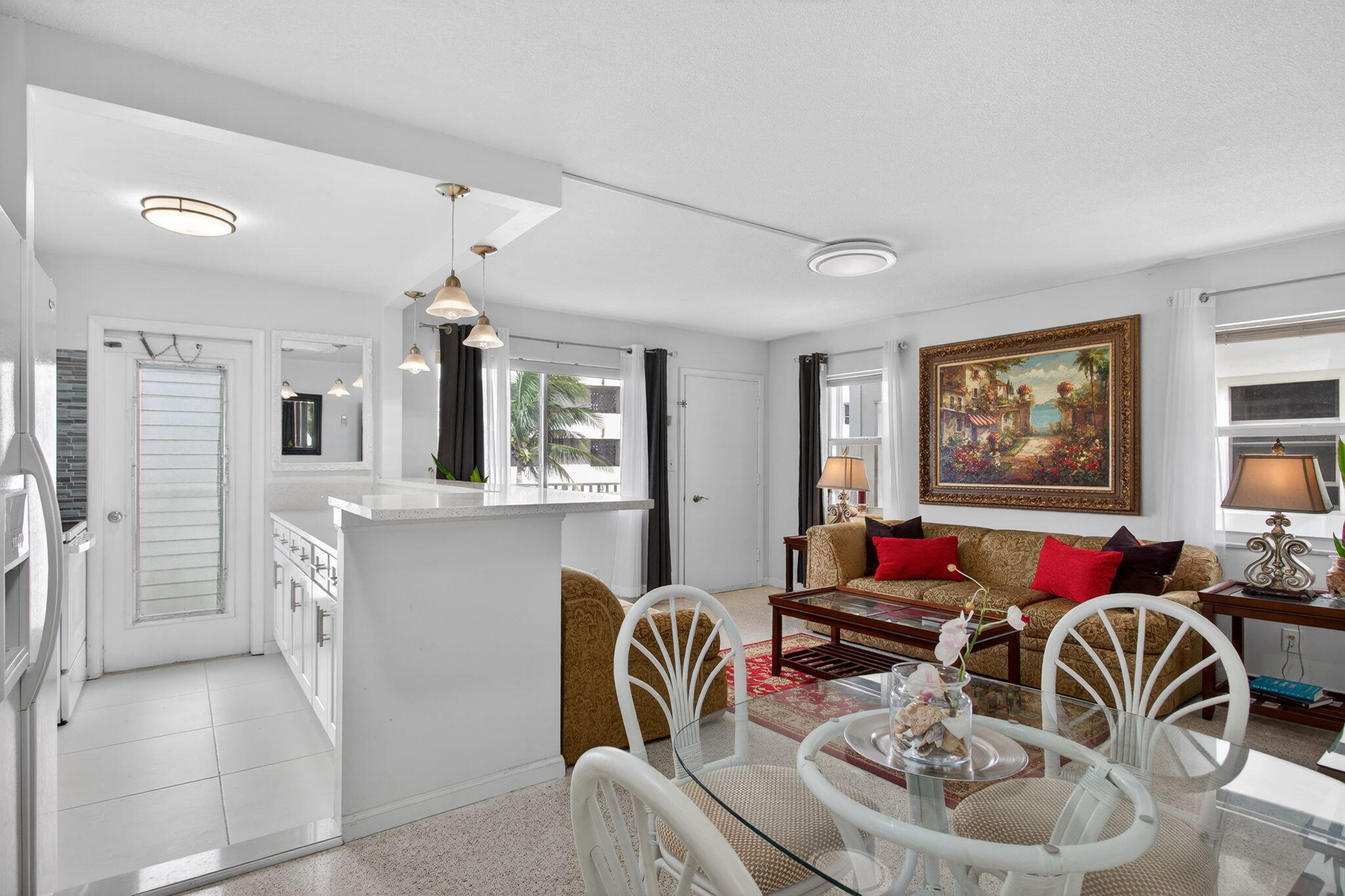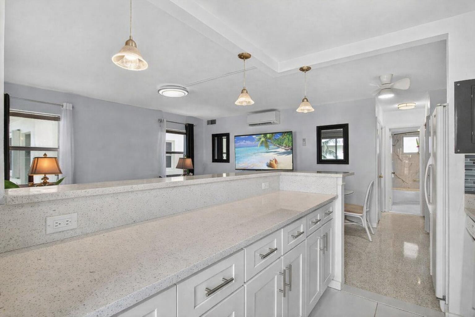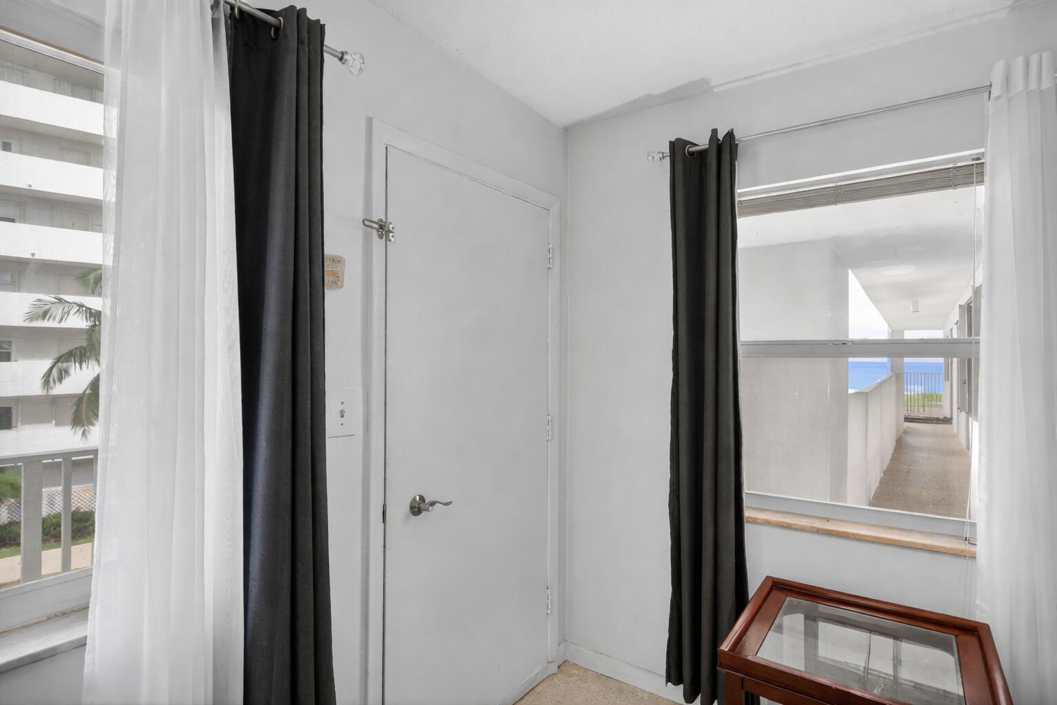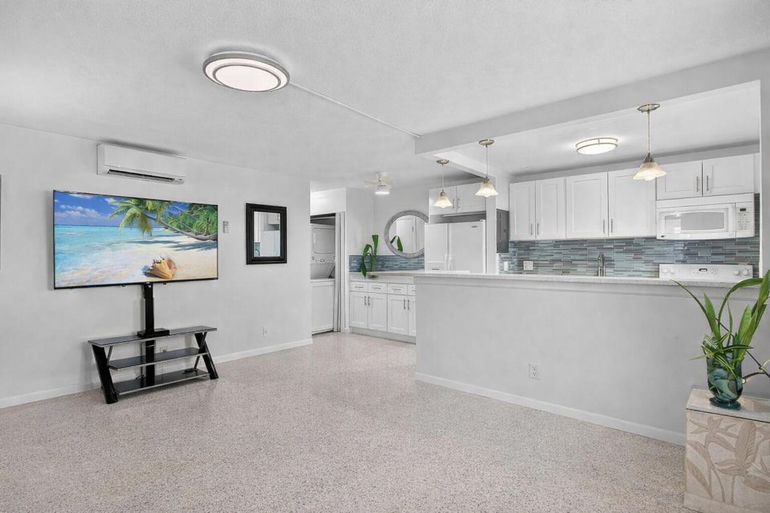 Discover your perfect beachside getaway in the building closest to the ocean! This bright and inviting 1-bedroom, 1-bathroom condo offers beautiful ocean views from both the bedroom and the private porch, allowing you to enjoy coastal living every day. Inside, you'll find an open-concept kitchen with a spacious island, perfect for cooking, dining, and entertaining. The remodeled bathroom features modern finishes, and the unit includes a full-size washer and dryer for added convenience--an incredible perk this close to the beach. The bedroom is generously sized with plenty of natural light and relaxing water views. Move-in ready and steps from the sand. Enjoy extra security and storm protection with accordion shutters installed on the back patio and 3 windows.