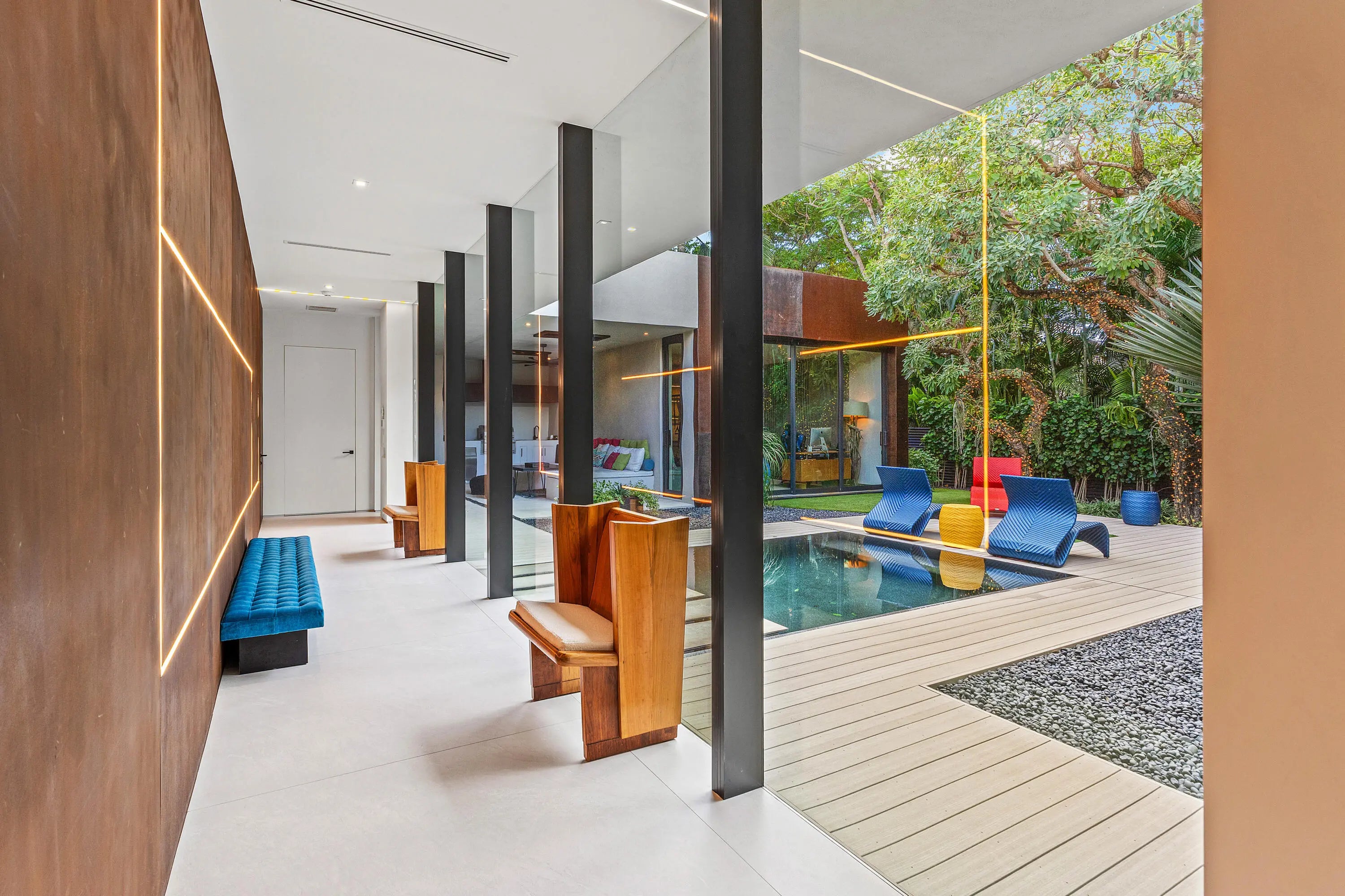 An Architectural marvel, designed by Richard Jones, custom blt in 2020. Experience contemporary elegance in a distinctly tailored setting. This residence seamlessly integrates modern design with opulent comforts, situated in the heart of Delray Beach, adjacent to Pineapple Grove. Featuring 4 BR 4.5 BA, this unique property goes beyond mere aesthetics; the attention to detail & high quality craftmanship is unequaled. Control4 Technology, floating drywall & trim less interior doors, Wolf & Sub Zero appliances, floor to ceiling glass & porcelain flooring throughout are just a few of the highlights in this thoughtful contemporary courtyard residence. A serene-zen inspired pool sanctuary is in view from all corners, including the private casita suite & the lounge loggia space. Super special!