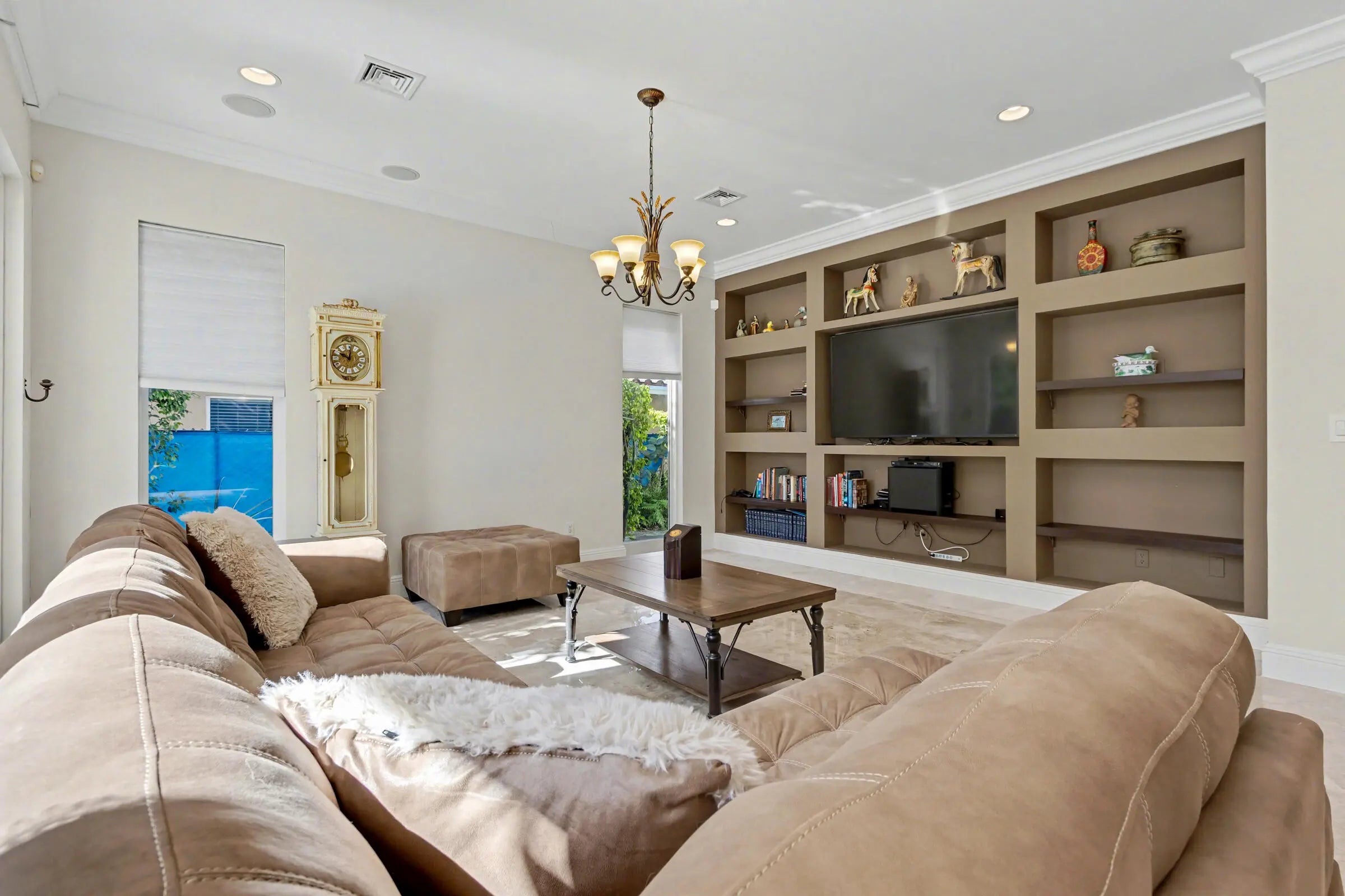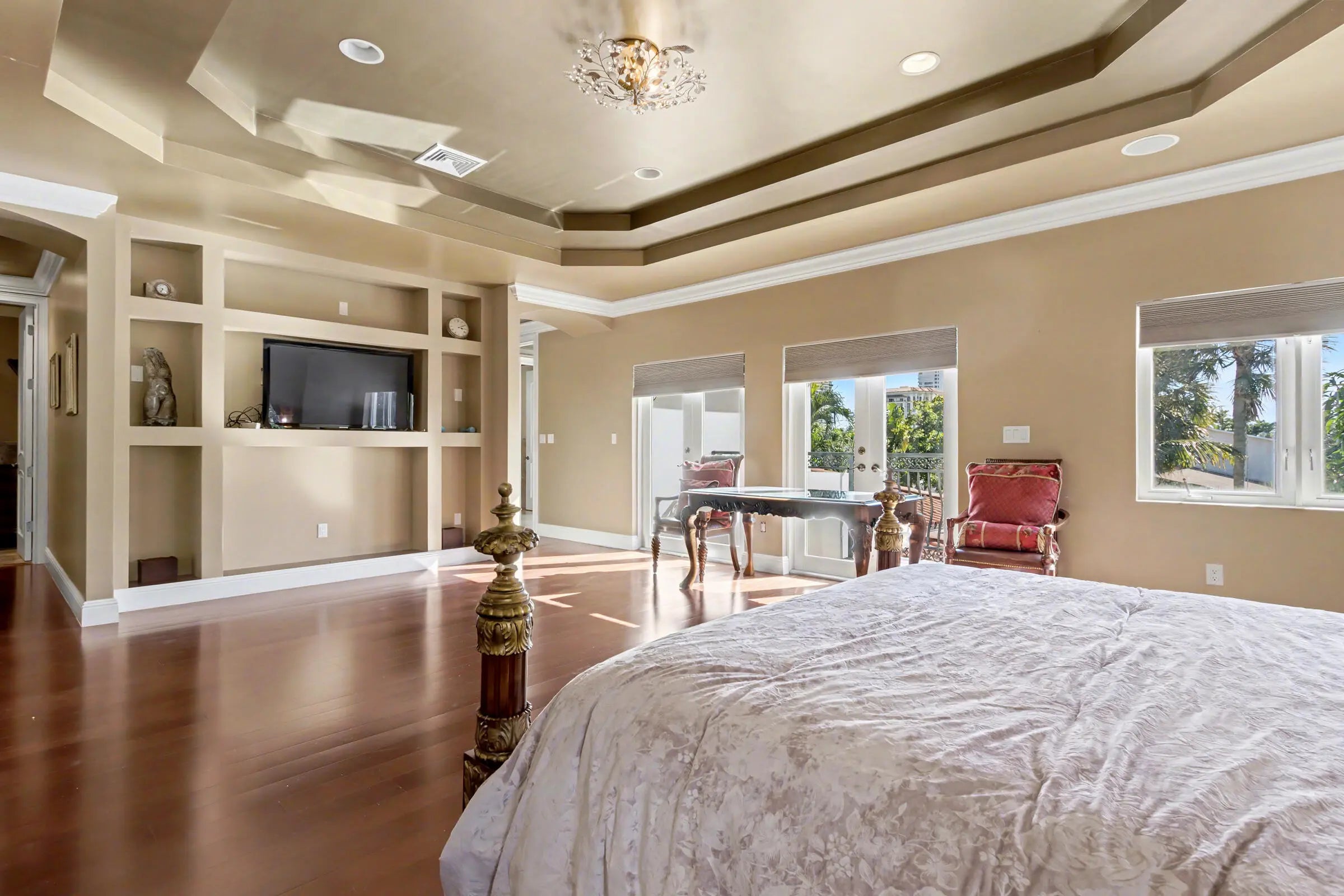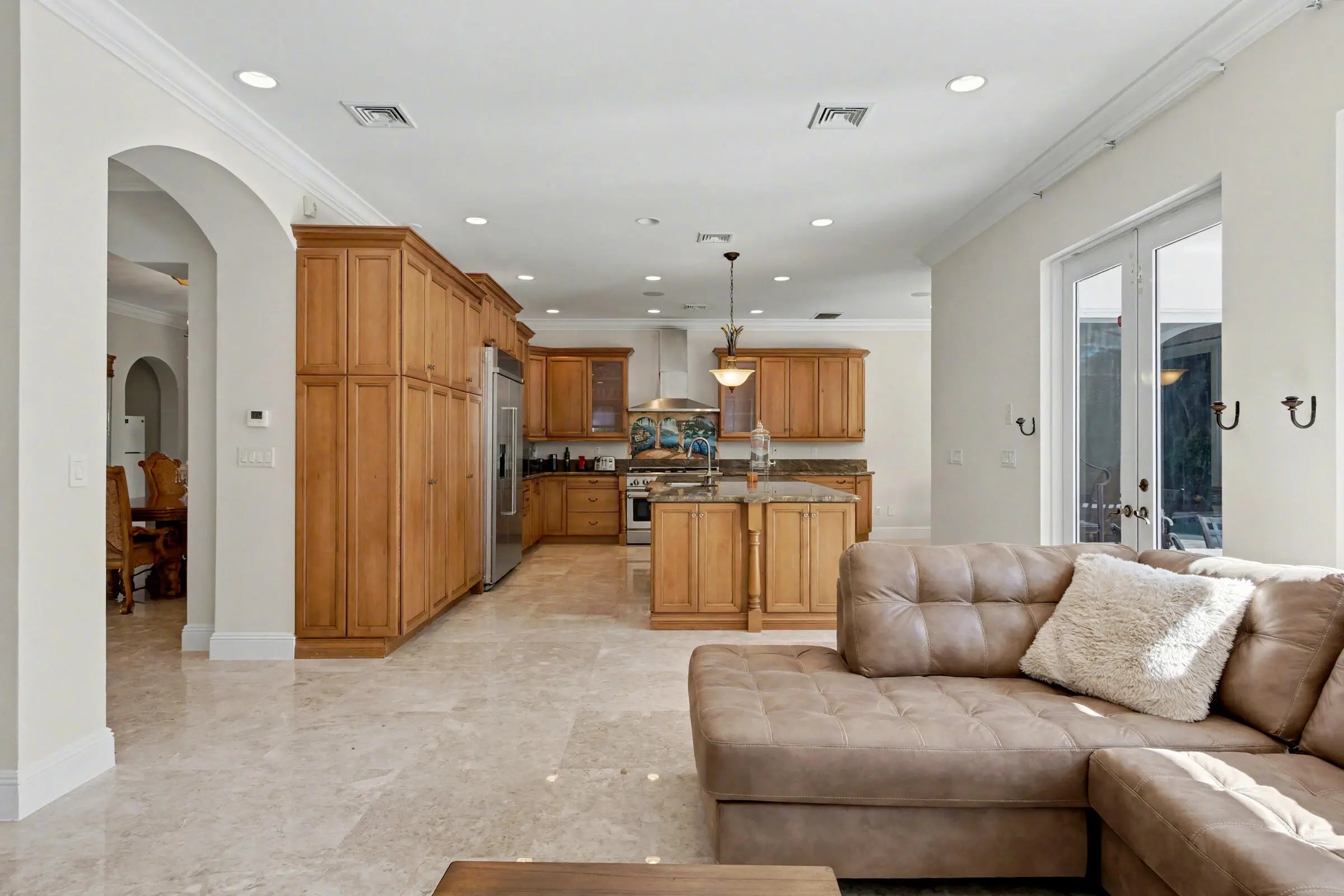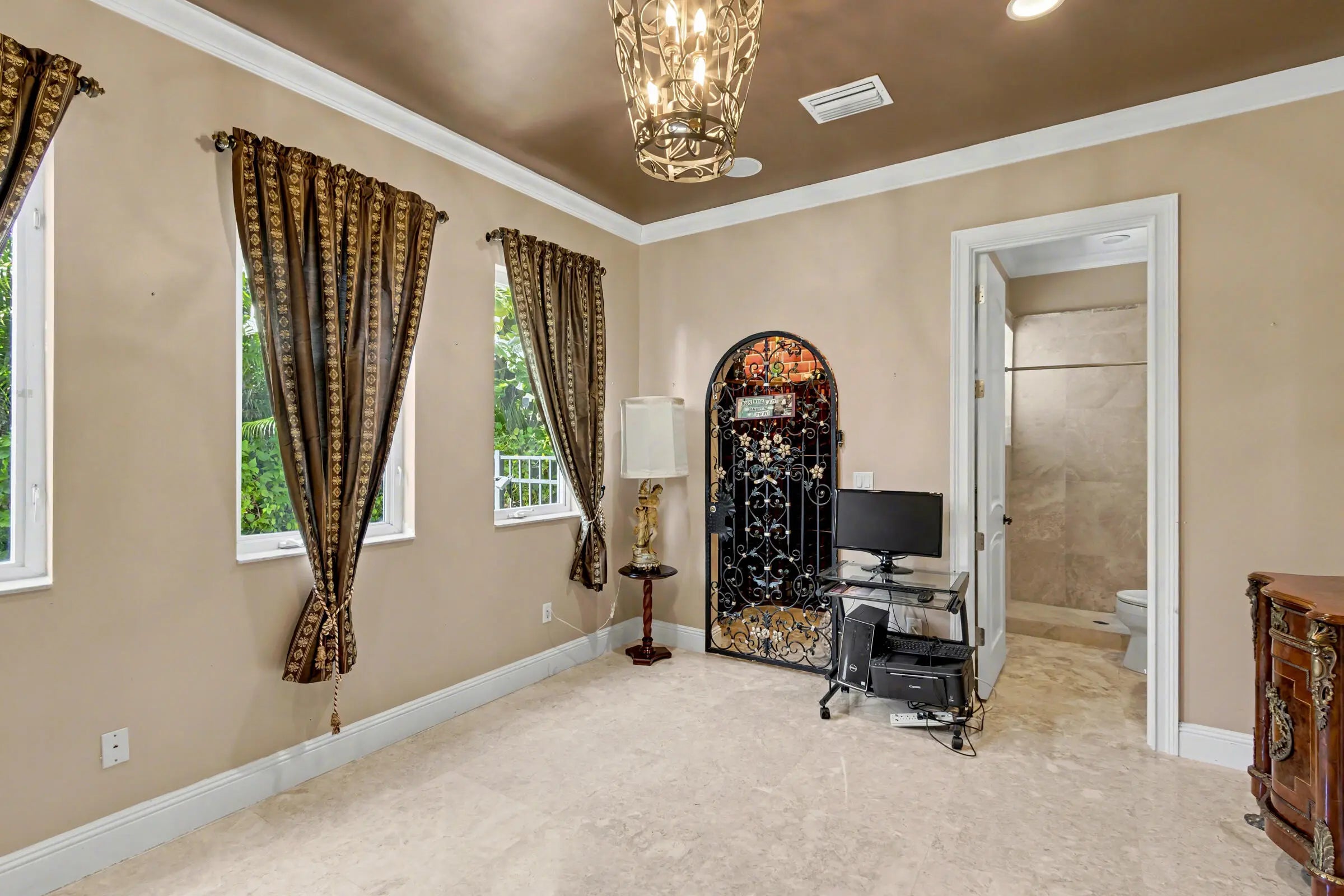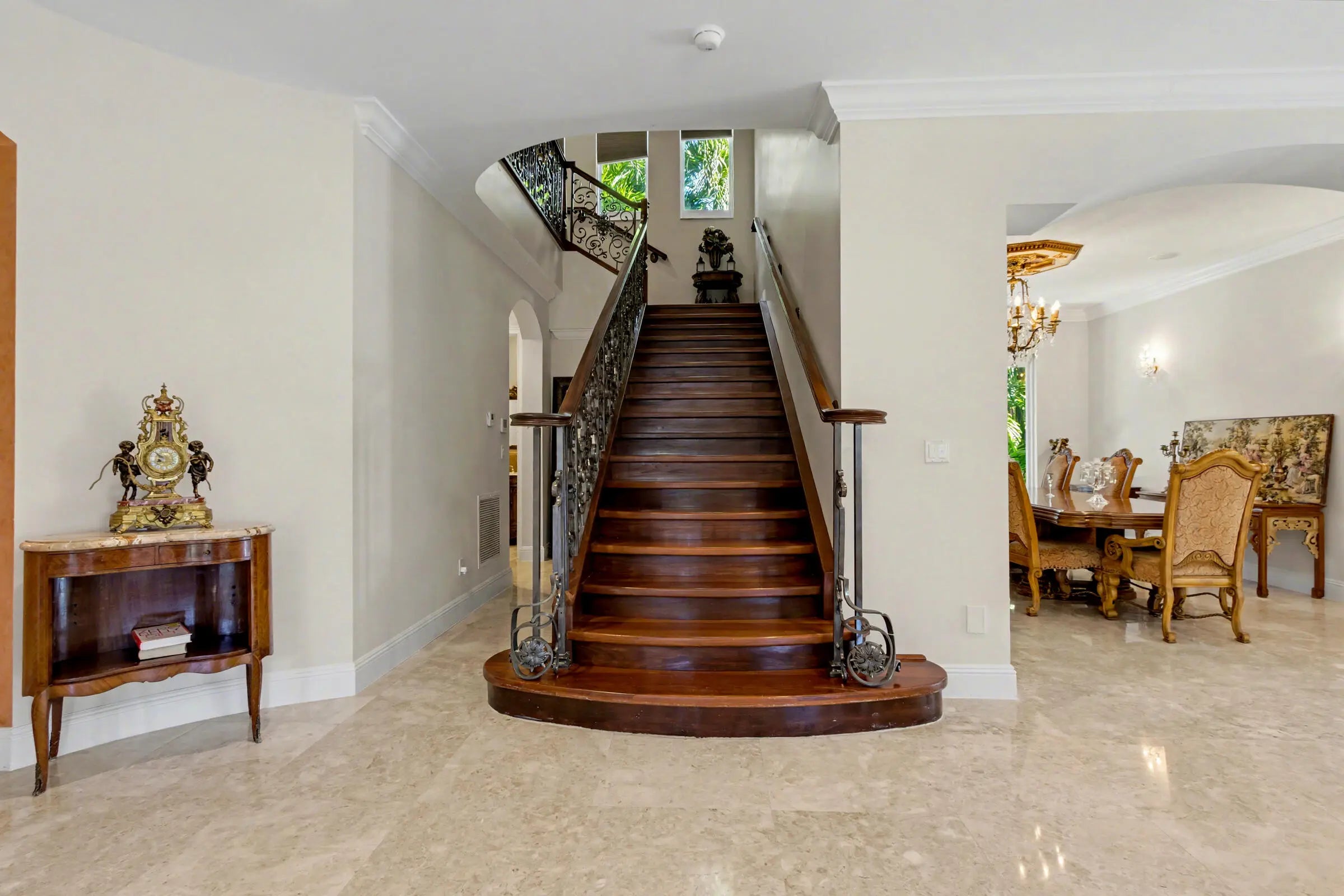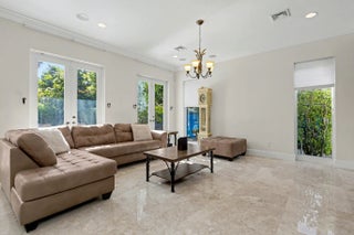 Wonderful Italian villa style home located one block from the Boca beach pavillion and intra-coastal water way. Two minutes away from 9 hole ocean view golf course. This elegant 5-bedroom plus den,6.5-bath residence offers refined luxury living with timeless architectural details and generous living spaces throughout. A grand entry foyer with sweeping staircase sets a dramatic first impression, leading into beautifully appointed formal living and dining rooms accented by marble flooring, custom chandeliers, and intricate ceiling details. The expansive gourmet kitchen features rich wood cabinetry, stone countertops, a large center island, and premium appliances, seamlessly opening to inviting family and entertaining areas.