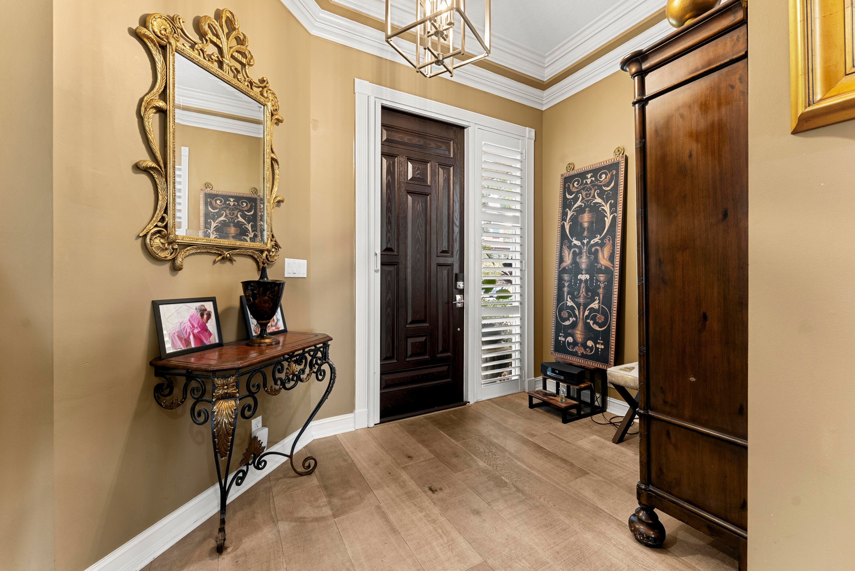 Amazing intra coastal view! Set inside a pet-friendly, 24-hour guard-gated community this residence captures tranquil lake and Intracoastal views and layers them with thoughtful luxury. Professionally landscaped grounds, a paved drive, and a motorized screened porch set the tone. Inside, 10-ft ceilings and wood floors frame an open plan anchored by a chef's kitchen--quartzite counters, stone accent walls, induction range, and abundant storage. A custom bar with wine fridge makes entertaining effortless. With ~2,900 sq ft, the home offers 3 bedrooms, an upstairs laundry, and a large closet pre-planned for an elevator. The primary suite is a true retreat with his-and-hers bathrooms, a private balcony, and a secondary patio for morning coffee or sunset views.