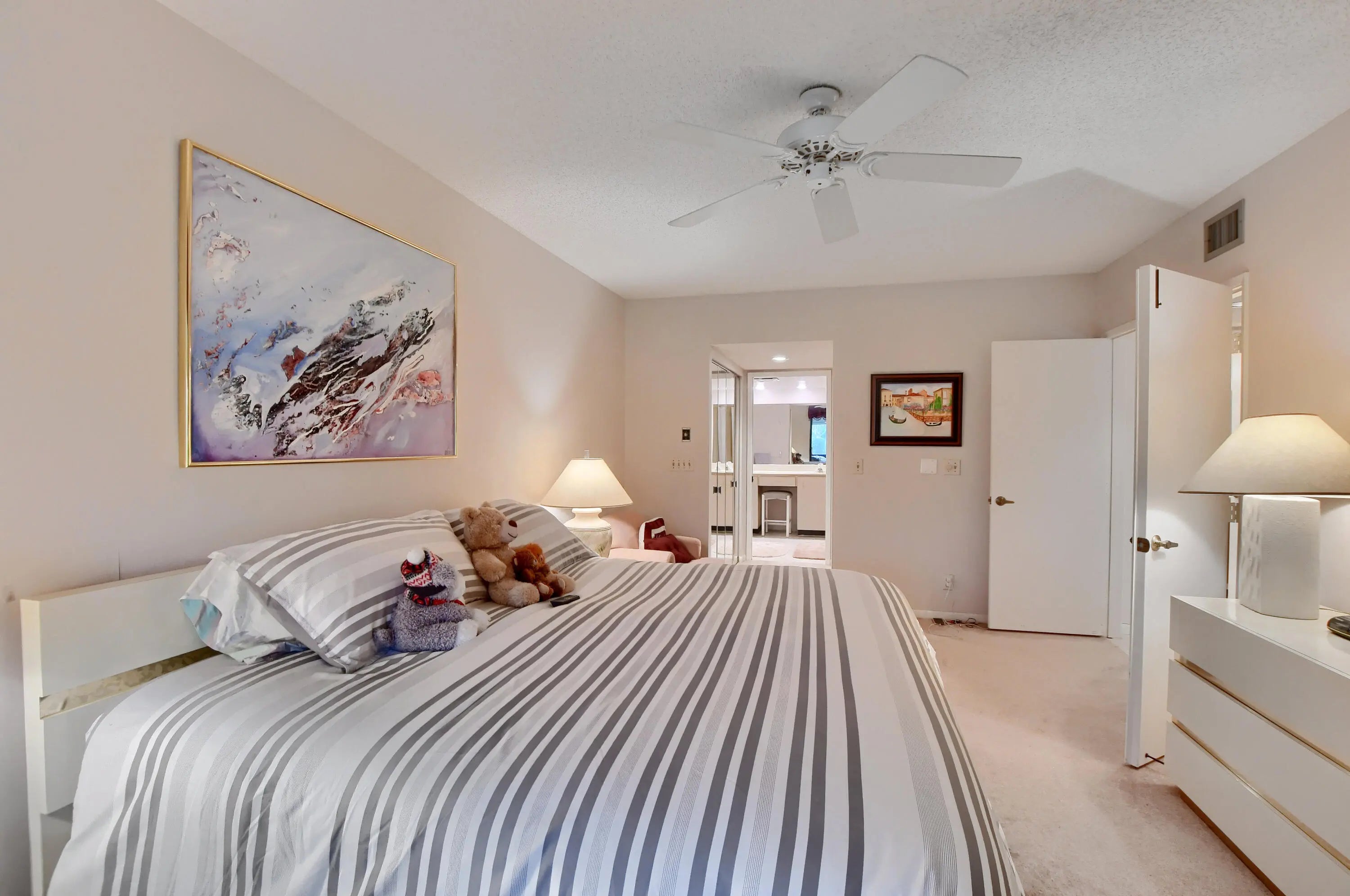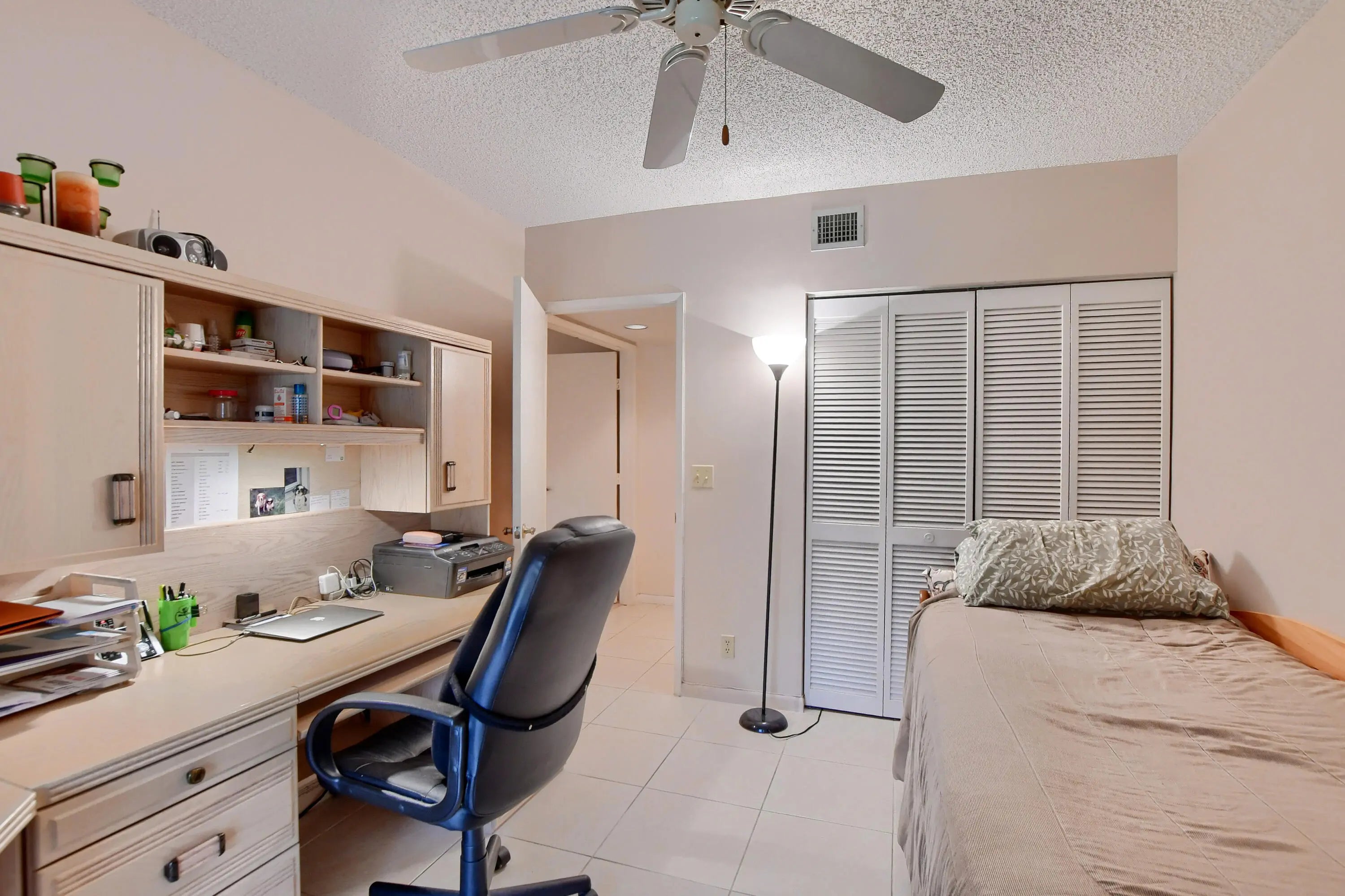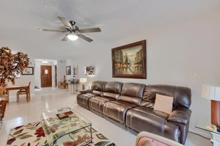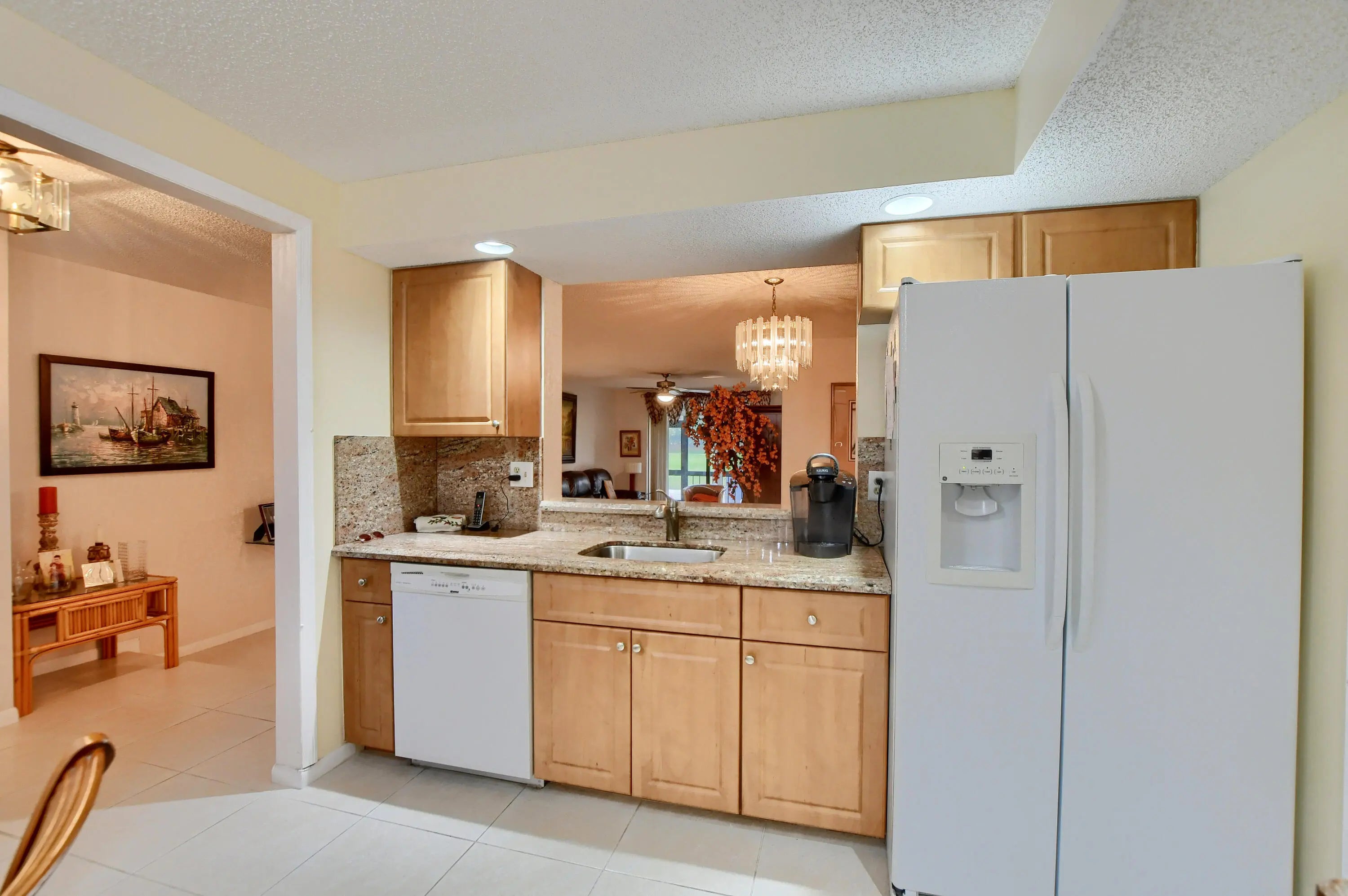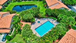 First floor 2 bed, 2 bath condo with 1-car garage in popular La Mirada at Boca Pointe. Updated kitchen features granite counters, newer cabinets, and white appliances. Spacious living and formal dining rooms. Enclosed long patio with pull-down shutters and outdoor pavers. Enjoy pretty golf views from the patio and bedrooms. Master bedroom with large shower/tub. Neutral tile floors in living areas, newer carpet in the master. Second bath updated with a new shower. Washer and dryer replaced. Kitchen and 2nd bath recently repainted. Existing furniture included. Conveniently close to the community pool.