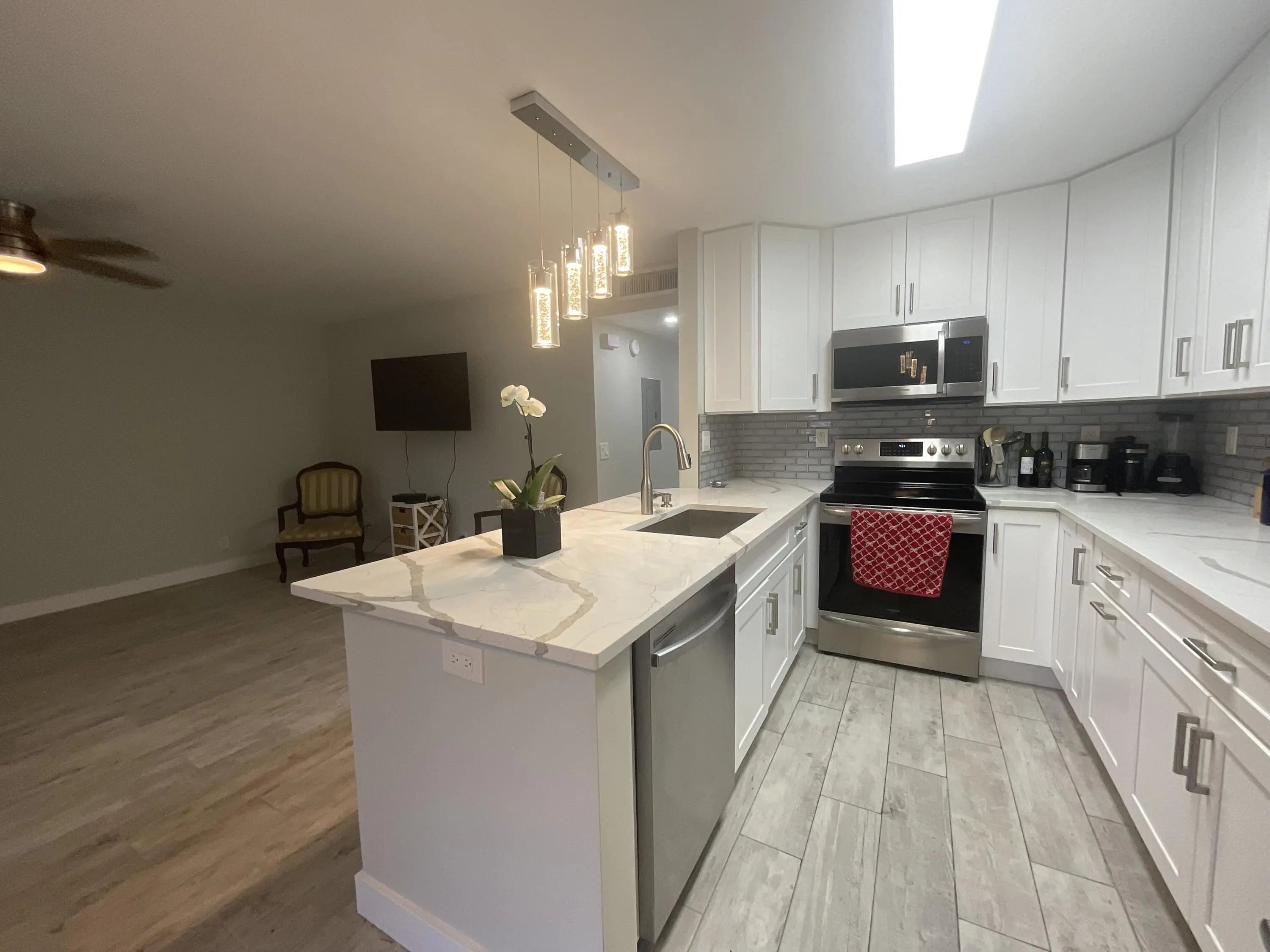 Best location three miles to the beach and surrounded by stores, nearby Delray Hospital and medical, FIRST FLOOR CORNER unit CBS construction -Hurricane glass protection. Totally renovated opened kitchen floor plan 2 bed 2 bath-ensuite bathroom, private washer and dryer, porcelain floors, quartz counter top, remodeled bathrooms, covered patio, Enjoy the lifestyle you deserve in this vibrant active adult community with 24-hour manned security. Features include two 18-hole golf courses by Robert Trent Jones, Sr., indoor and outdoor pools, and a recently renovated clubhouse with fitness center, theater, bistro, and extensive recreational amenities. Resident shuttle service available. Resort-style living at its finest.